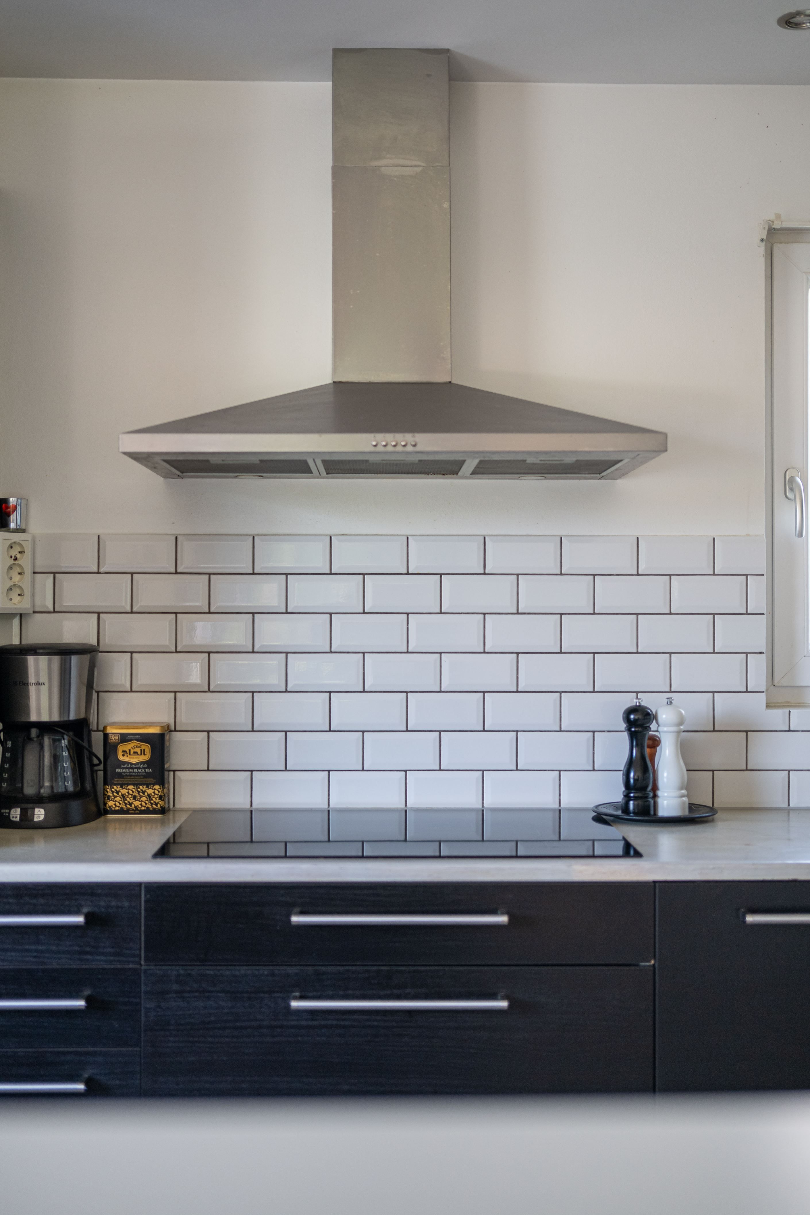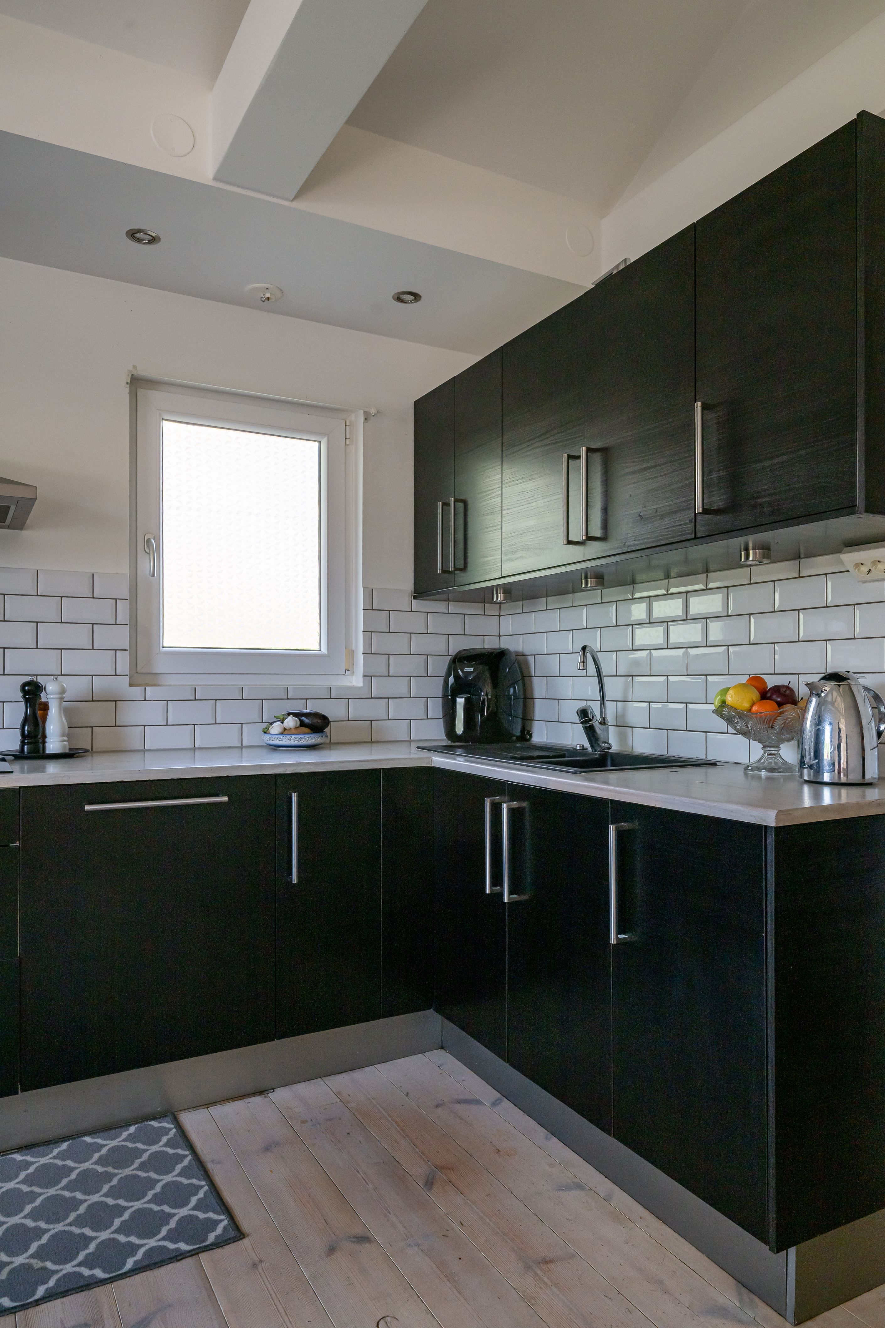 Stort kök med köksö och matplats för många. Köket har svarta skåpluckor, kyl och frys i fullhöjd, spishäll, inbyggd ugn och micro samt en integrerad diskmaskin.
