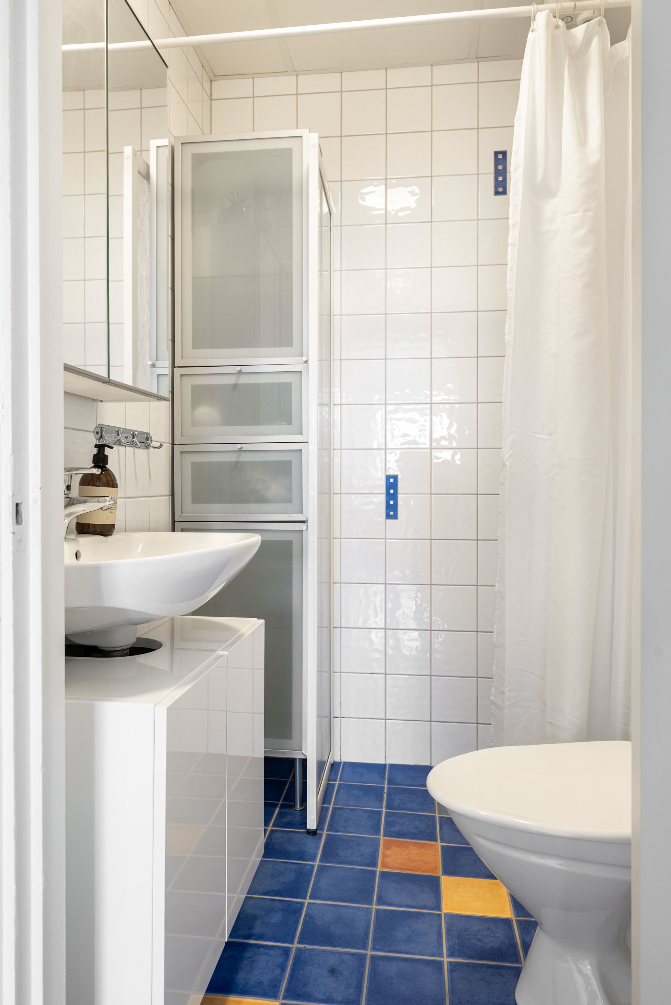 Sovrummet går i en mörk skogsgrön nyans som skapar ett lugn – en inbjudande plats att dra sig tillbaka till. Här finns också gott om förvaring, dolt bakom stilrena garderober. Det helkaklade duschrummet/WC håller fin standard och är både stilrent och fräscht. Lägenheten är genomgående välplanerad med en tydlig känsla för kvalitet och estetik. Inget har lämnats åt slumpen.
