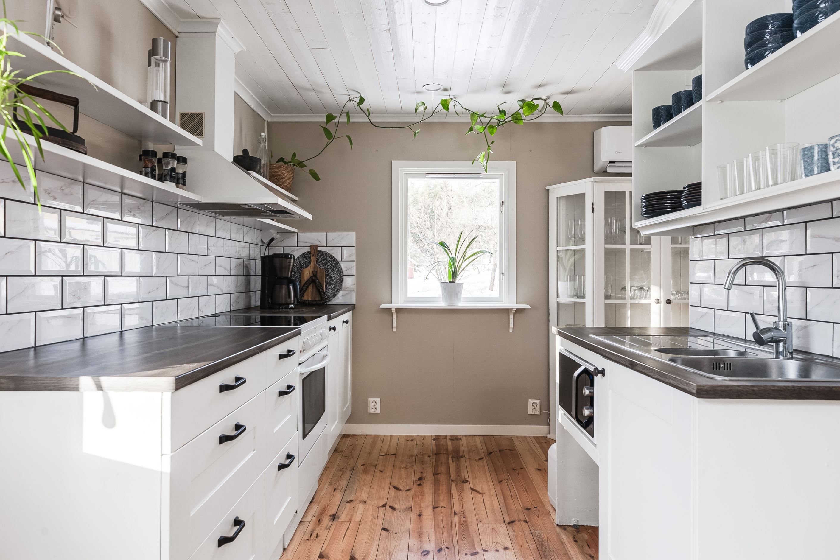 Vidare når du köket som är rymligt och har plats för ett stort matbord där familj/ vänner kan samlas för trevliga middagar i värmen av braskaminen strax intill matsalsdelen. I direkt anslutning till köket nås direkt utgång till stor altan med ett högt och fint solläge!