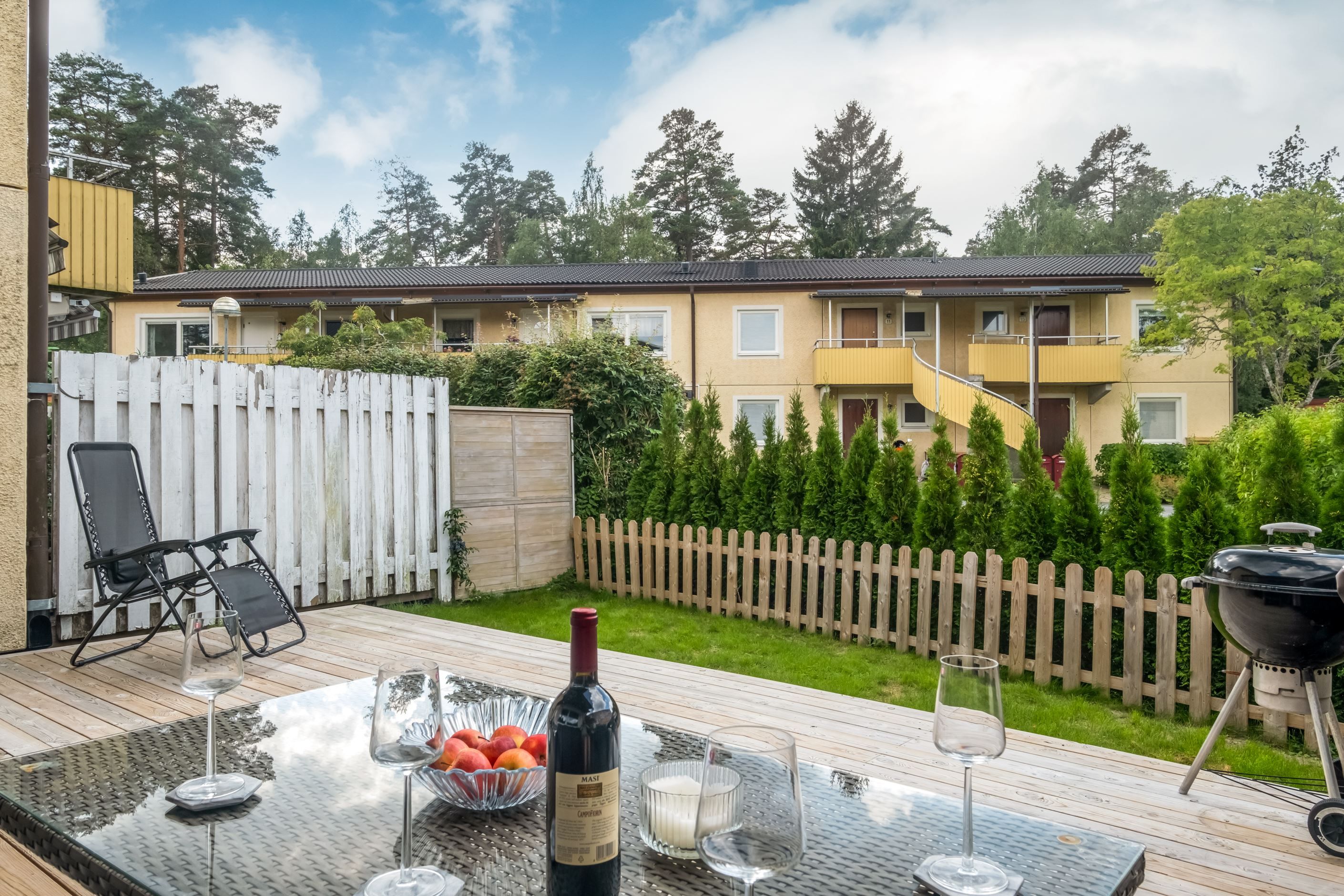 Drömmer du också om livet som radhusägare, men känner dig inte riktigt redo att ta det stora klivet? Då är det här verkligen rätt boende för dig! Här får du det bästa av två världar - enplansradhus med uteplatser på både fram- och baksida, men utan allt ansvar som tillkommer med friköpt hus. Här bor du tryggt i en stabil bostadsrättsförening. På framsidan möts du av en stor nybyggd trädäckad altan med plats för loungegrupp. På den soldränkta baksidan finns en nybyggd trädäckad altan, insynsskyddad av Tujahäckar som omringar baksidan, tillsammans med ett staket. Här har du sol från morgon till sen kväll, riktigt bra sydvästläge. Här finns en nyinstallerad motordriven markis för dom allra hetaste sommardagarna. Här finns också en lagom stor gräsplätt för hunden eller barnen, och plats för odling för den med gröna fingrar.