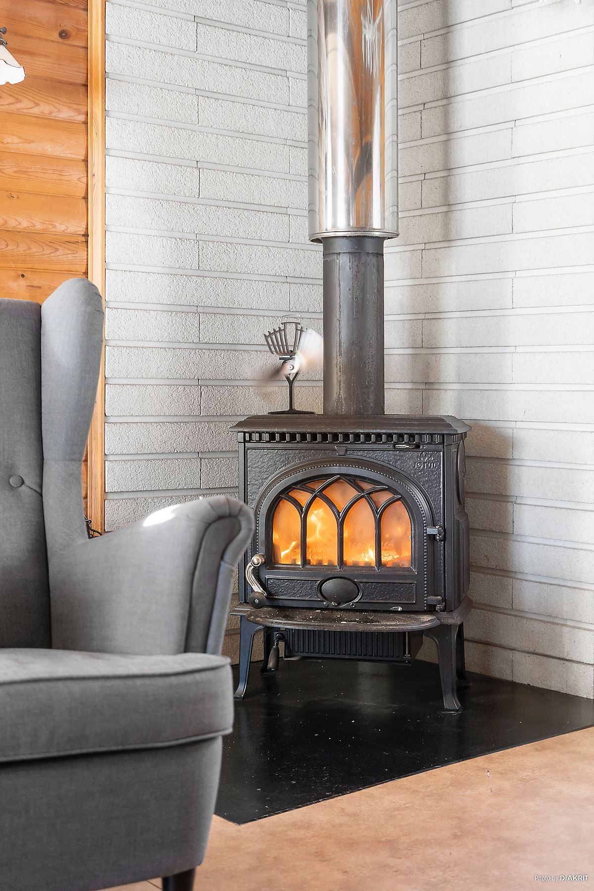 Huvudstugan, om ca 44 kvm, bjuder på ett kök utrustat med alla nödvändigheter och erbjuder gott om förvaring. Från köket öppnar sig det rymliga allrummet med en braskamin och stora fönster med en fin utsikt.
