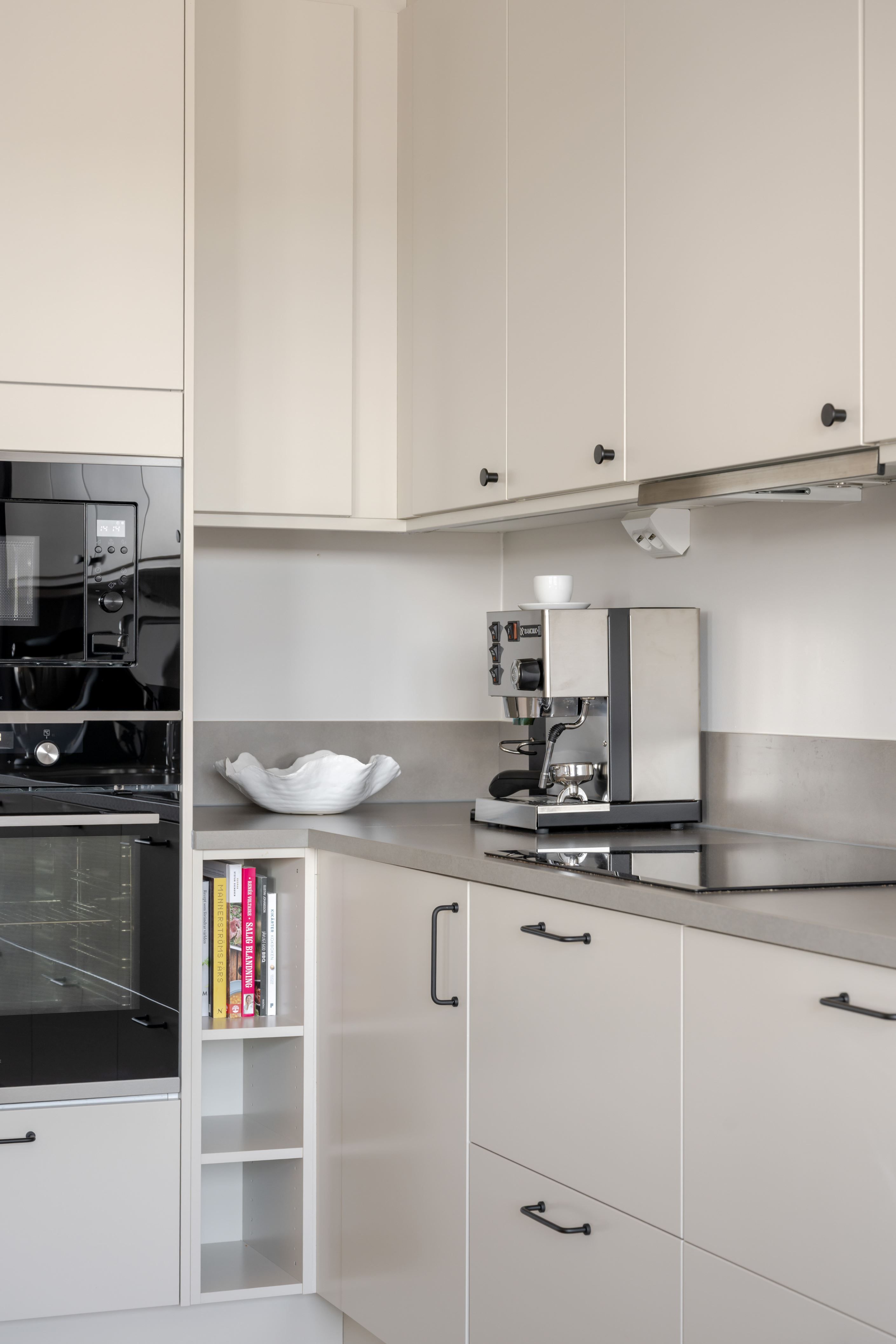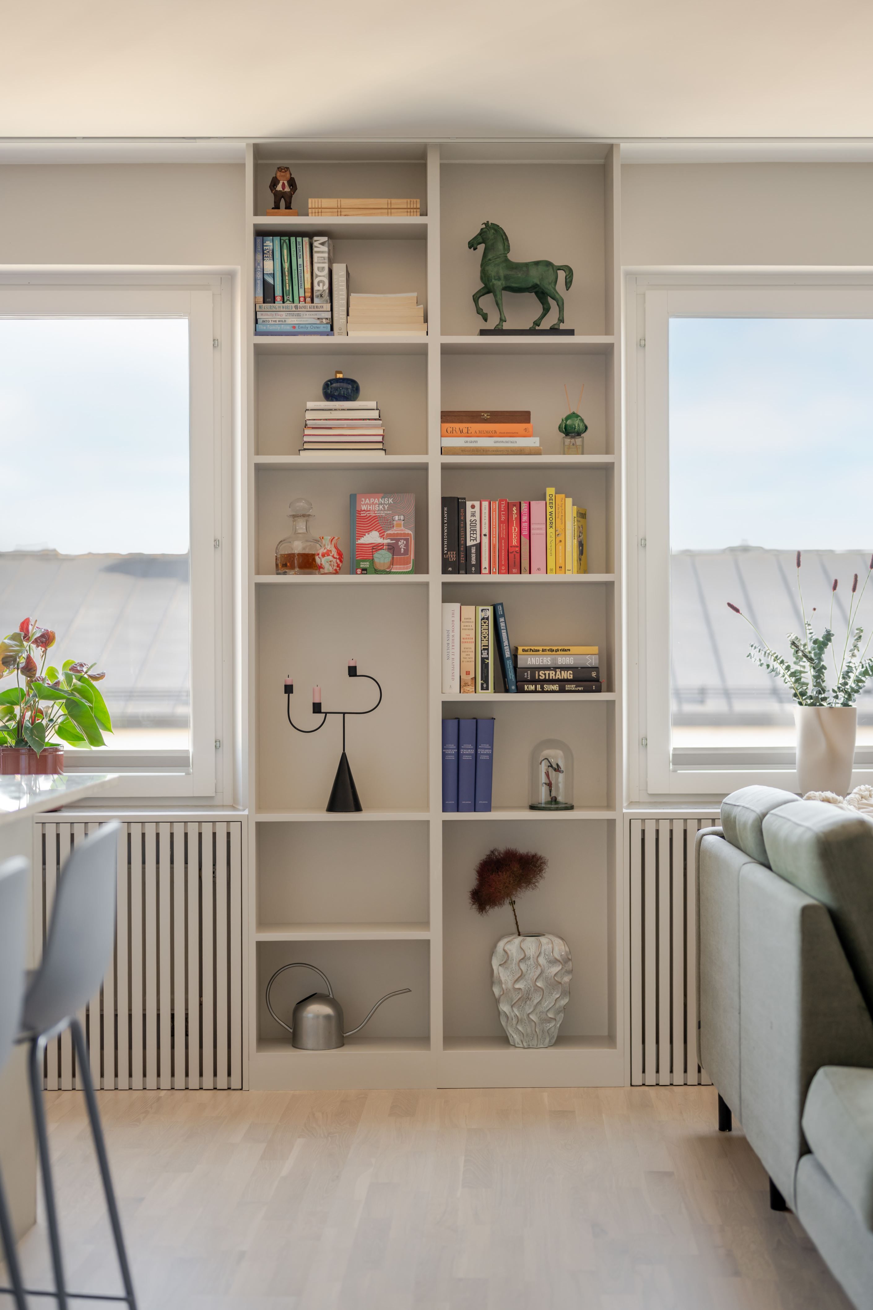 Det härliga vardagsrummet bjuder också på en fin platsbyggd bokhylla mellan fönsterpartierna som accentueras av de vackra elementskydden. Det smälter sömlöst samman med det högkvalitativa Marbodalköket, där en köksö binder samman ytorna på ett elegant sätt. Köket är väl tilltaget och inbjuder till umgänge, med gott om plats för större sällskap vid både köksbänken och den praktiska köksön.