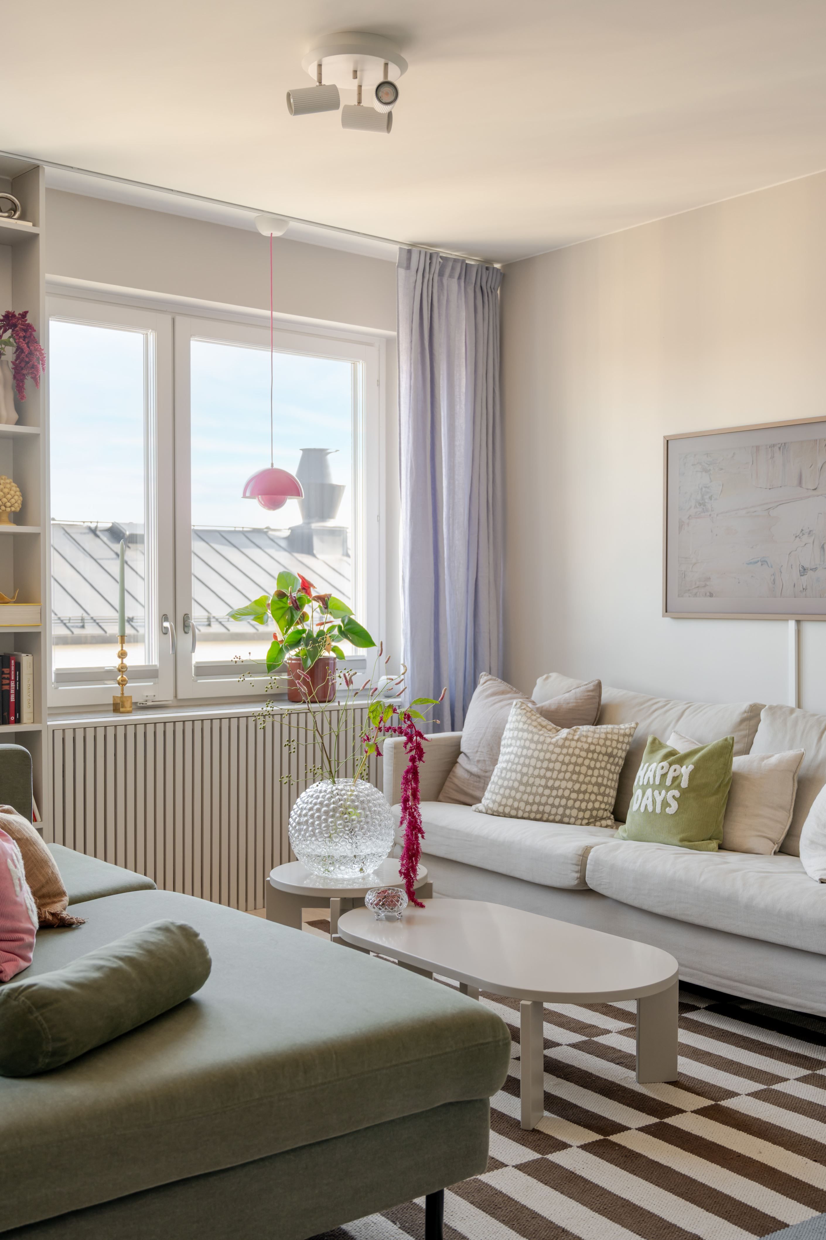 Vardagsrummet är rymligt och socialt, med fönster som erbjuder en charmig utsikt över taknockarna i Sofia Södra.