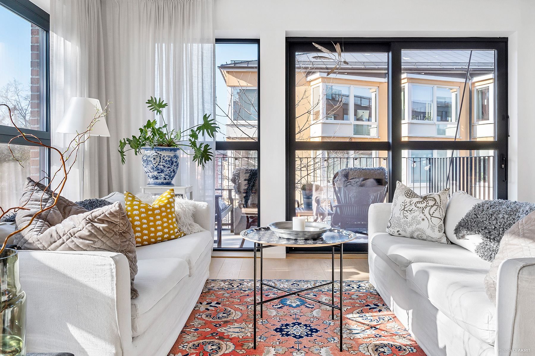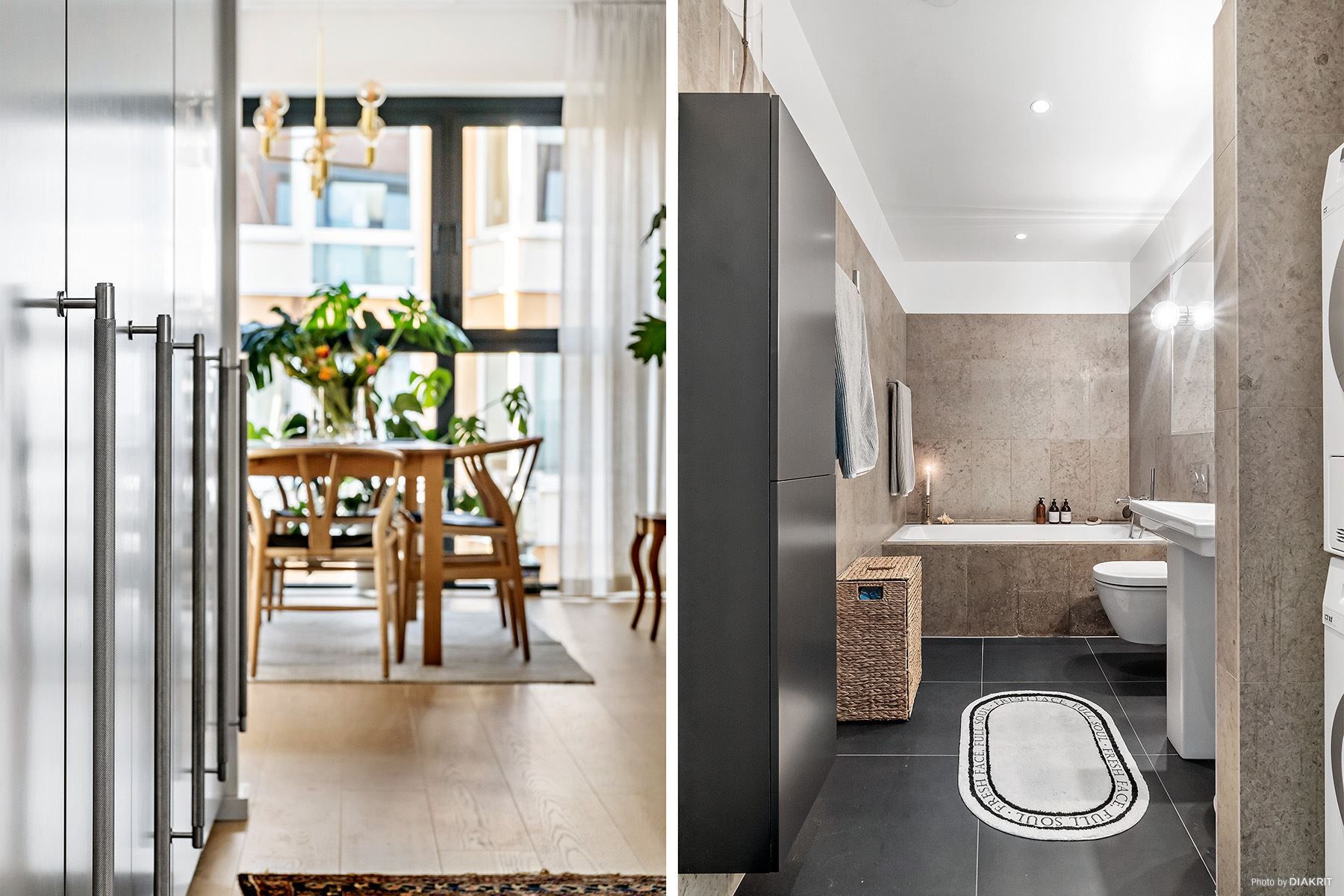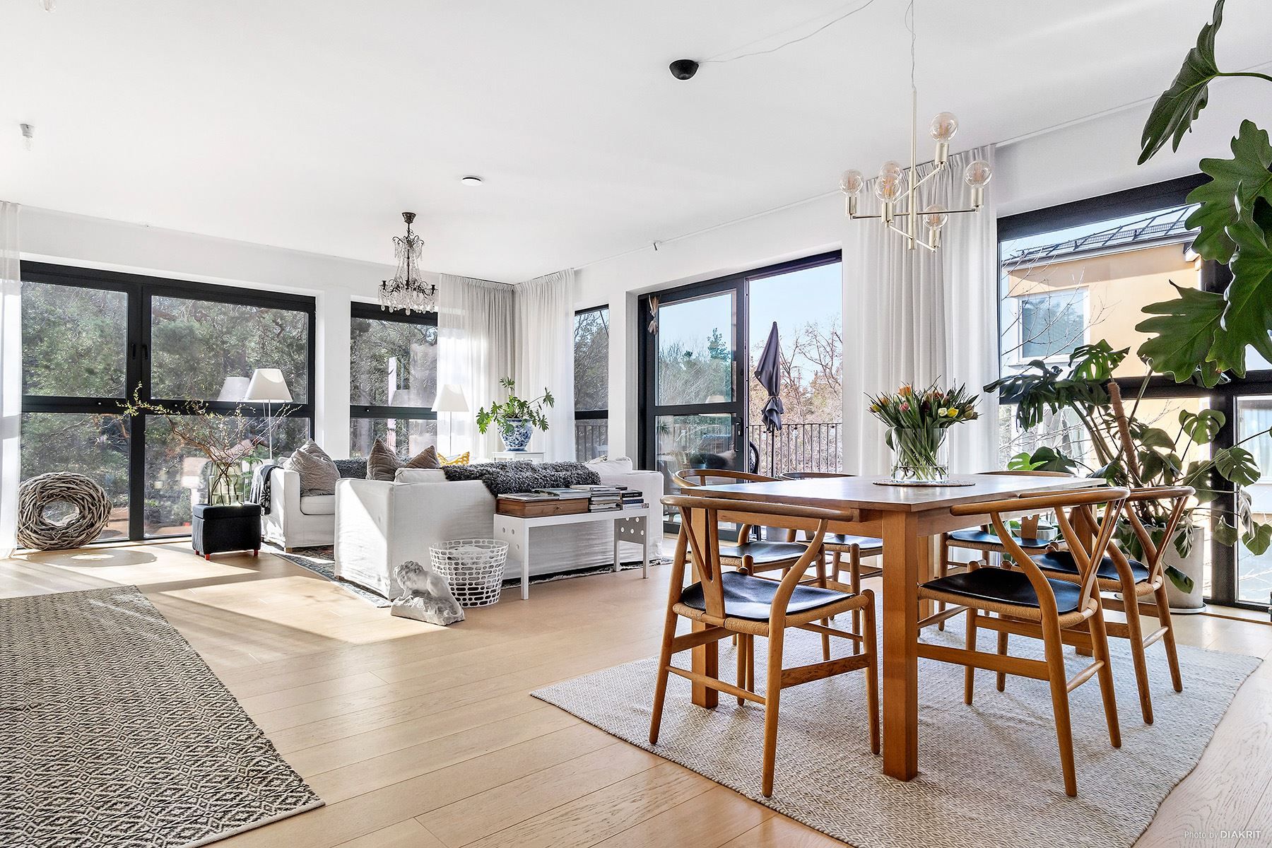 Bostaden erbjuder dessutom tre rymliga sovrum och två smakfullt inredda badrum, vilket gör hemmet lika praktiskt som vackert. Här finns utrymme för både familjeliv och sociala tillställningar.