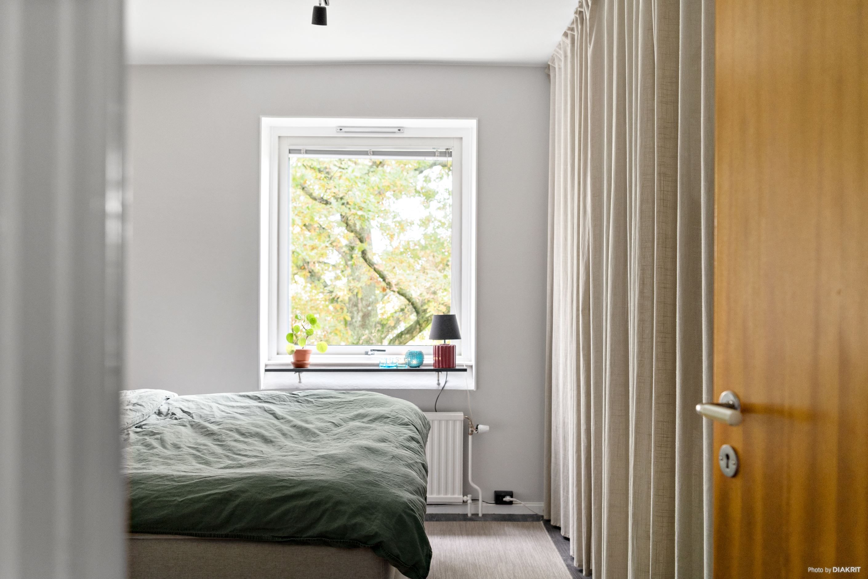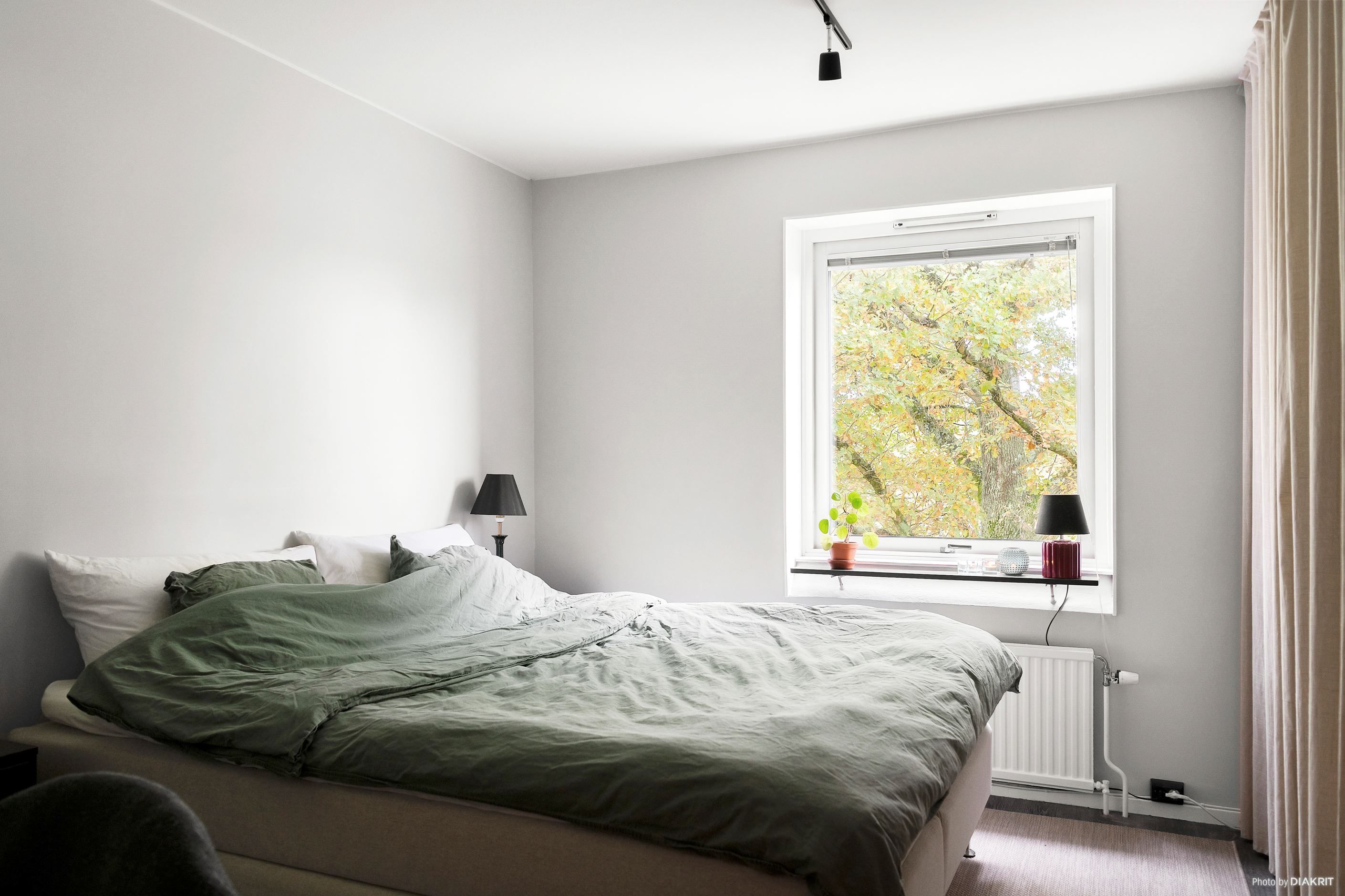 Vardagsrummet är väl tilltaget med plats för både soffa och matgrupp, och de stora fönstren gör rummet ljust och inbjudande. Sovrummet är rofyllt med gott om utrymme för dubbelsäng och kompletterande möbler samt förvaring.