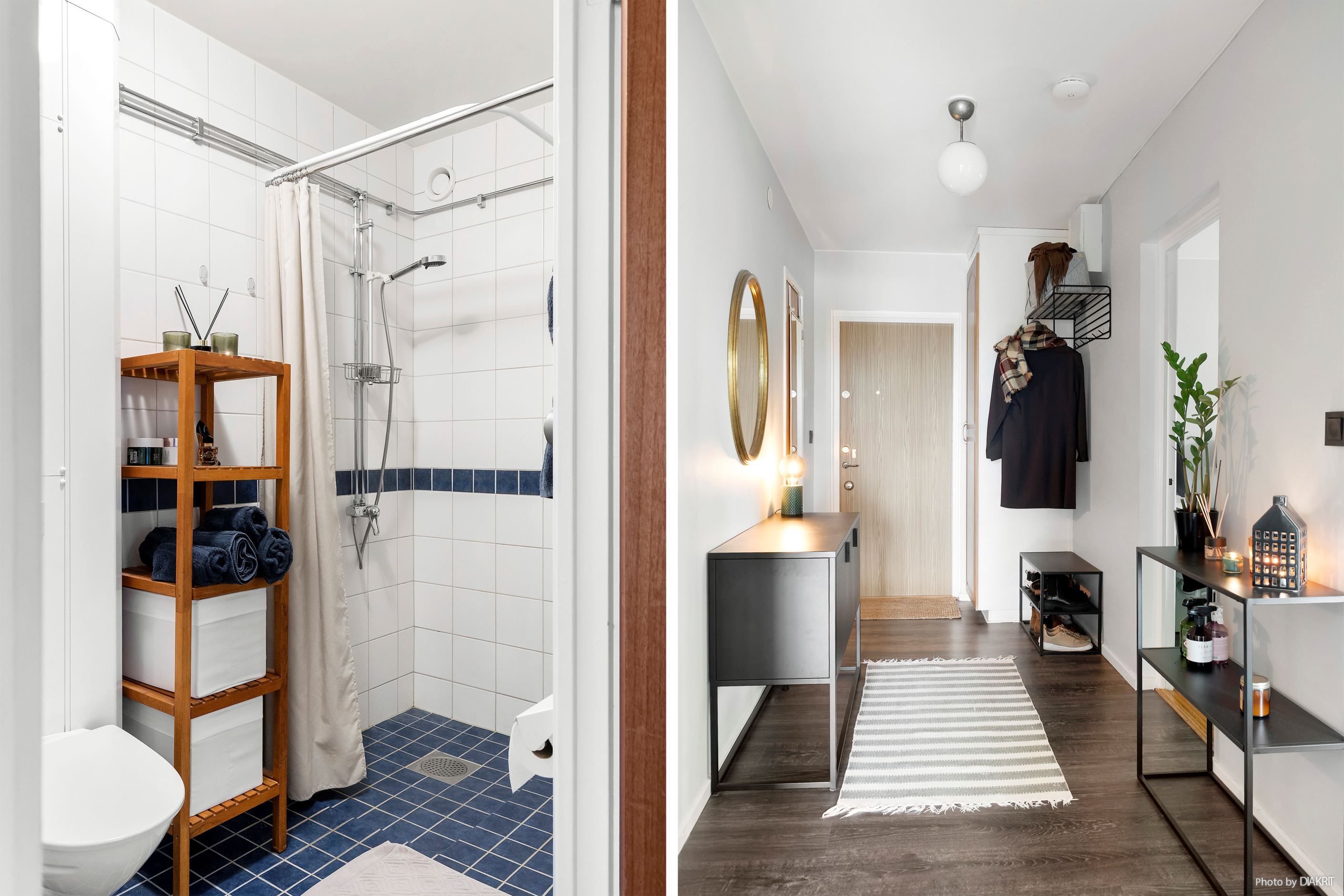 Badrummet är helkaklat i vitt och blått, utrustat med dusch, handfat och wc samt förberett för tvättmaskin. I hallen finns bra avhängningsmöjligheter och en praktisk klädkammare som löser förvaringen på ett smidigt sätt.