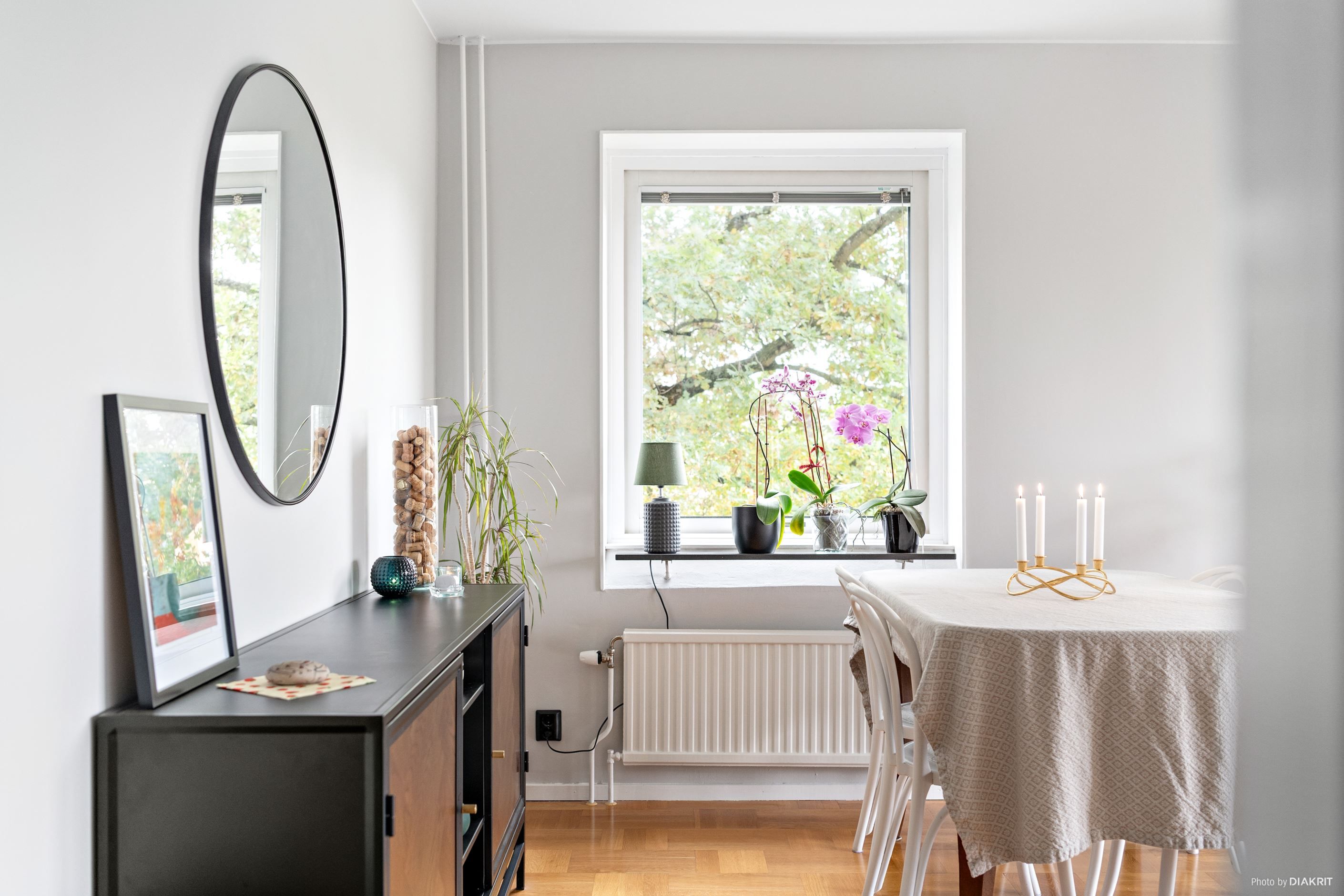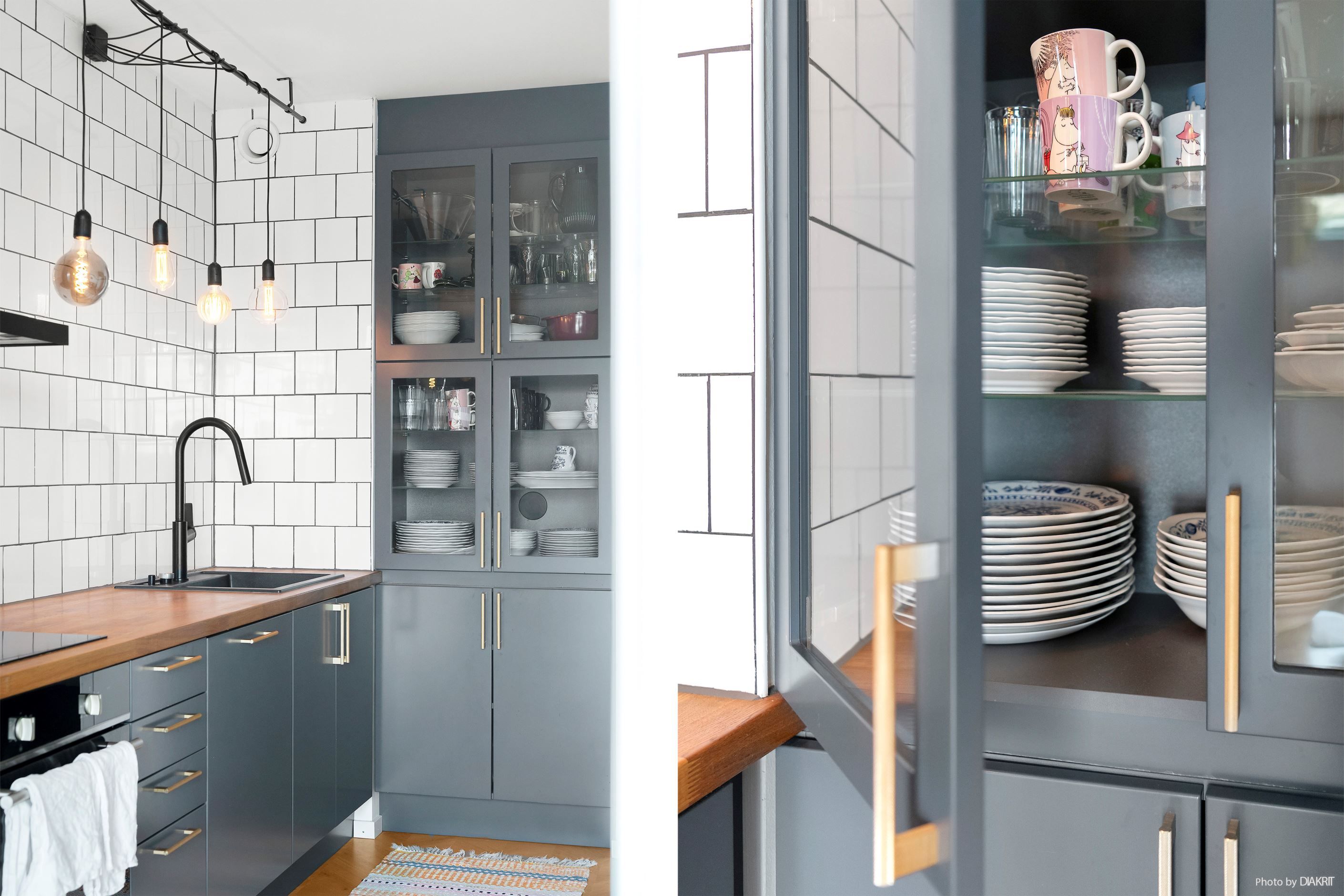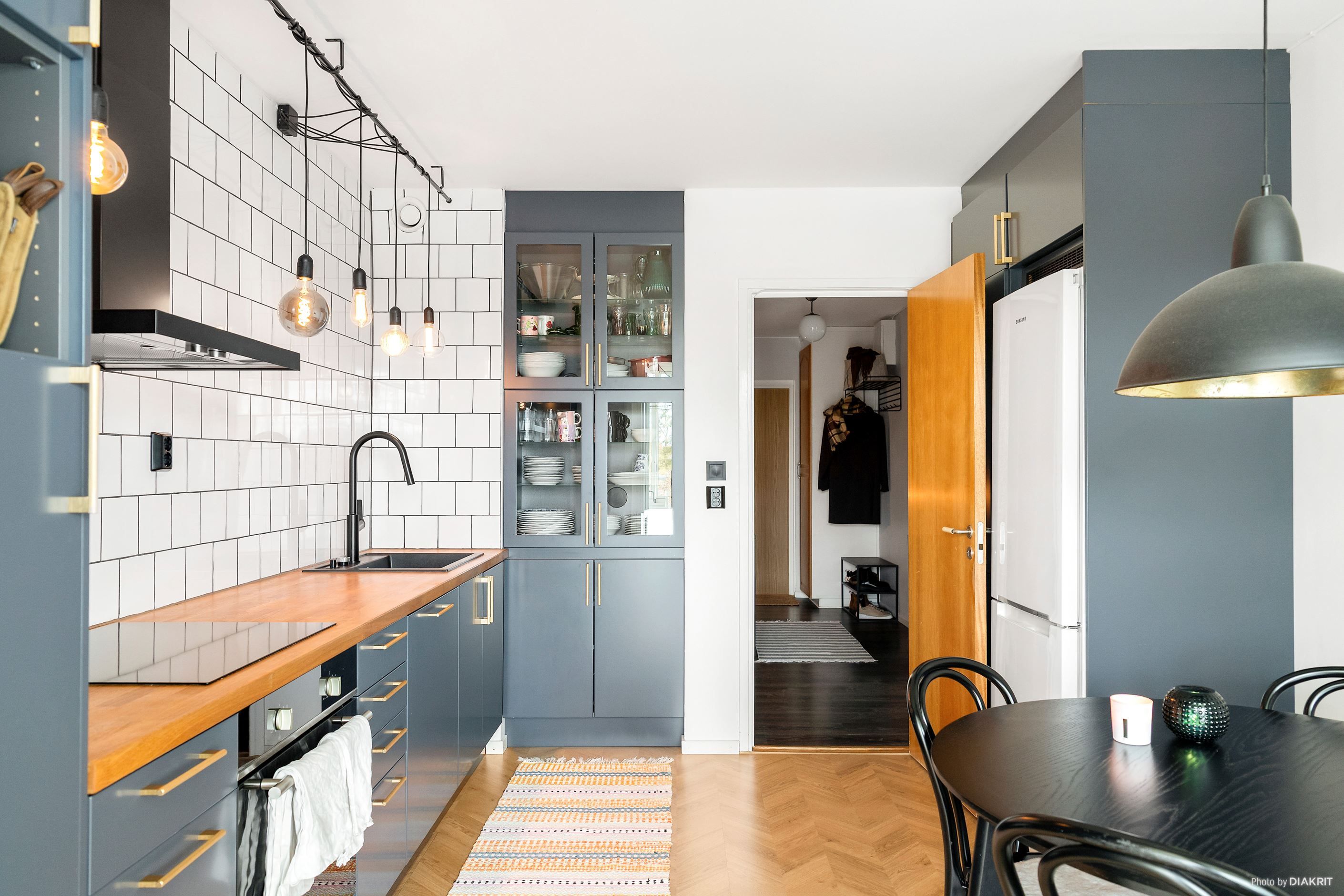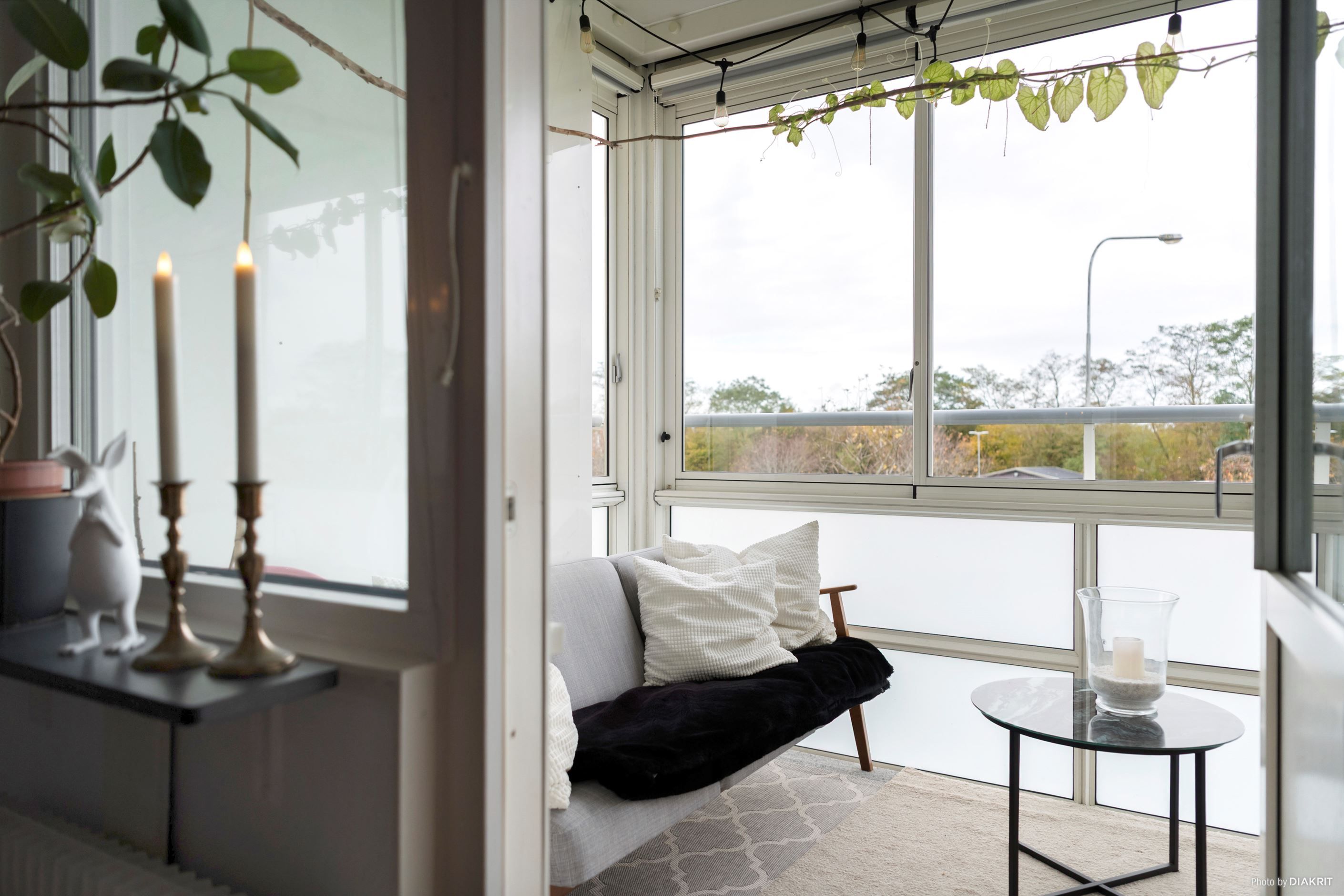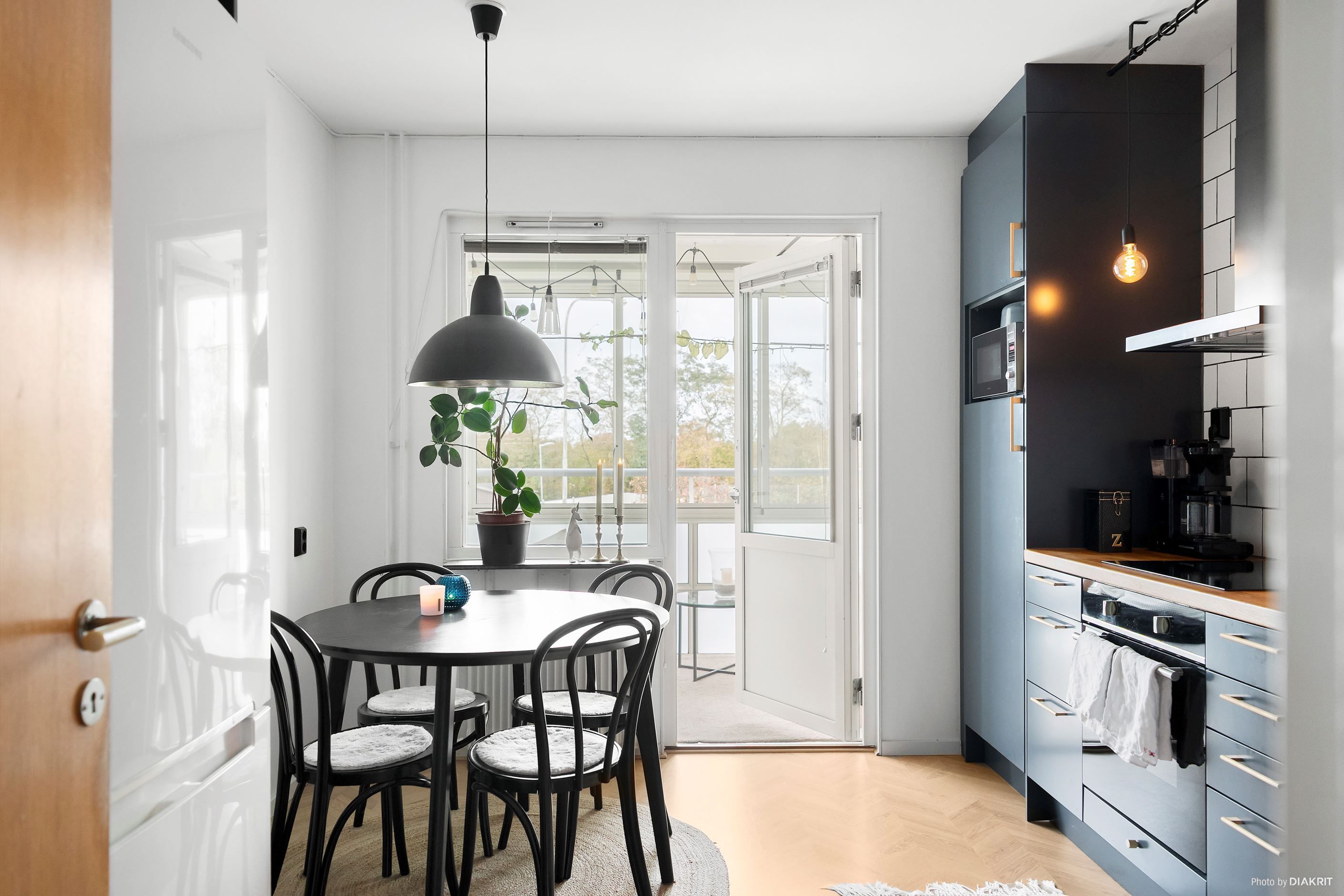 Köket är renoverat i en harmonisk ton med gråblå luckor, bänkskiva i trä och vitt kakel som ger en modern men samtidigt varm känsla. Här finns gott om arbetsyta och förvaring, samt en naturlig matplats intill fönstret. Från köket nås den inglasade balkongen – en lugn plats med fin utsikt och i princip ett extra rum att njuta av större delen av året.
