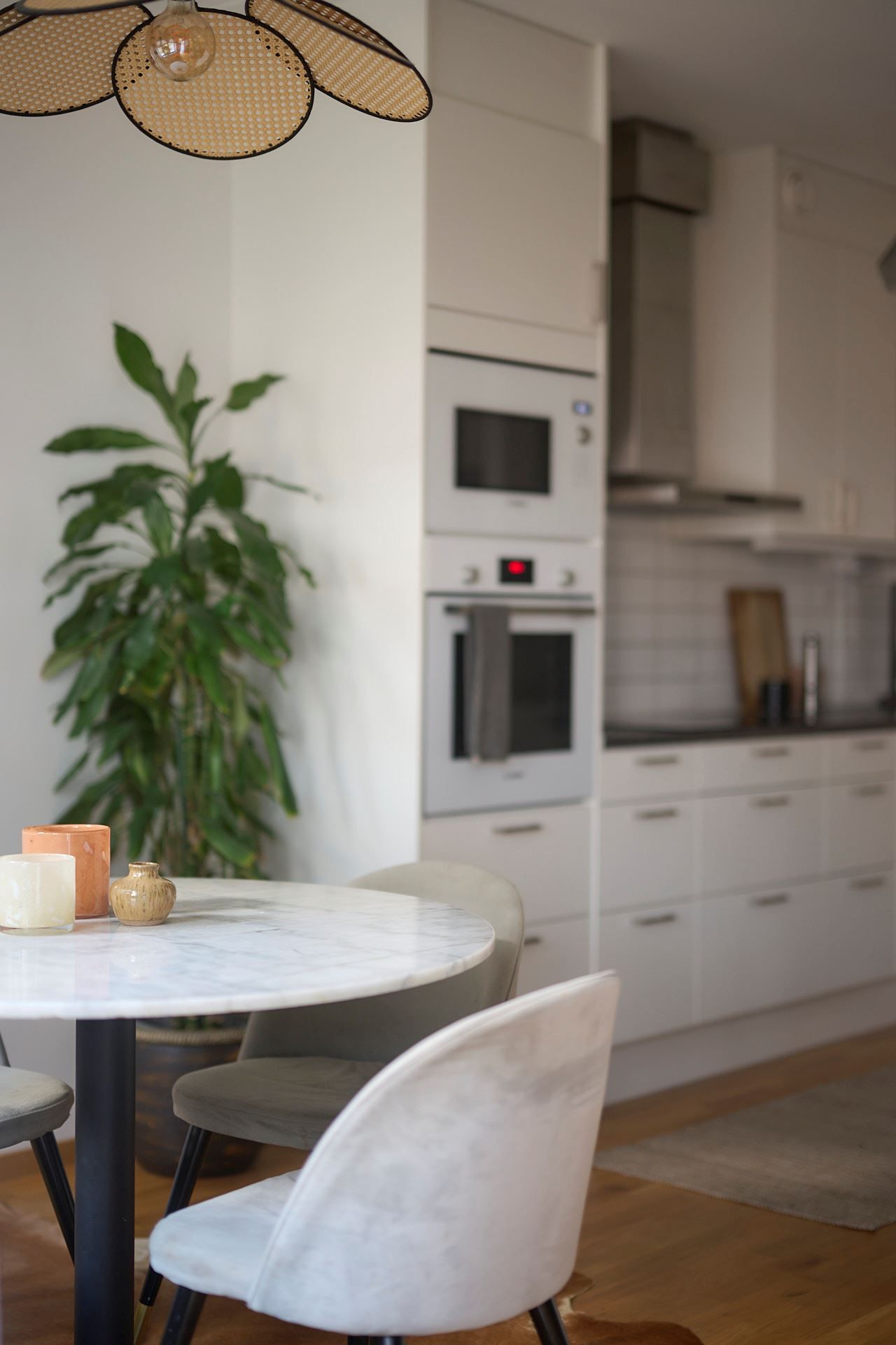 En social planlösning mellan vardagsrum och kök utgör hjärtat av bostaden med utgång till balkongen som vetter mot innergården. Bostaden har två väl tilltagna sovrum med utrymme för större sängar och gott om plats för förvaring.