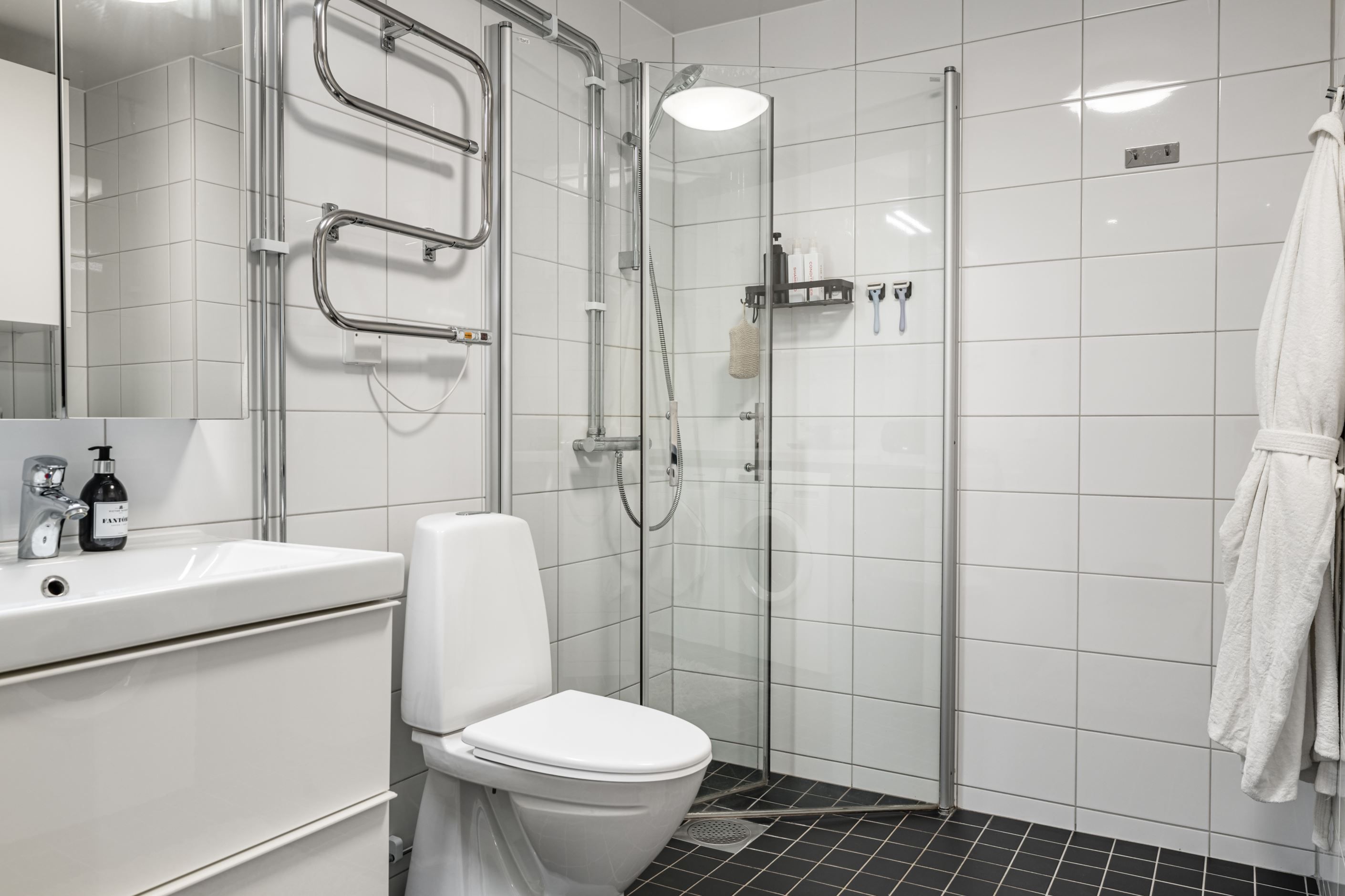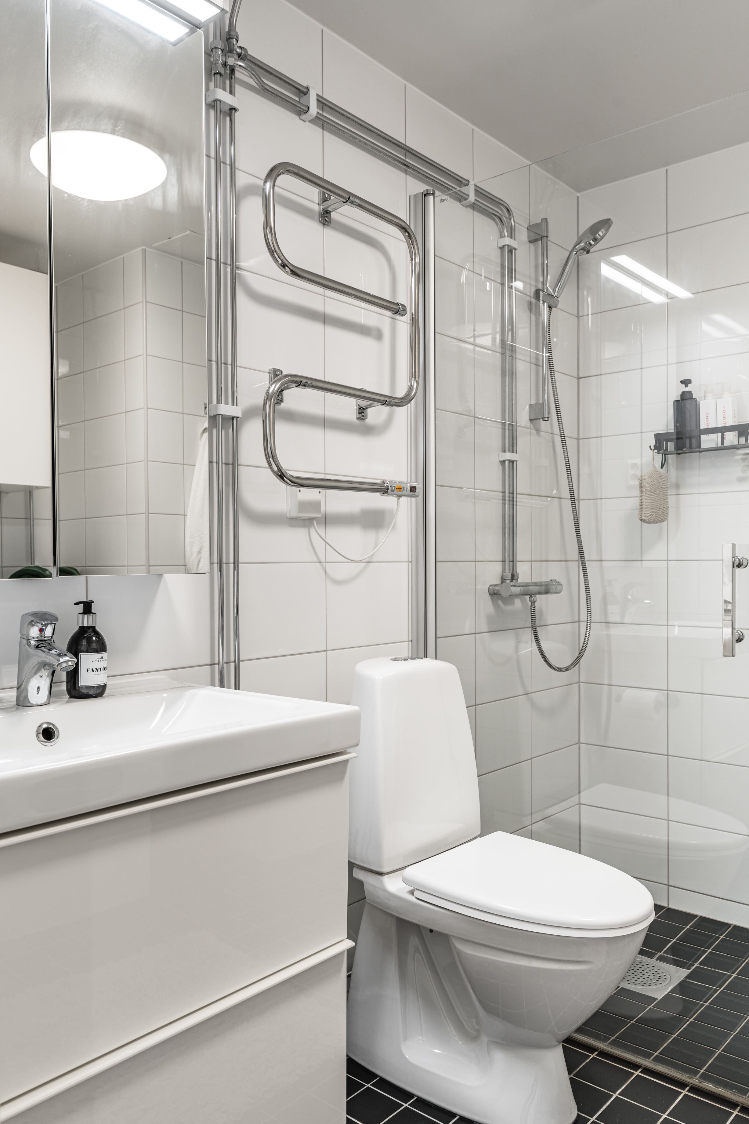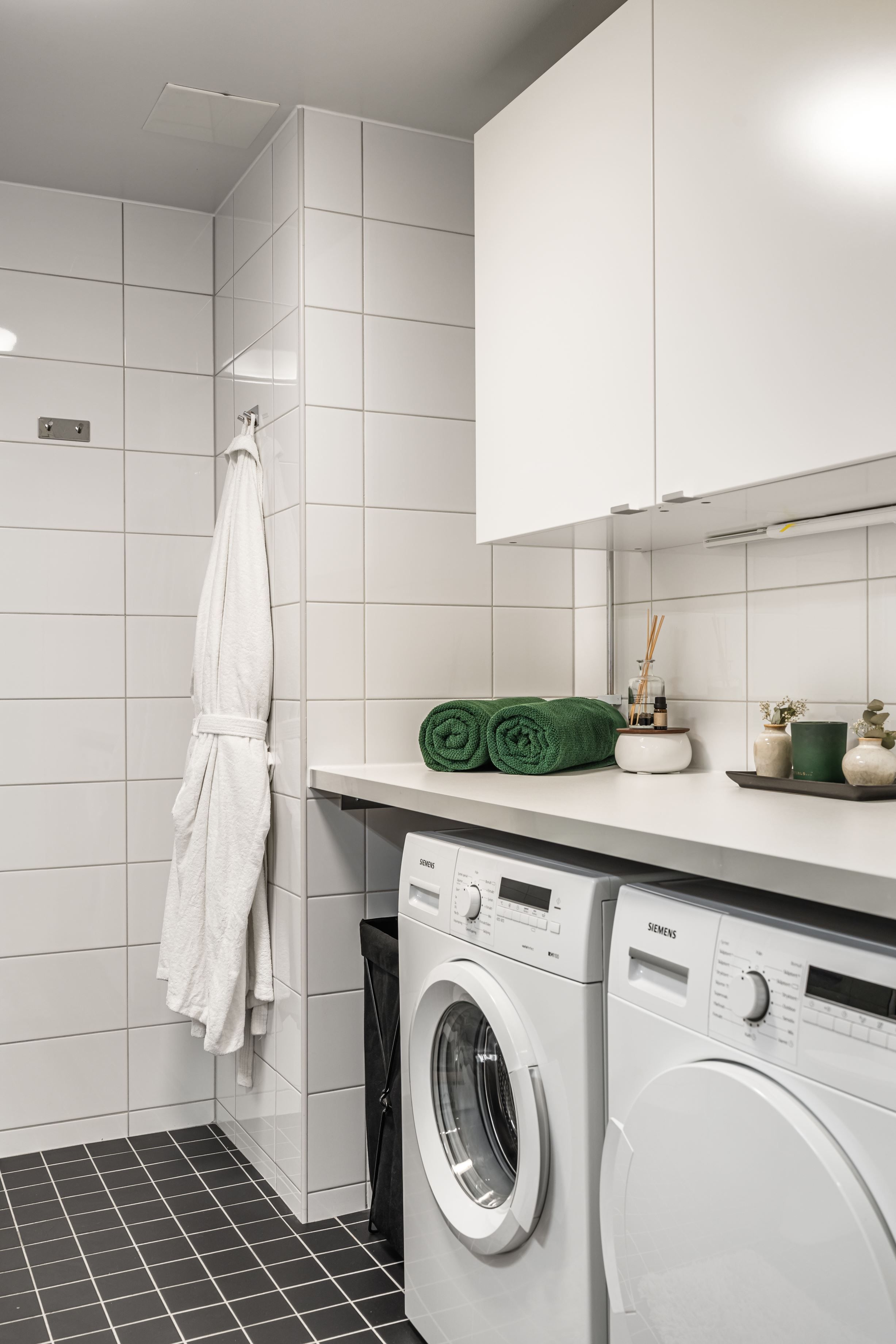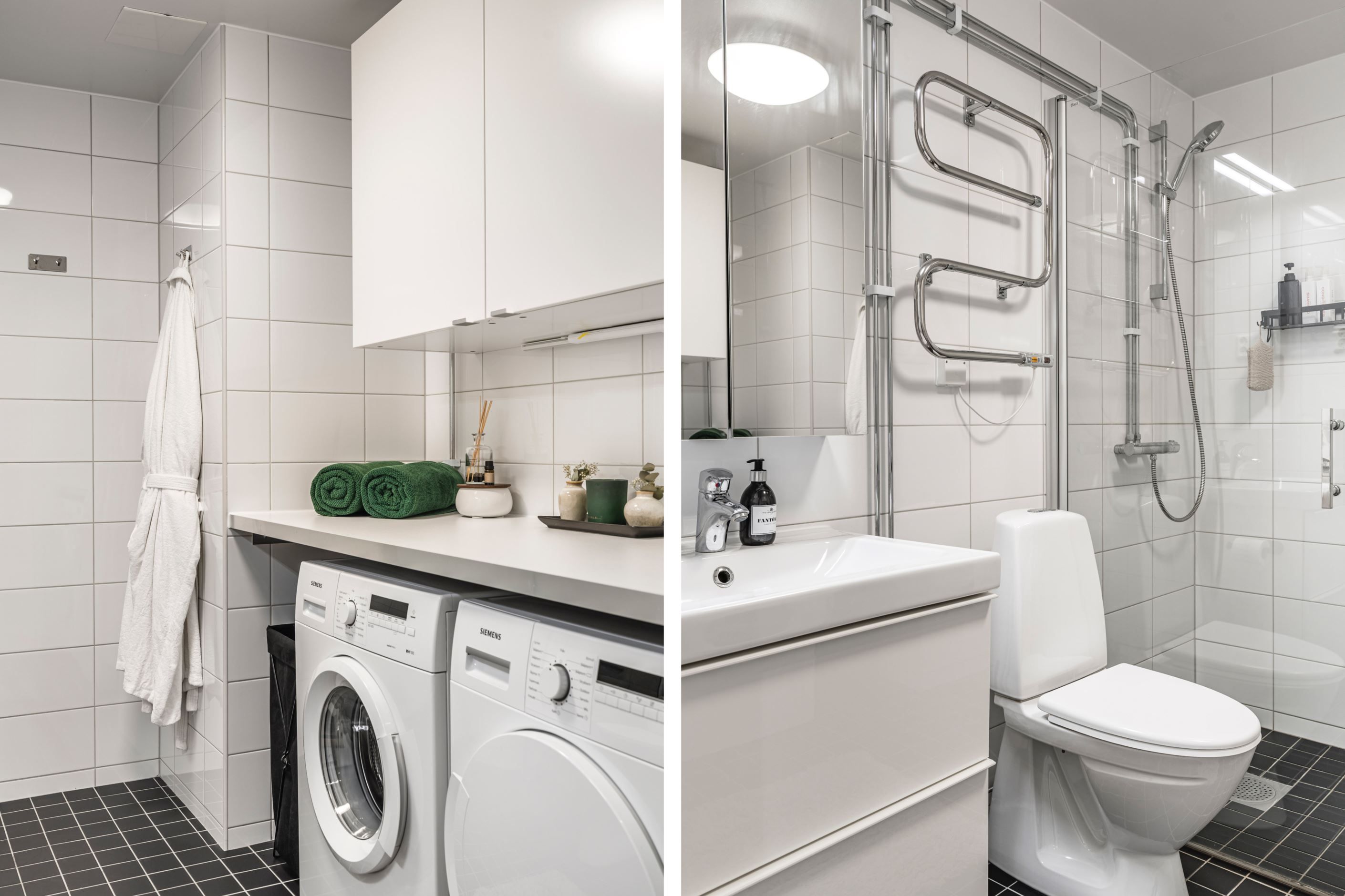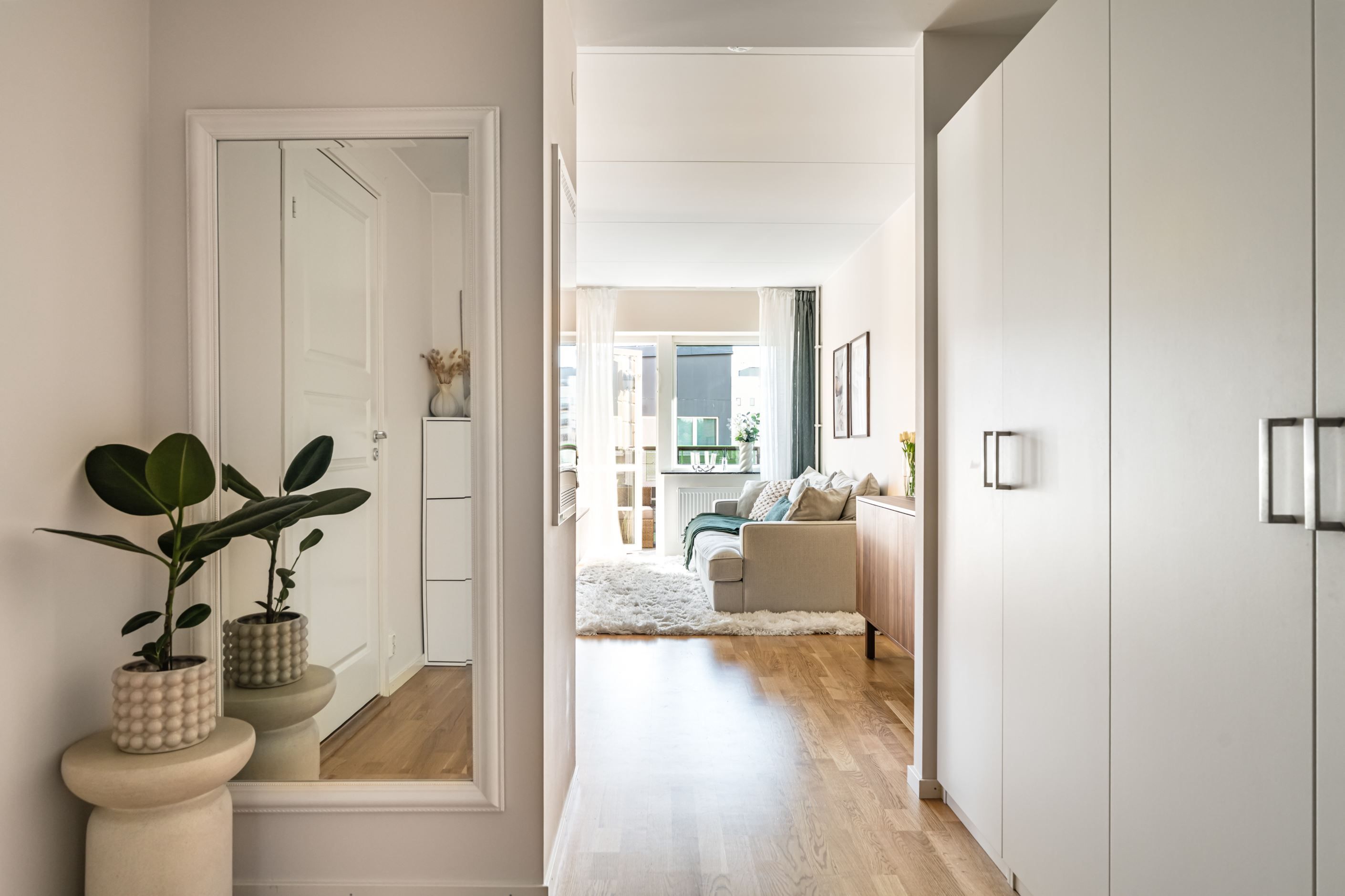 En inbjudande hall med gott om förvaring i form av platsbyggda garderober välkomnar dig in i bostaden. Hallen leder vidare till det fräscha, helkaklade badrummet som är utrustat med golvvärme, tvättmaskin och goda förvaringsmöjligheter.