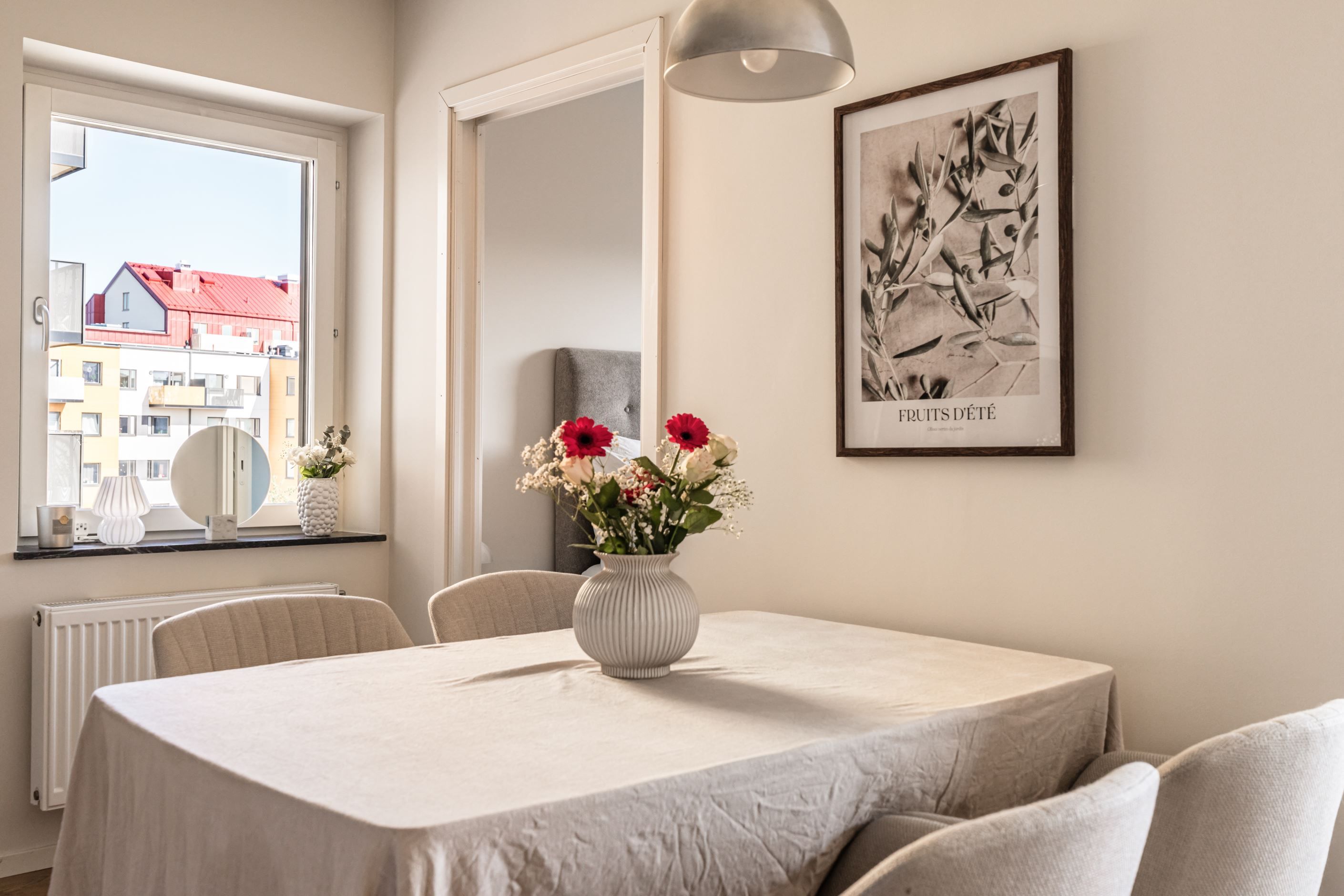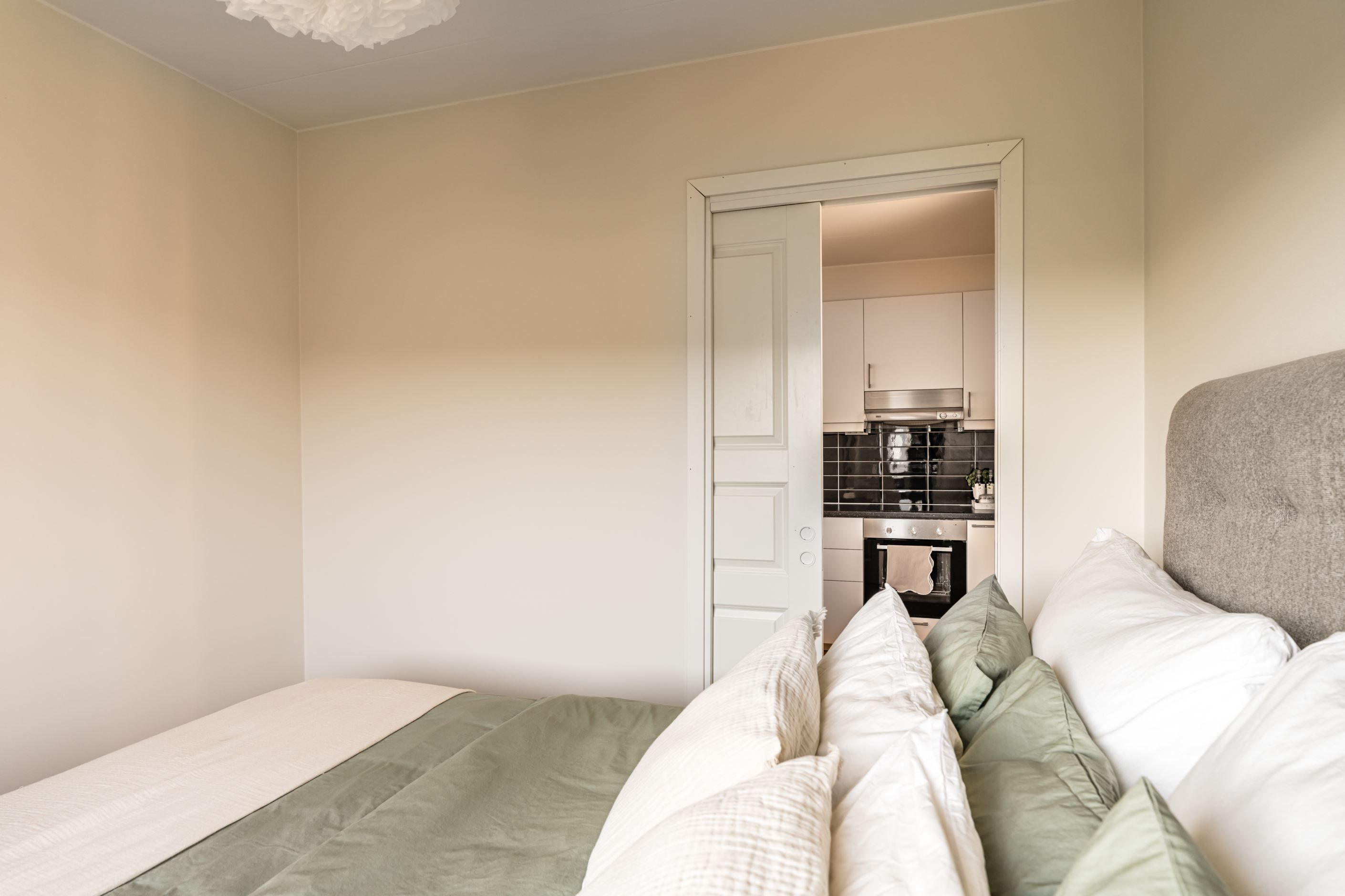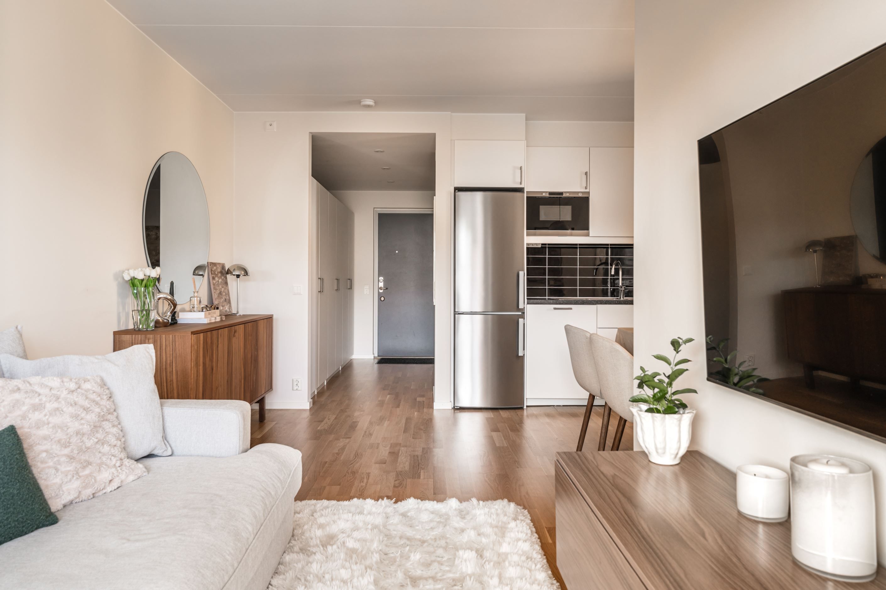 En smart planerad och ljus 2:a med en unik planlösning som kombinerar funktion och trivsel på bästa sätt. Här har man på ett genomtänkt sätt satt upp en vägg mellan vardagsrum och sovrum för att skapa en mer avskild och harmonisk sovdel – perfekt för den som vill ha lite extra lugn och ro.