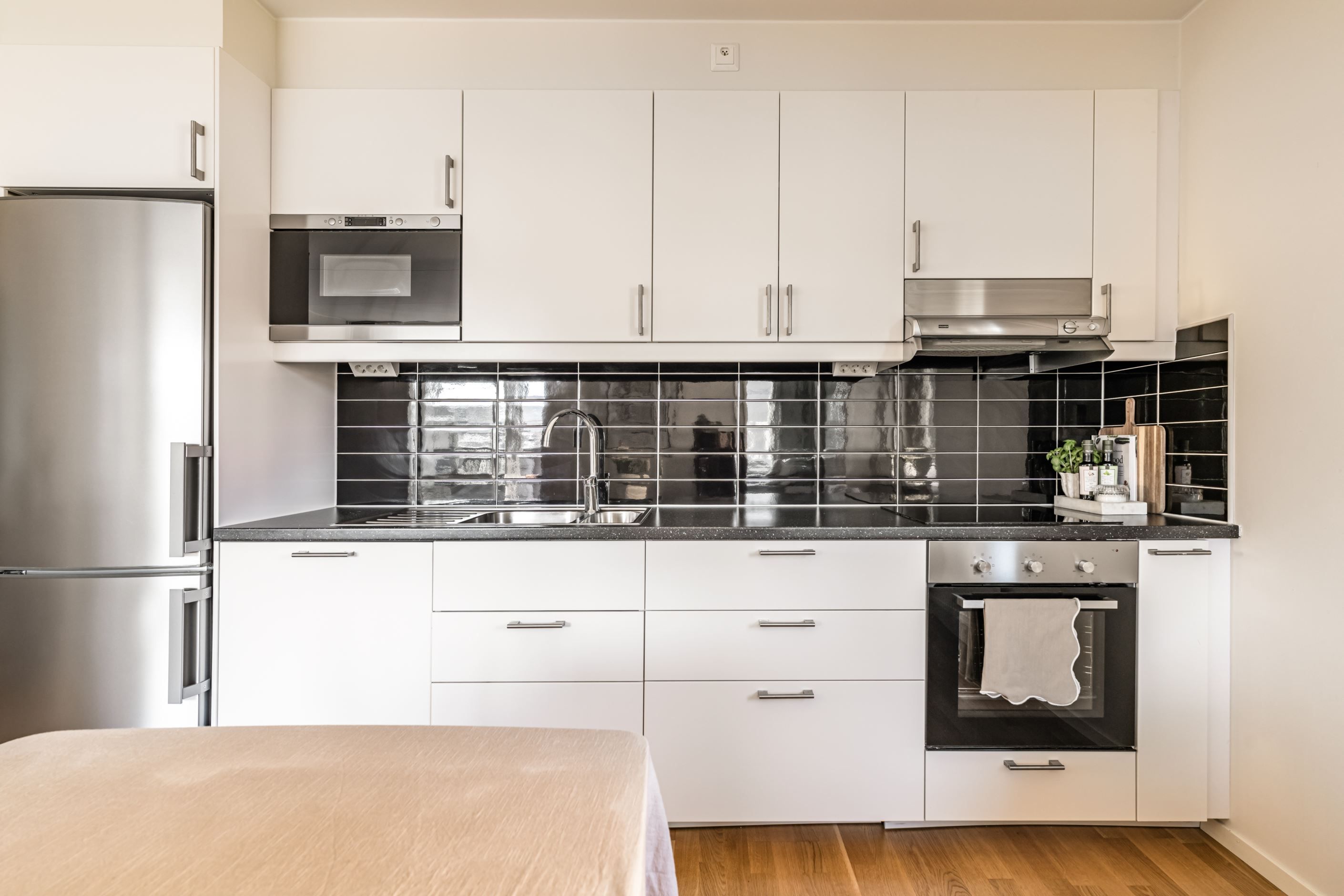 Köket är stilrent och fullutrustat med moderna vitvaror. Här finns gott om arbetsytor, förvaring och diskmaskin.