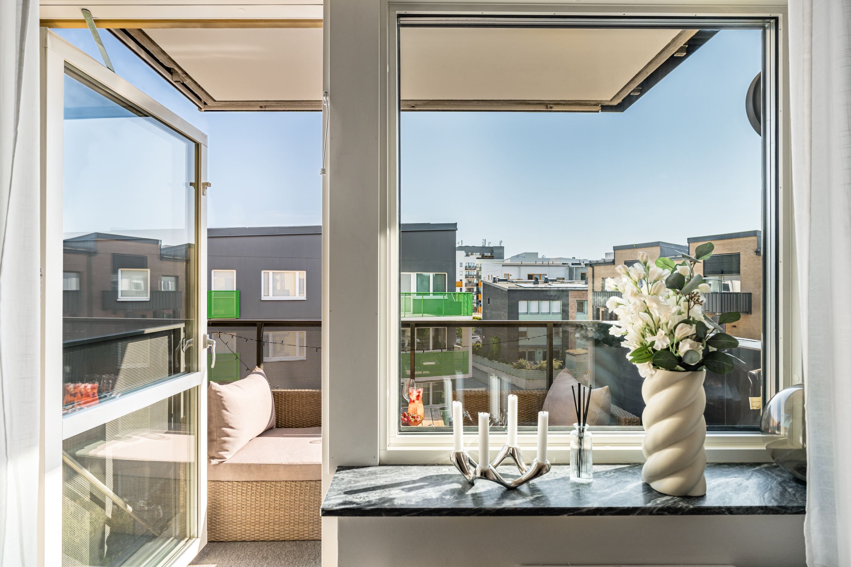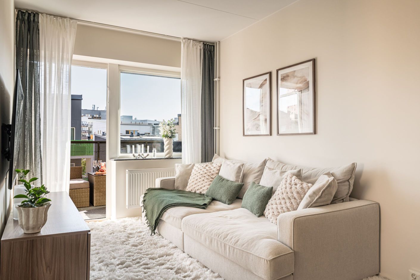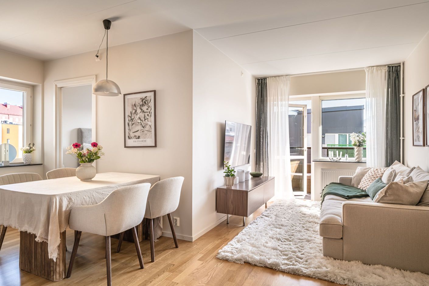 Det luftiga vardagsrummet bjuder på ett härligt ljusinsläpp tack vare bostadens höga läge och stora fönsterpartier. Från vardagsrummet når du även den rymliga balkongen med sol under morgonen.