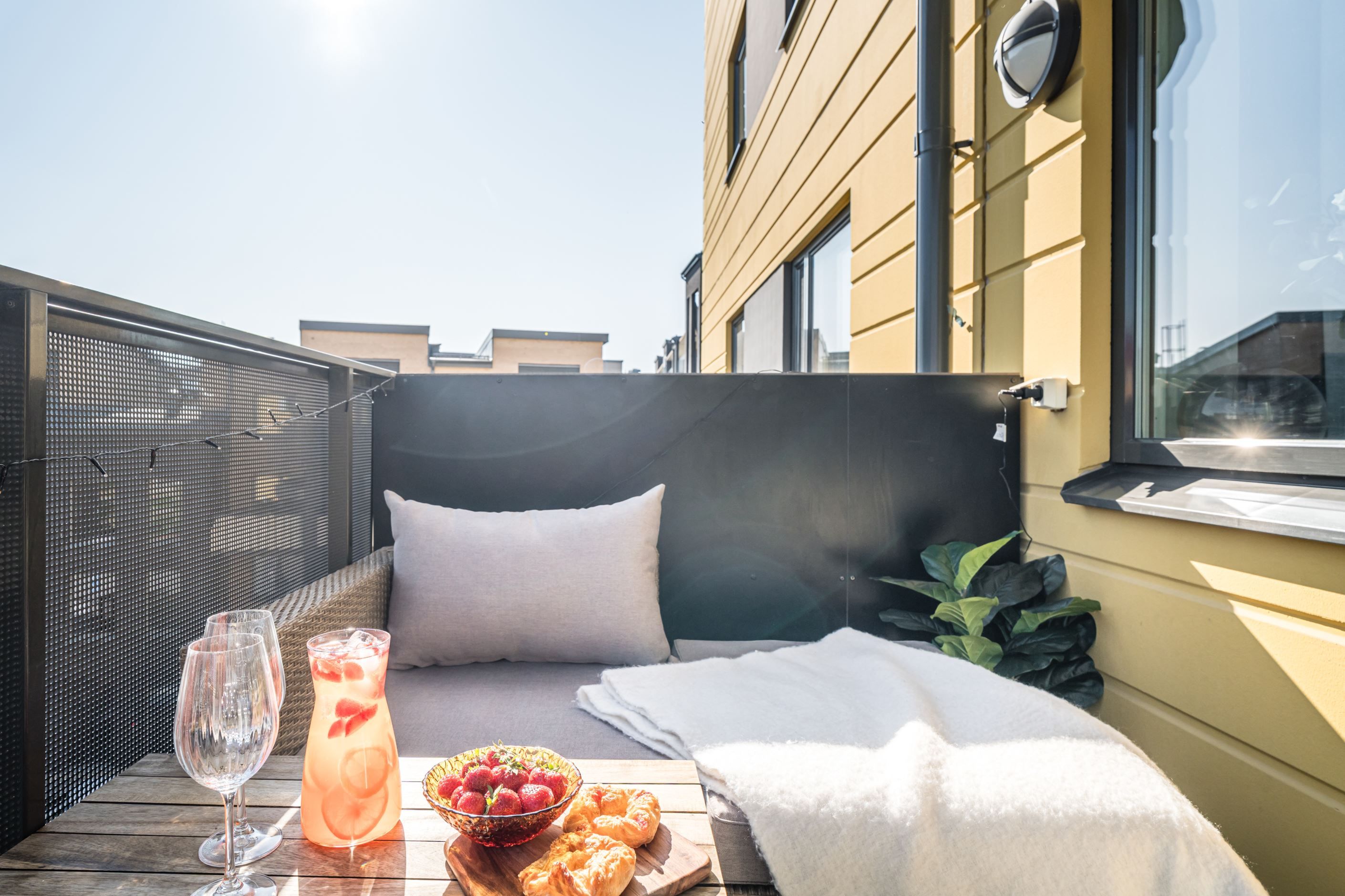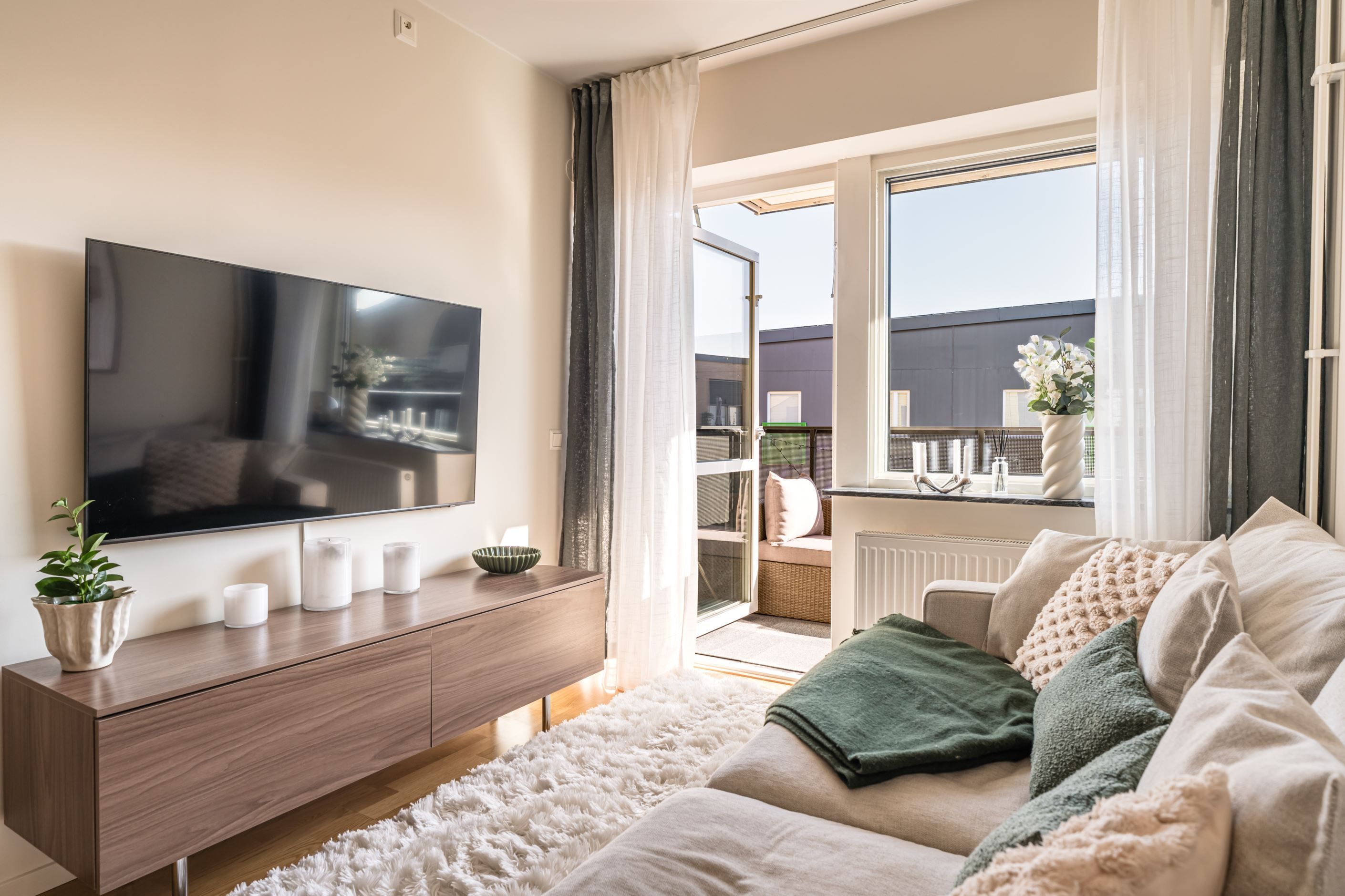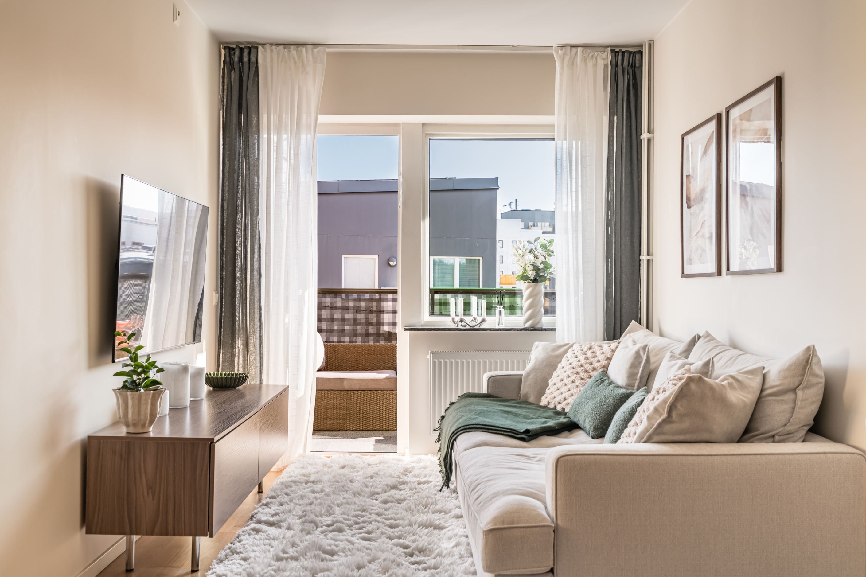 Det luftiga vardagsrummet bjuder på ett härligt ljusinsläpp tack vare bostadens höga läge och stora fönsterpartier. Från vardagsrummet når du även den rymliga balkongen med sol under morgonen.