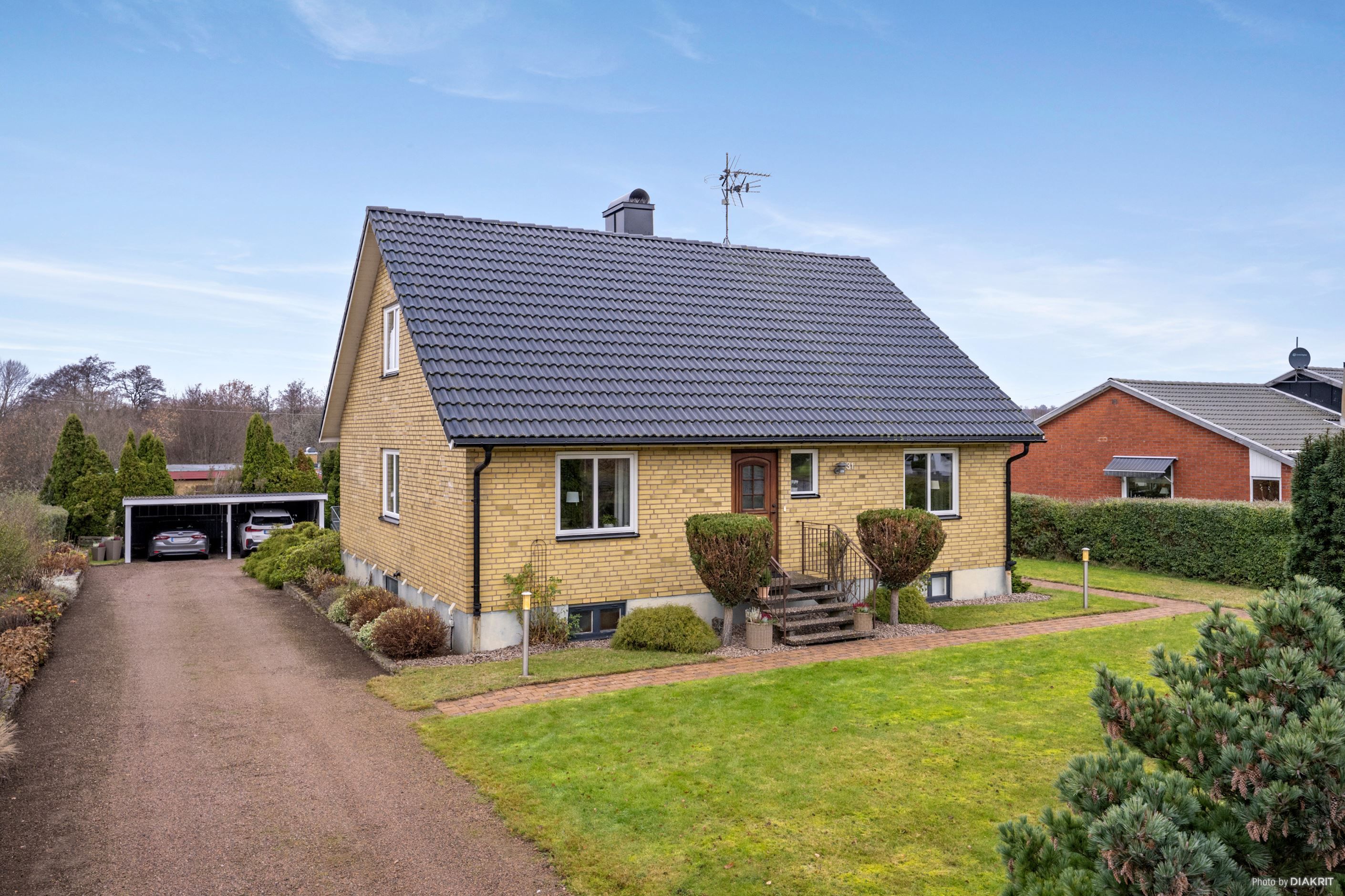 Tomten är väldisponerad och luftig. Här finns både dubbelcarport samt garage och utöver det gott om uppställningsplats för fler bilar, släp eller husvagn.