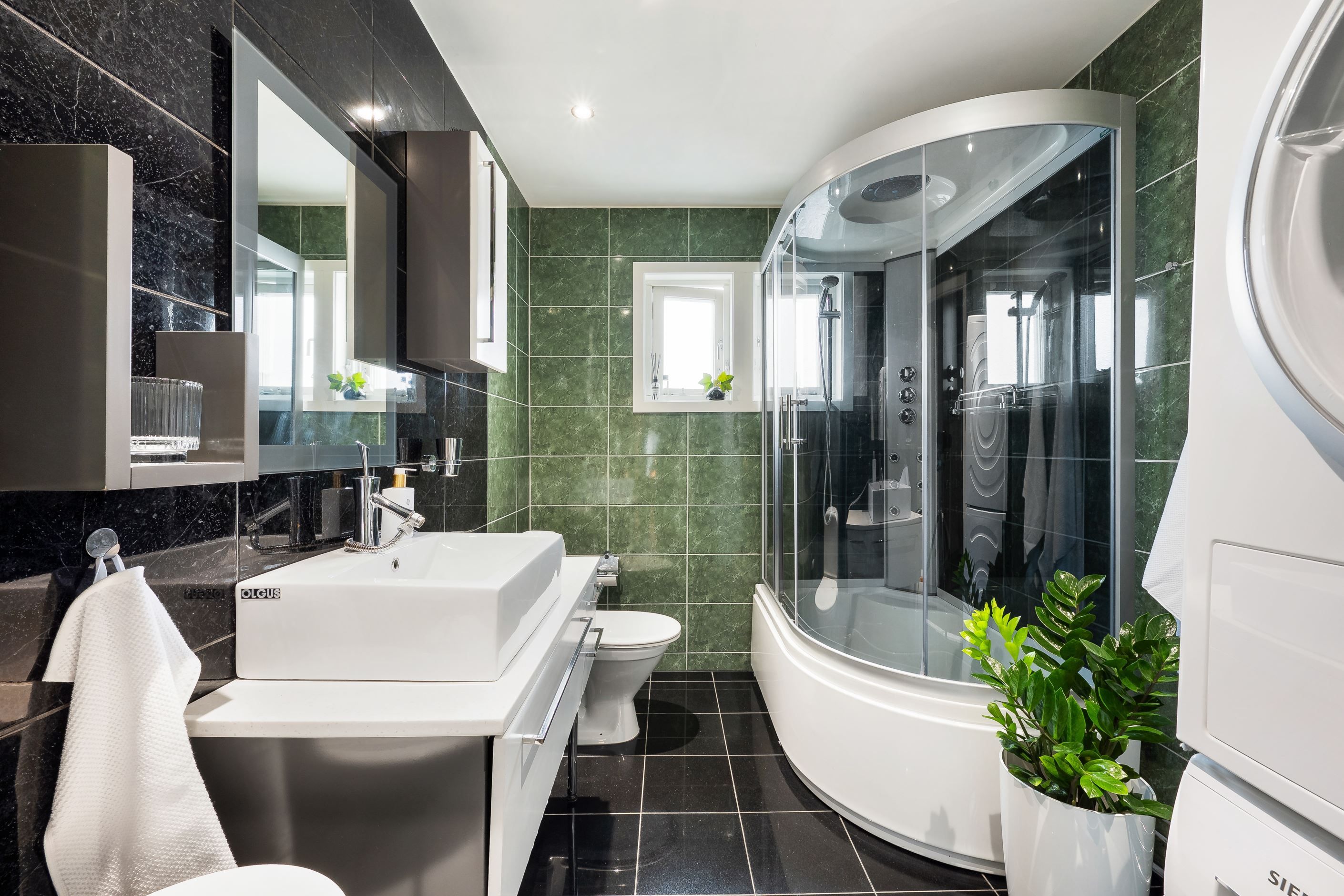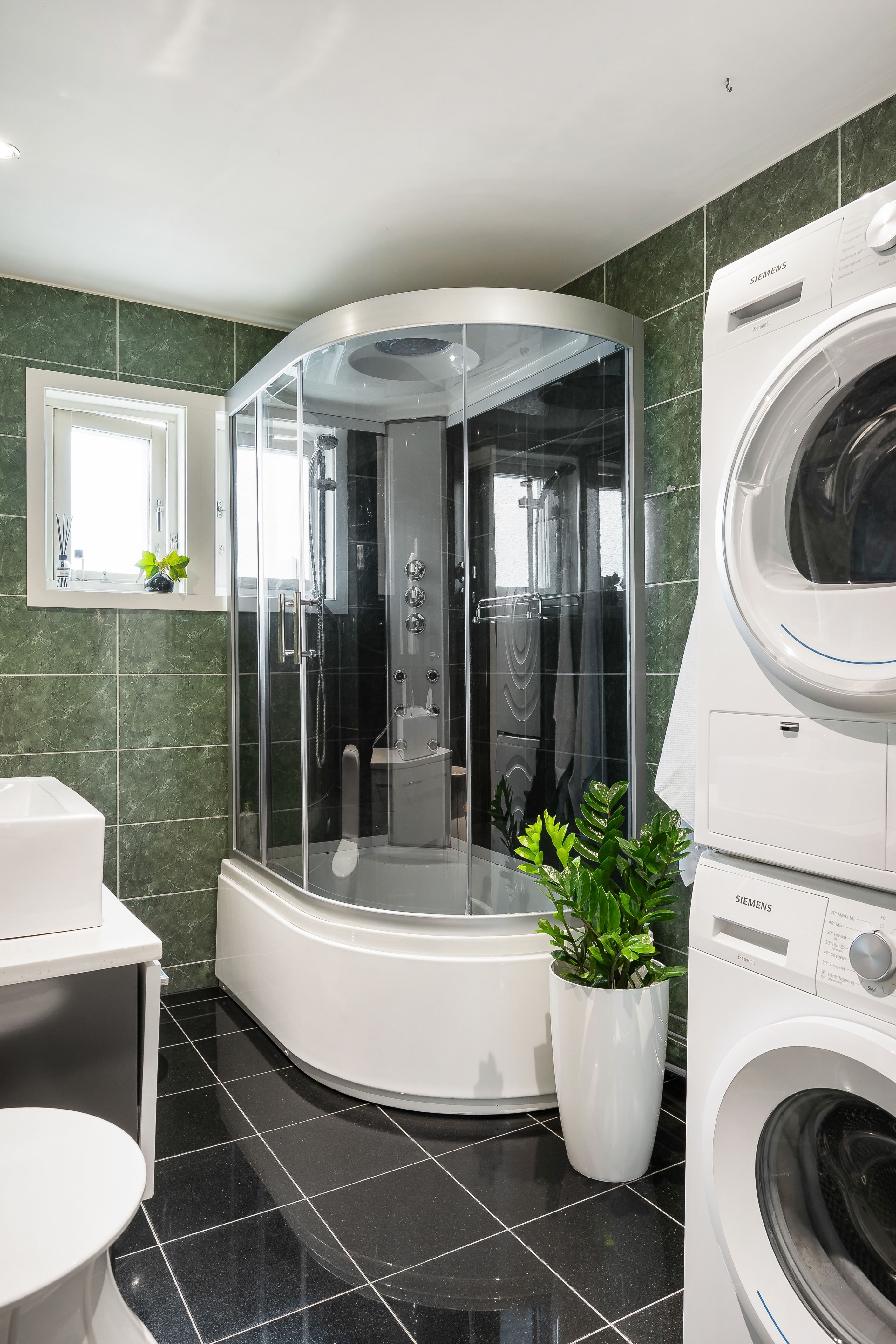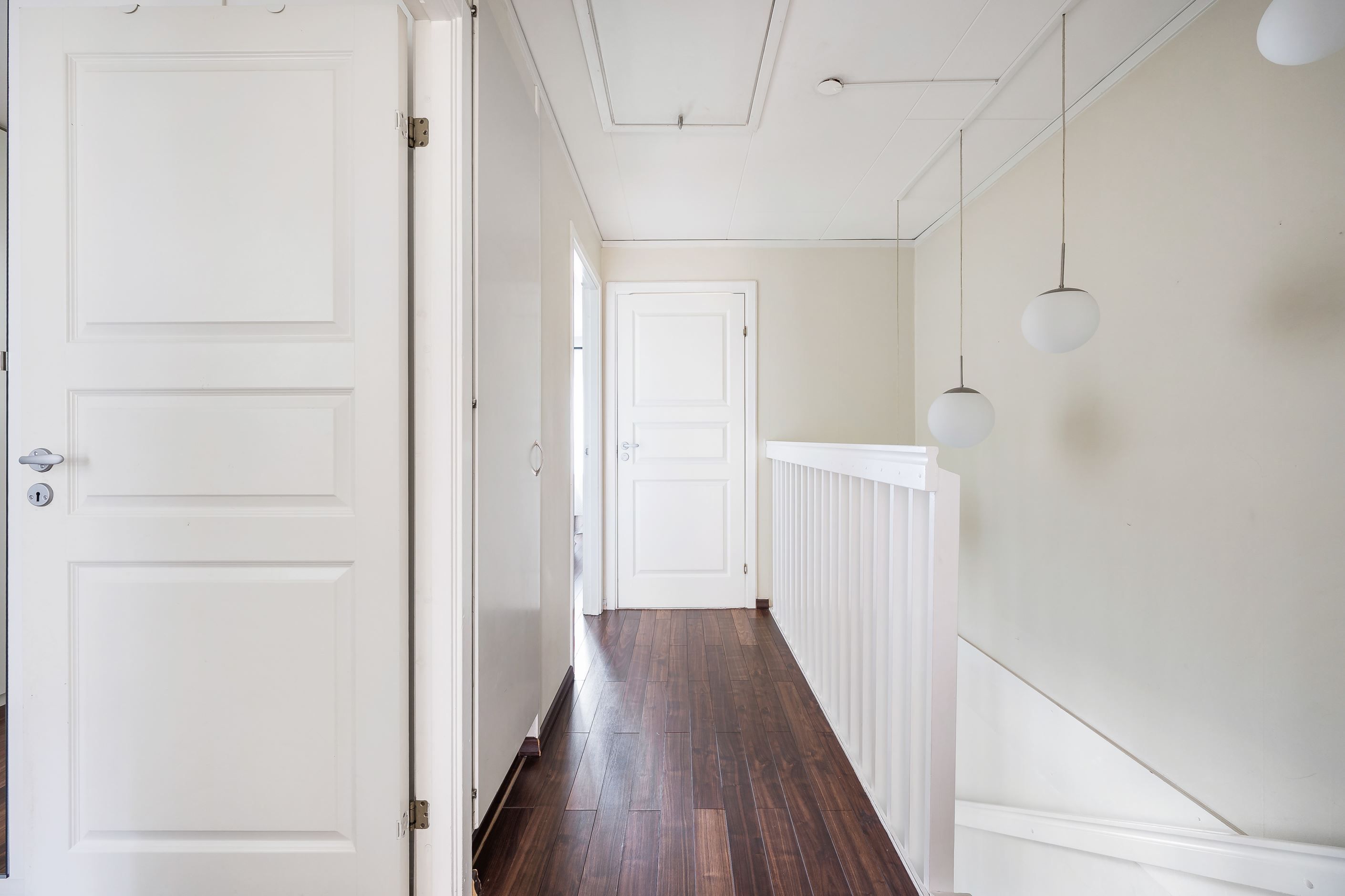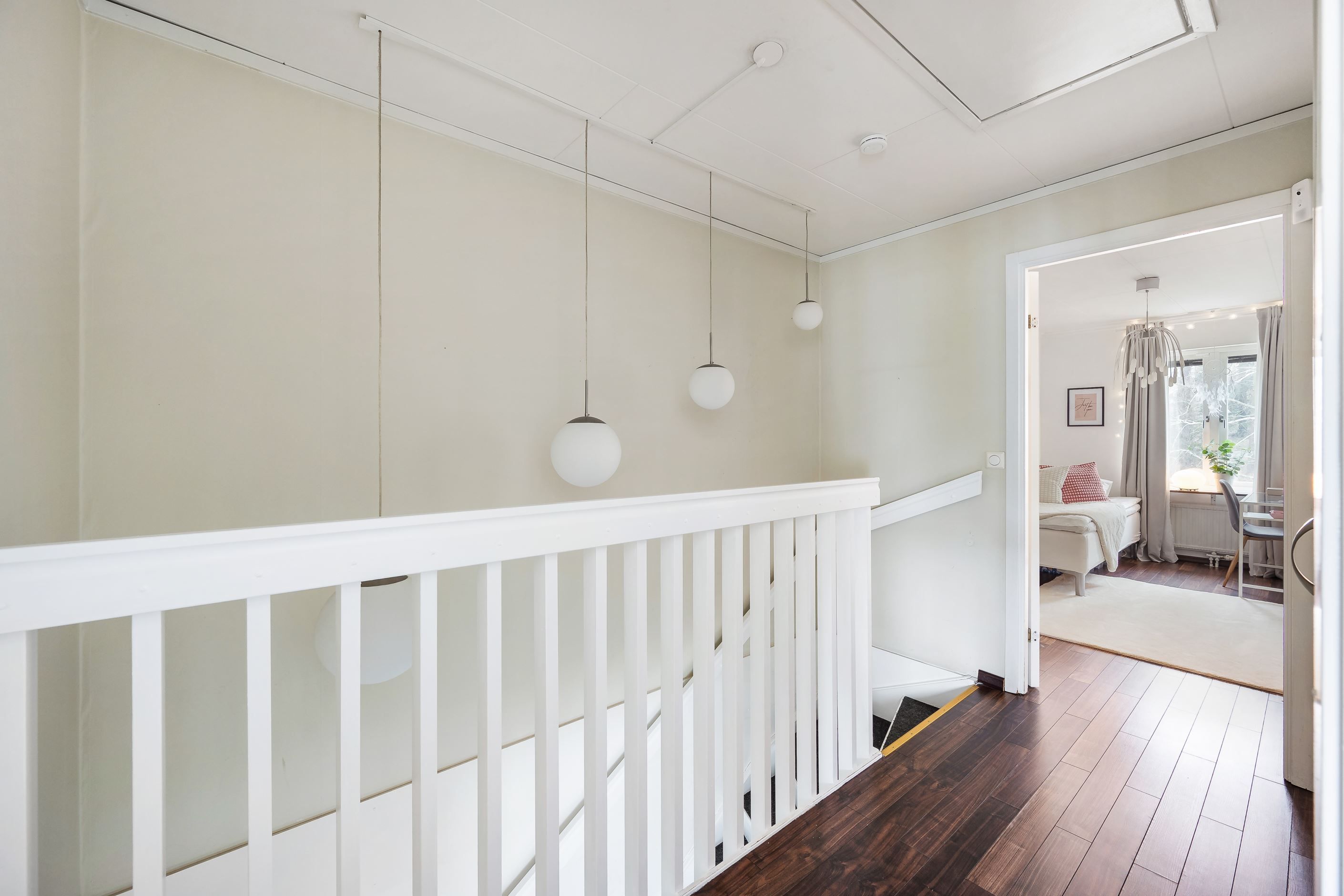 En trappa upp finns tre rymliga sovrum med fint ljusinsläpp och gott om garderober kompletterat med praktiskt vindsförråd för extra förvaring. Det stora helkaklade badrummet håller en hög komfortnivå och är utrustat med duschkabin, tvättmaskin, torktumlare, golvvärme och vädringsfönster.