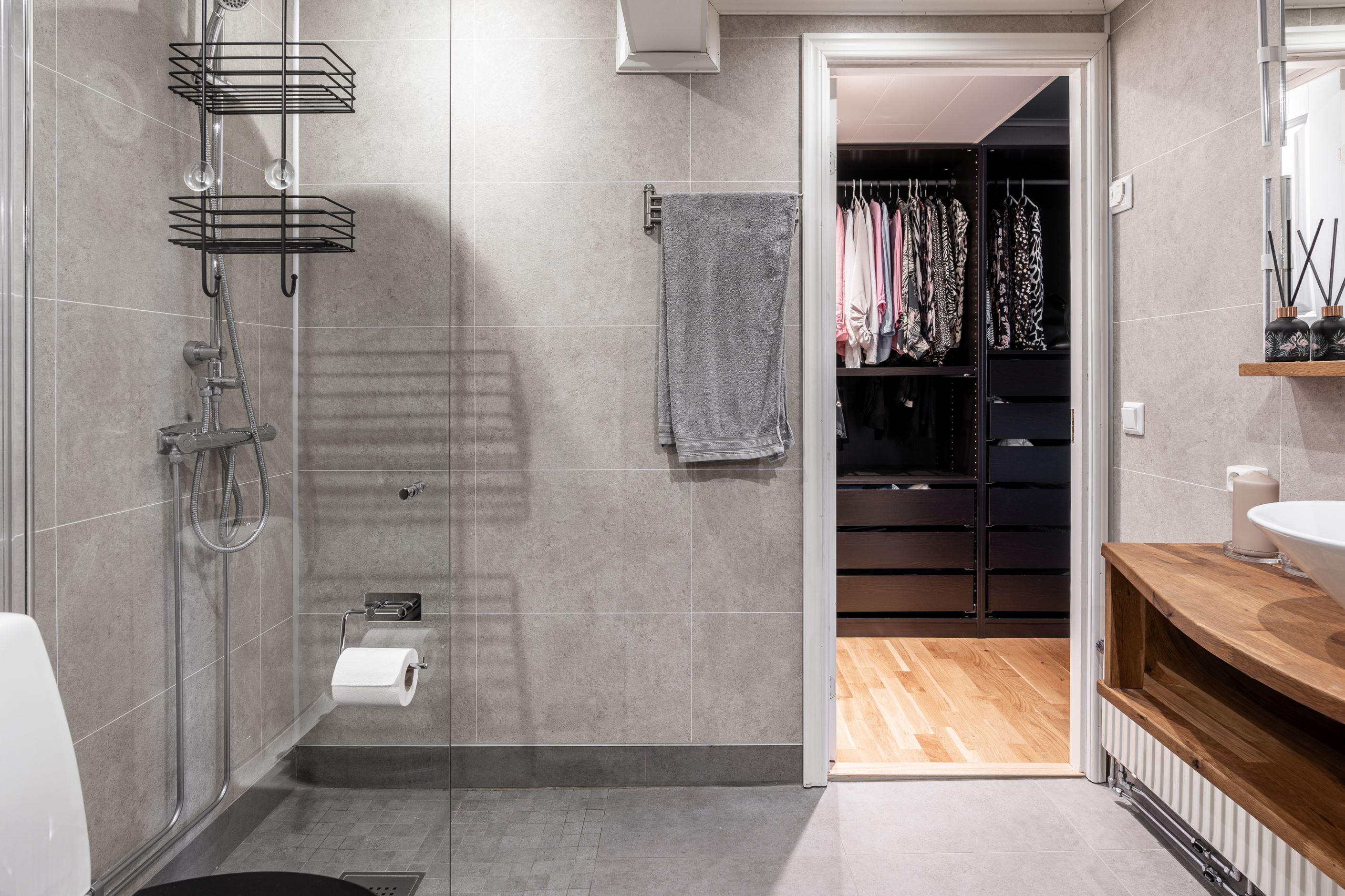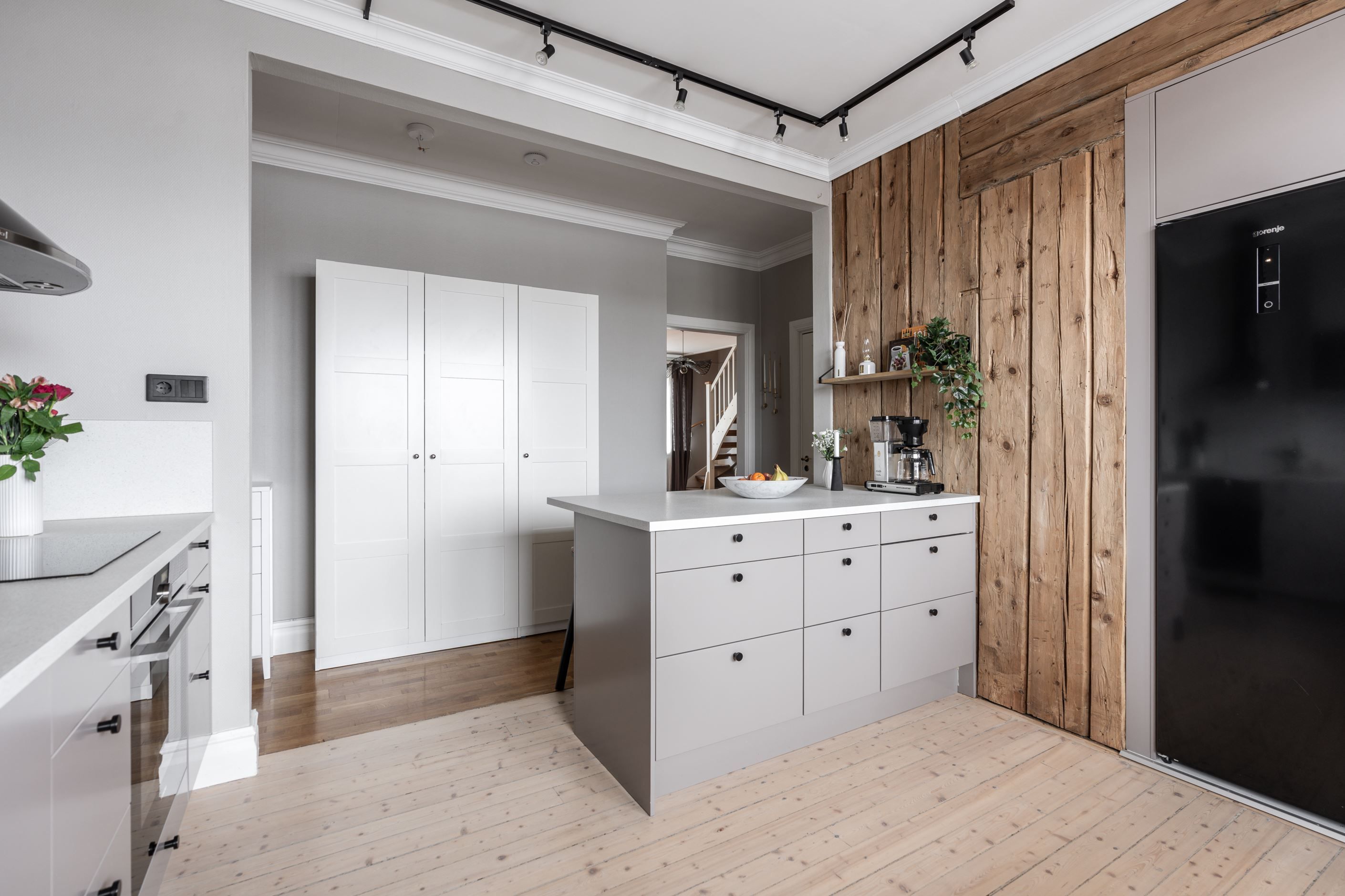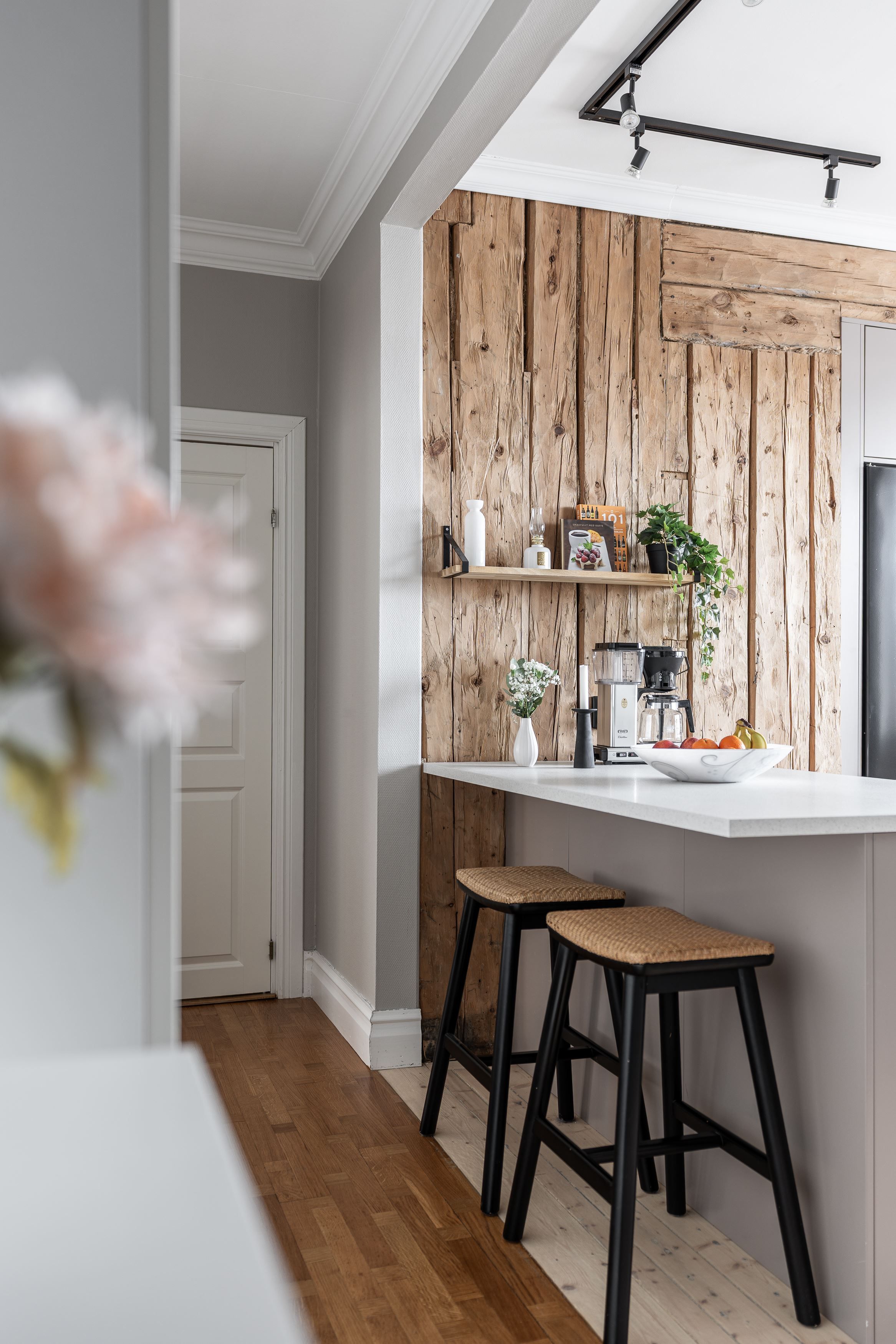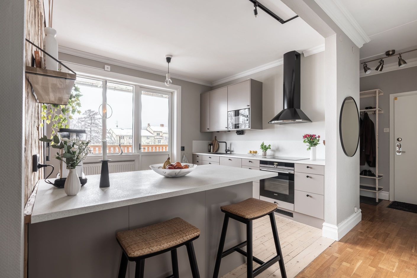 Entréplanet välkomnar dig med en ljus hall som leder vidare till bostadens första badrum, stilrent inrett med badkar, golvvärme, WC och kommod. I det renoverade köket möts modern funktion och rustik känsla – den exponerade timmerväggen skapar en unik atmosfär. Här finns gott om arbetsytor, smart förvaring och en praktisk köksö – dessutom direkt utgång till balkongen, där du kan njuta av solen från tidig förmiddag till sen kväll.