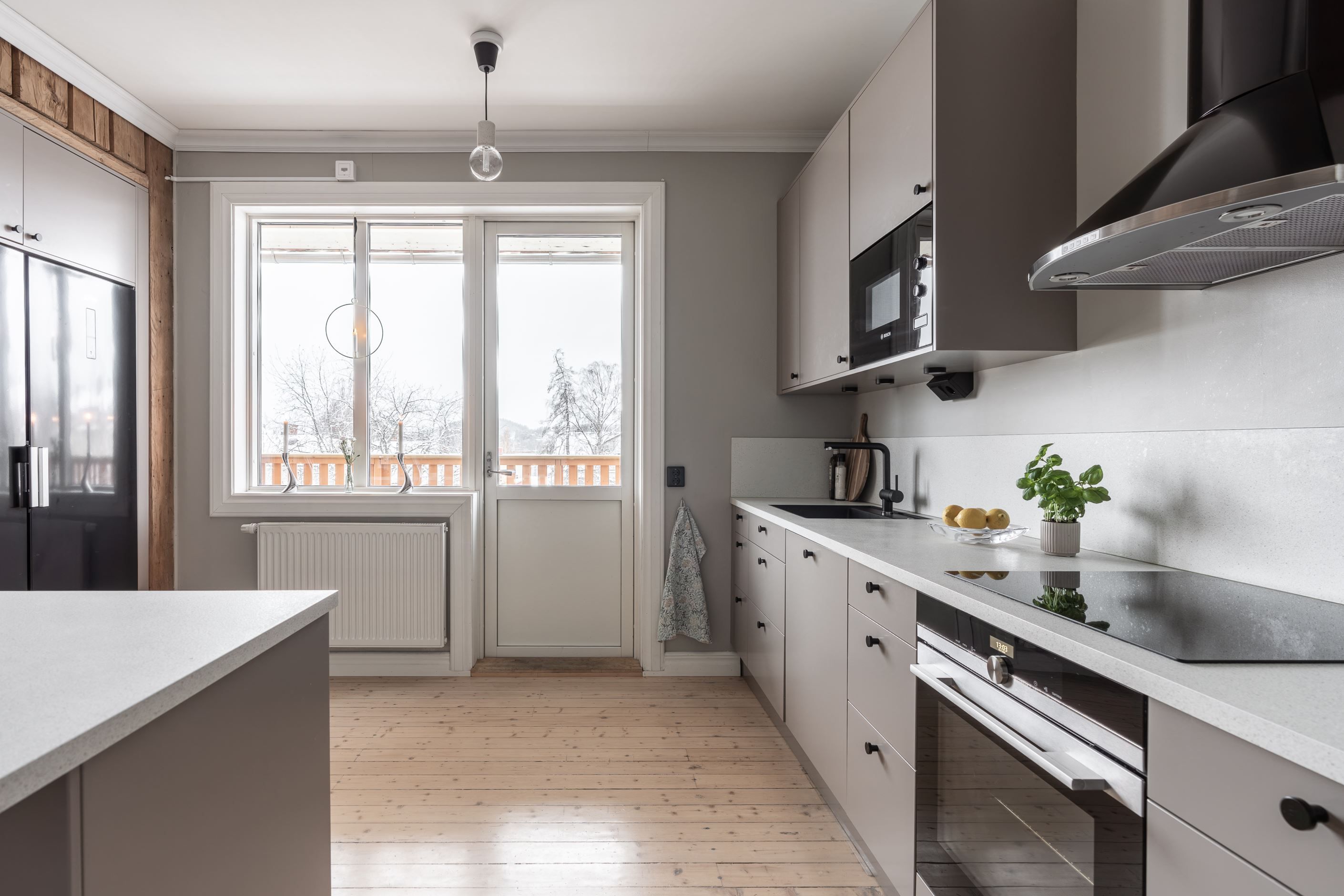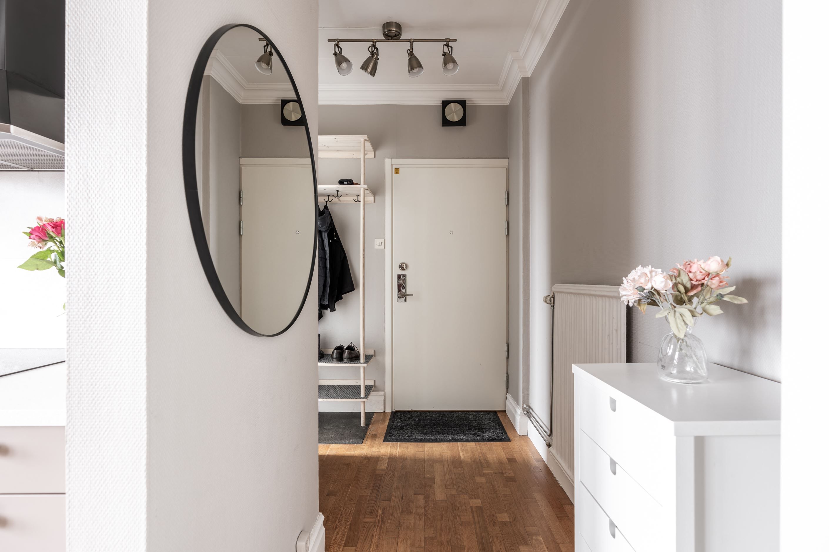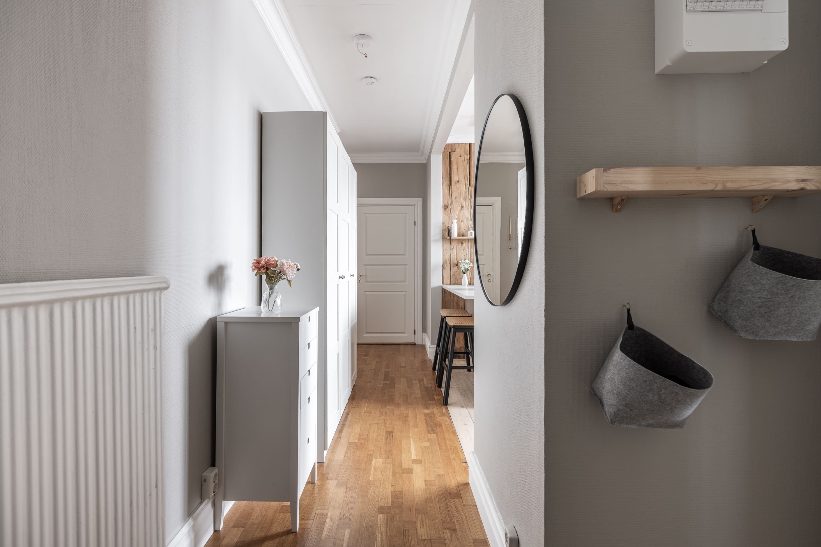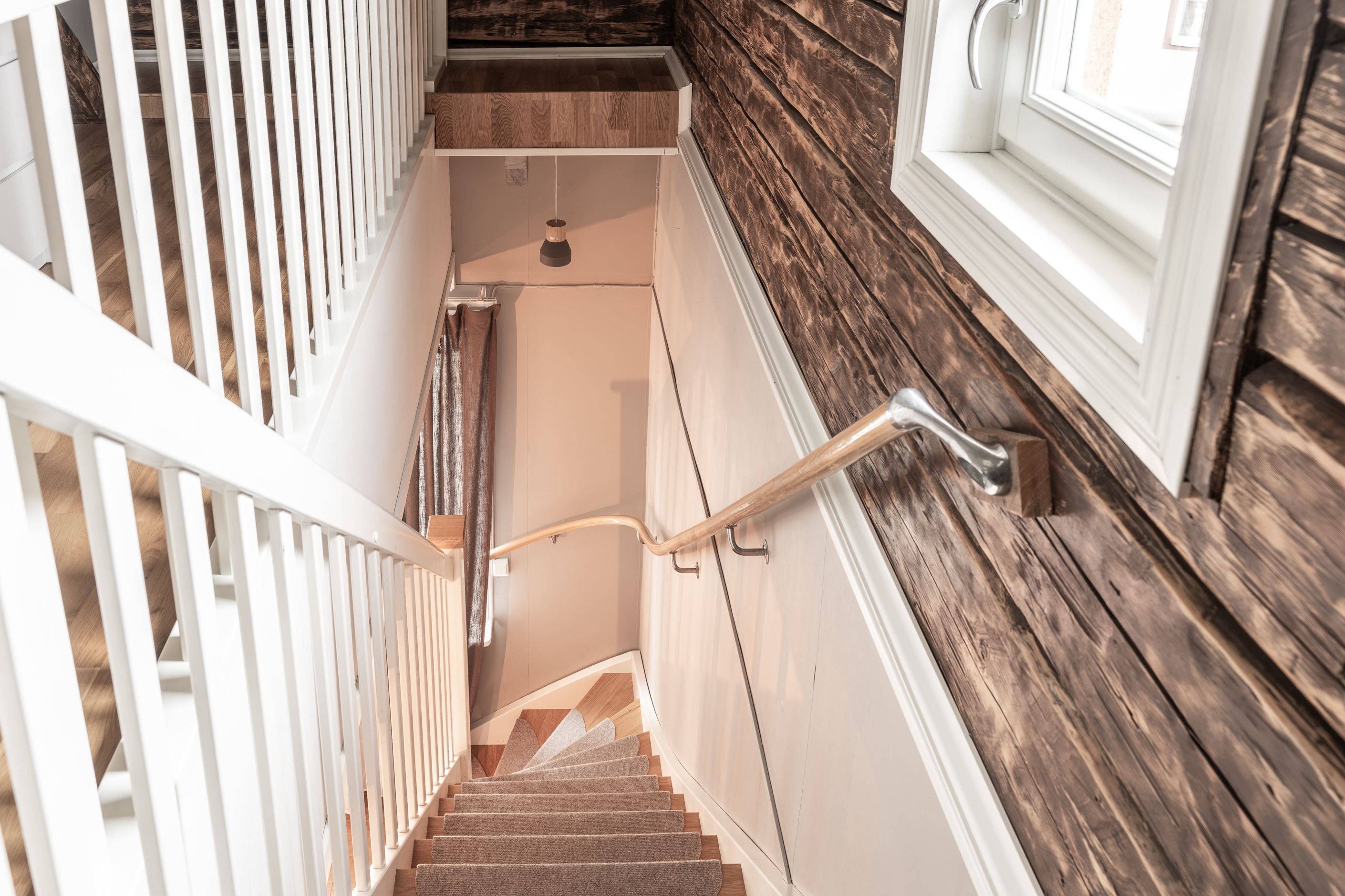 Entréplanet välkomnar dig med en ljus hall som leder vidare till bostadens första badrum, stilrent inrett med badkar, golvvärme, WC och kommod. I det renoverade köket möts modern funktion och rustik känsla – den exponerade timmerväggen skapar en unik atmosfär. Här finns gott om arbetsytor, smart förvaring och en praktisk köksö – dessutom direkt utgång till balkongen, där du kan njuta av solen från tidig förmiddag till sen kväll.