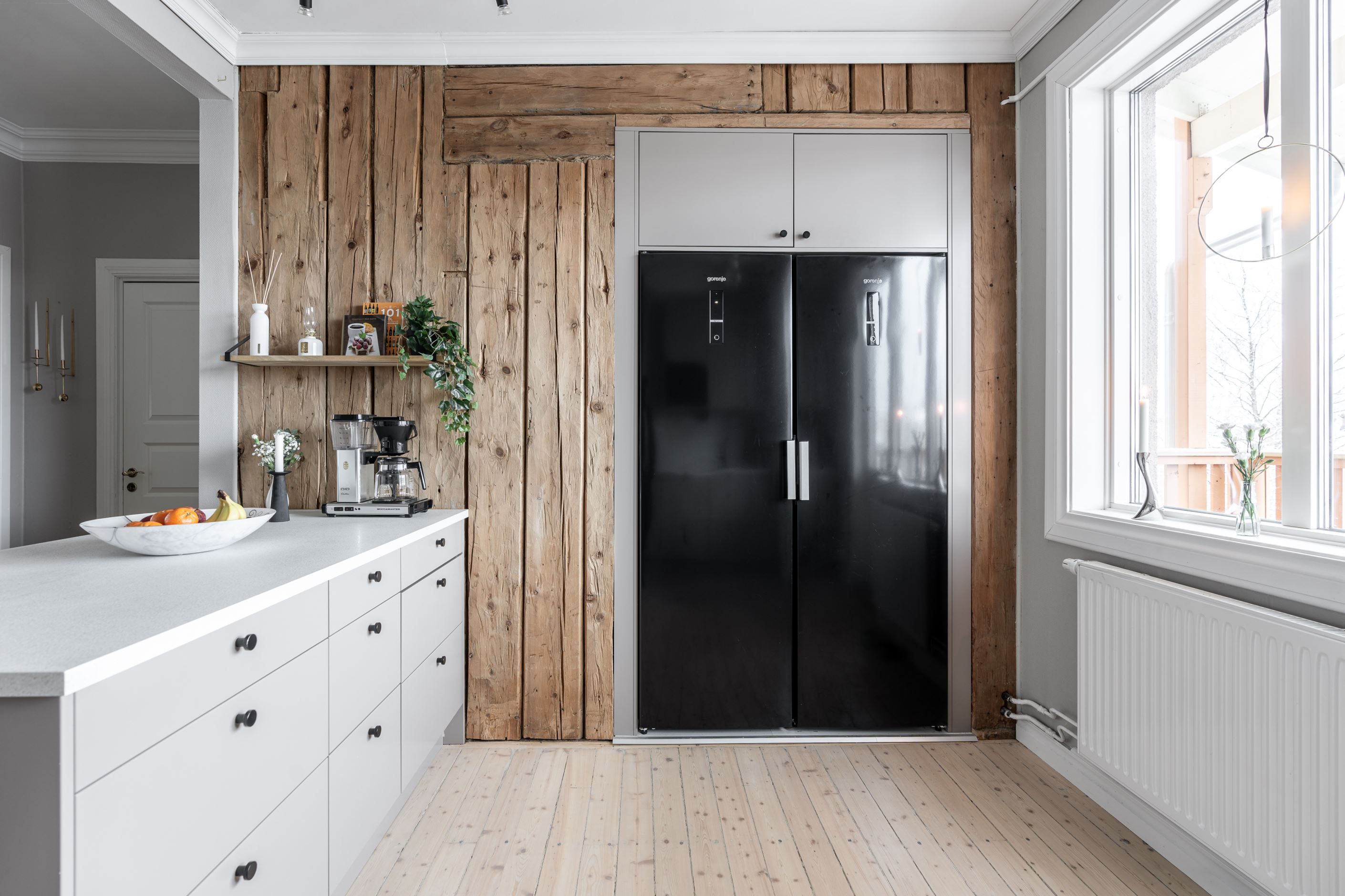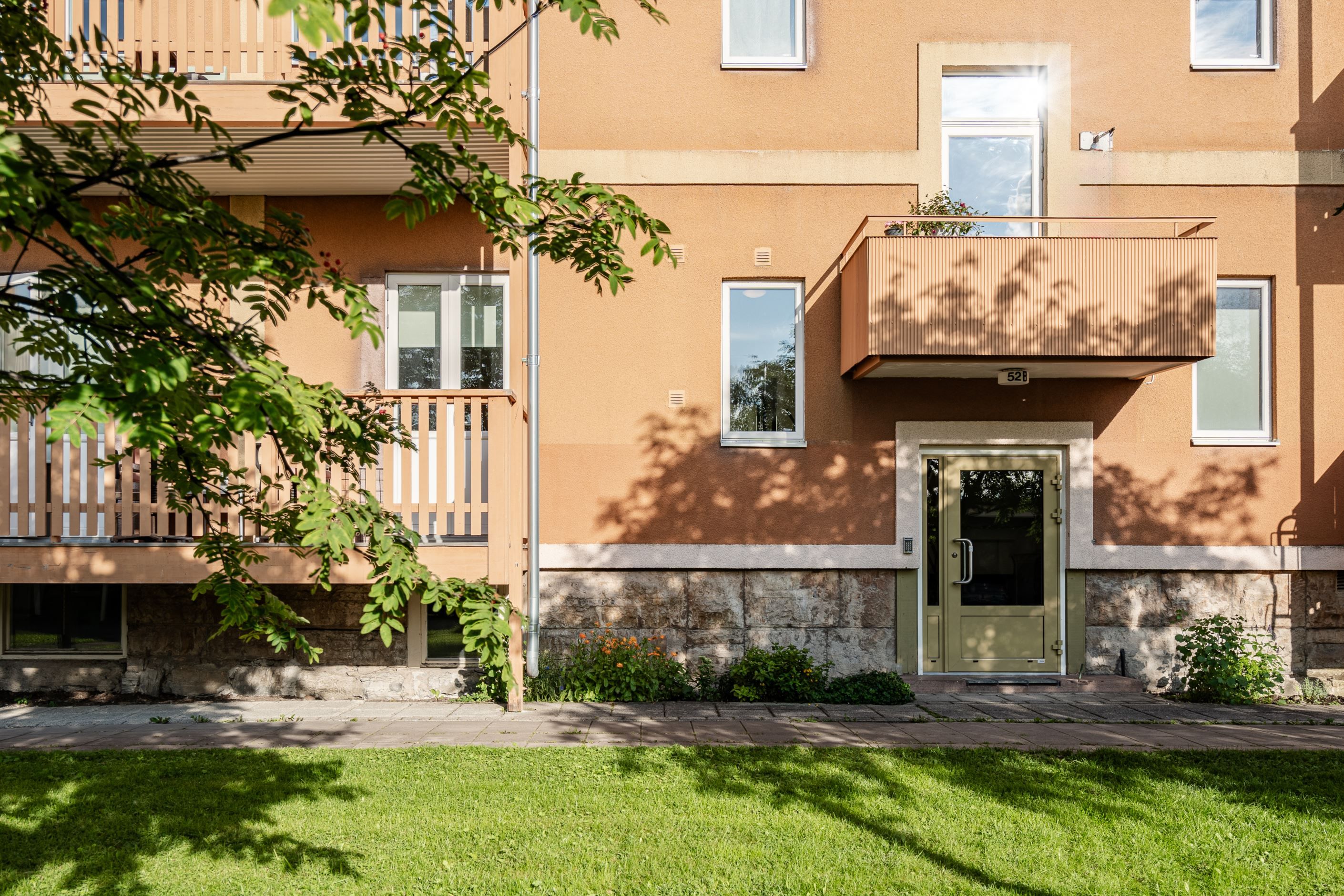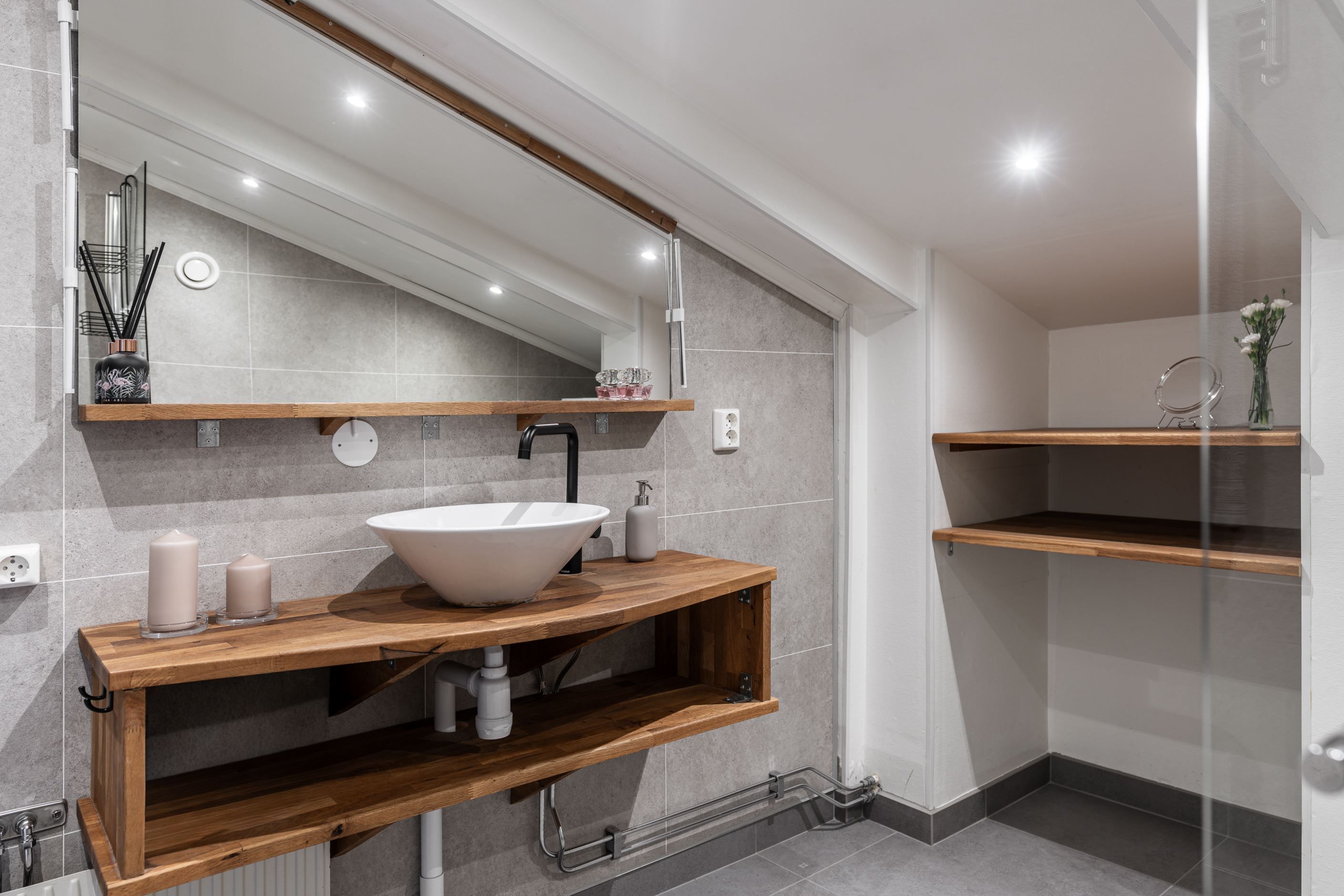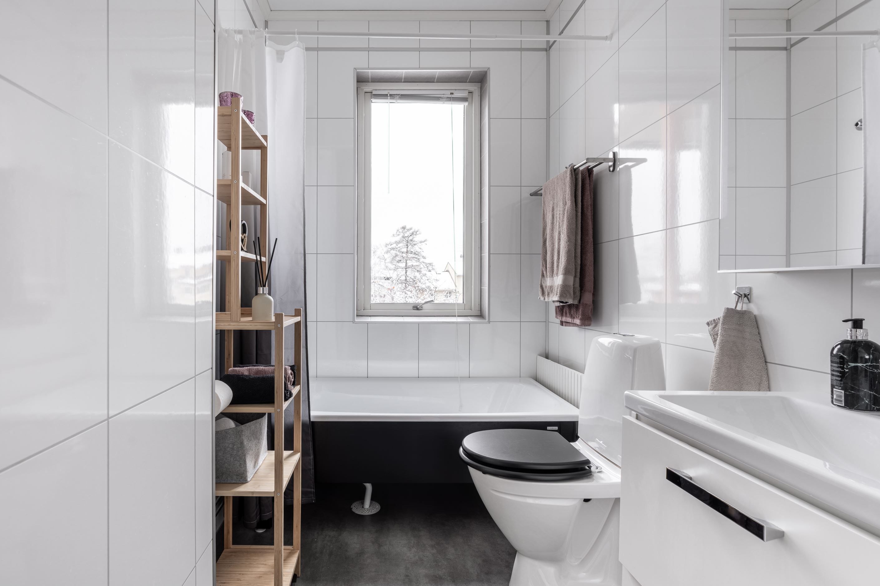 Entréplanet välkomnar dig med en ljus hall som leder vidare till bostadens första badrum, stilrent inrett med badkar, golvvärme, WC och kommod. I det renoverade köket möts modern funktion och rustik känsla – den exponerade timmerväggen skapar en unik atmosfär. Här finns gott om arbetsytor, smart förvaring och en praktisk köksö – dessutom direkt utgång till balkongen, där du kan njuta av solen från tidig förmiddag till sen kväll.