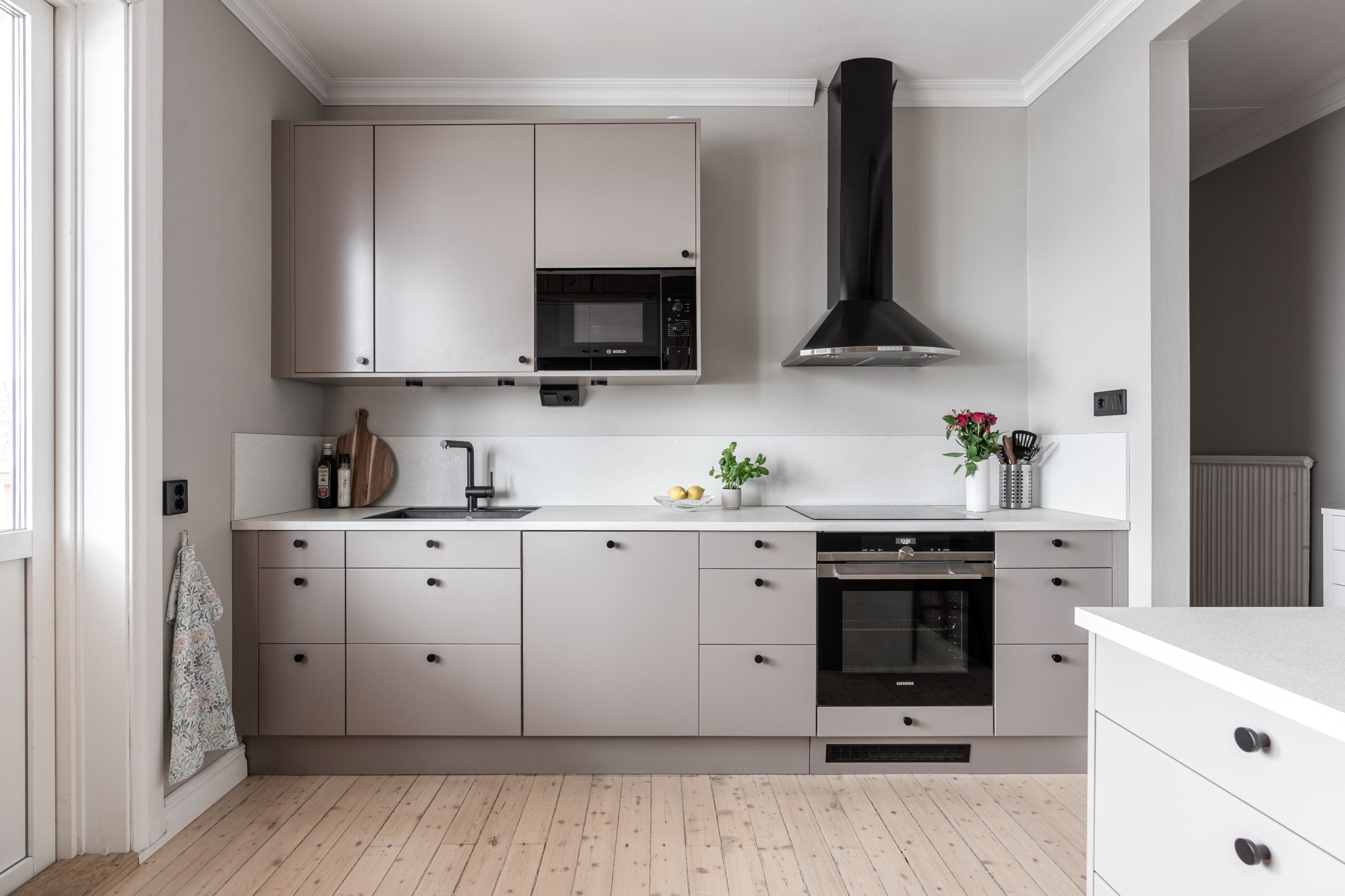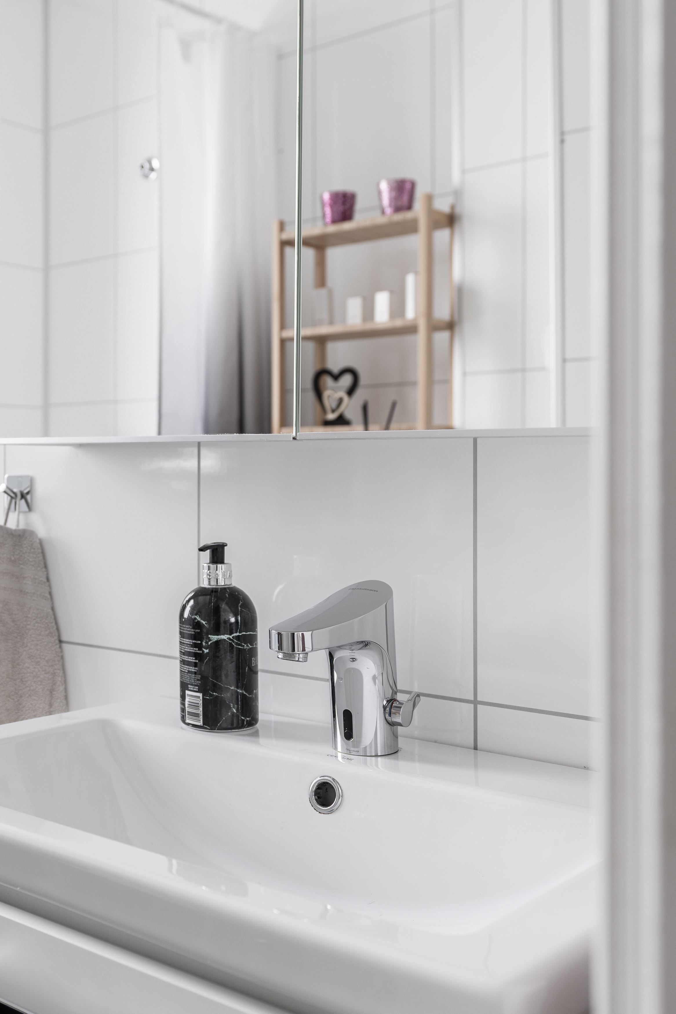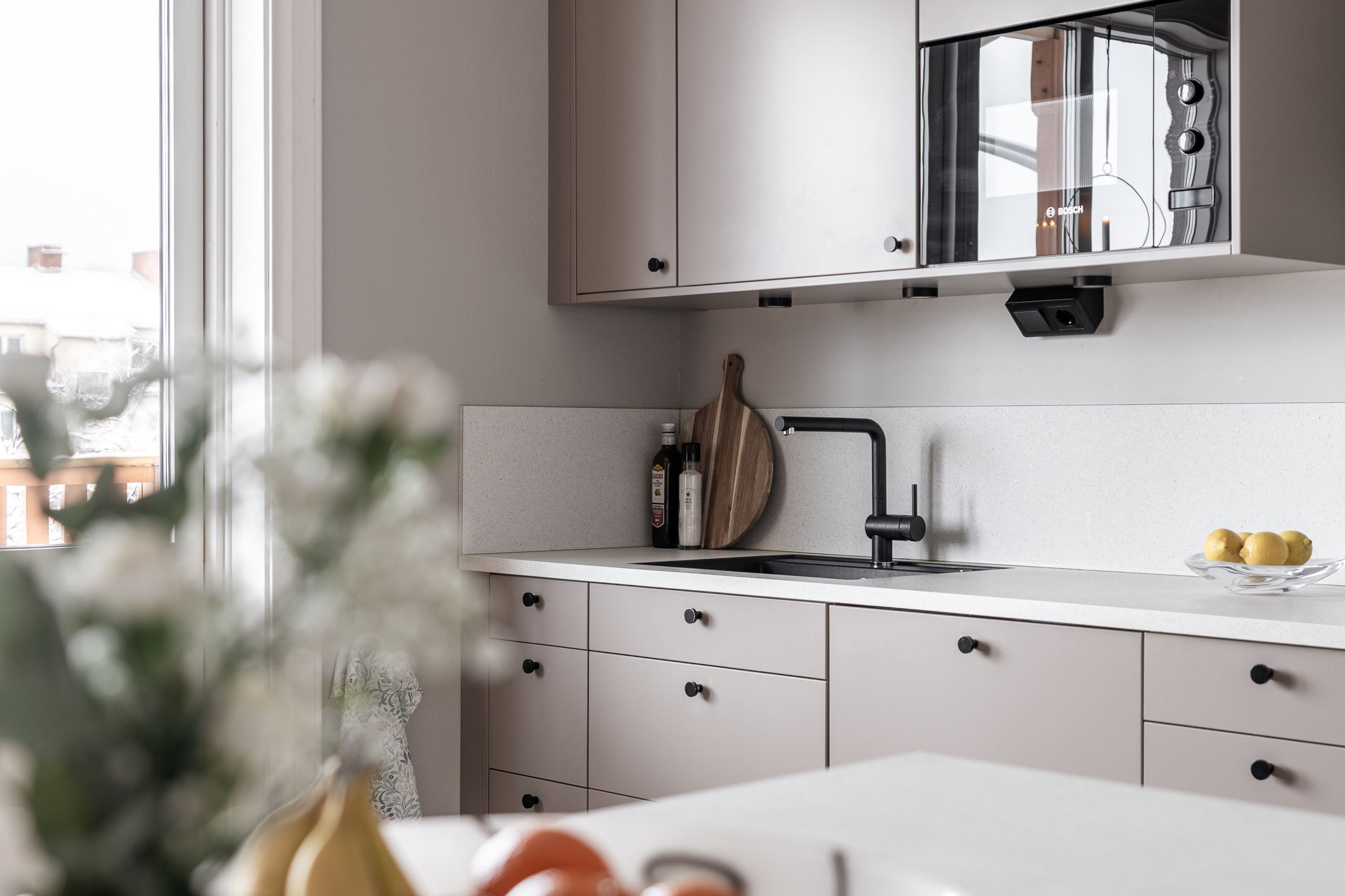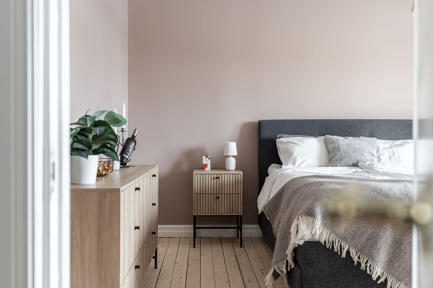 Entréplanet välkomnar dig med en ljus hall som leder vidare till bostadens första badrum, stilrent inrett med badkar, golvvärme, WC och kommod. I det renoverade köket möts modern funktion och rustik känsla – den exponerade timmerväggen skapar en unik atmosfär. Här finns gott om arbetsytor, smart förvaring och en praktisk köksö – dessutom direkt utgång till balkongen, där du kan njuta av solen från tidig förmiddag till sen kväll.