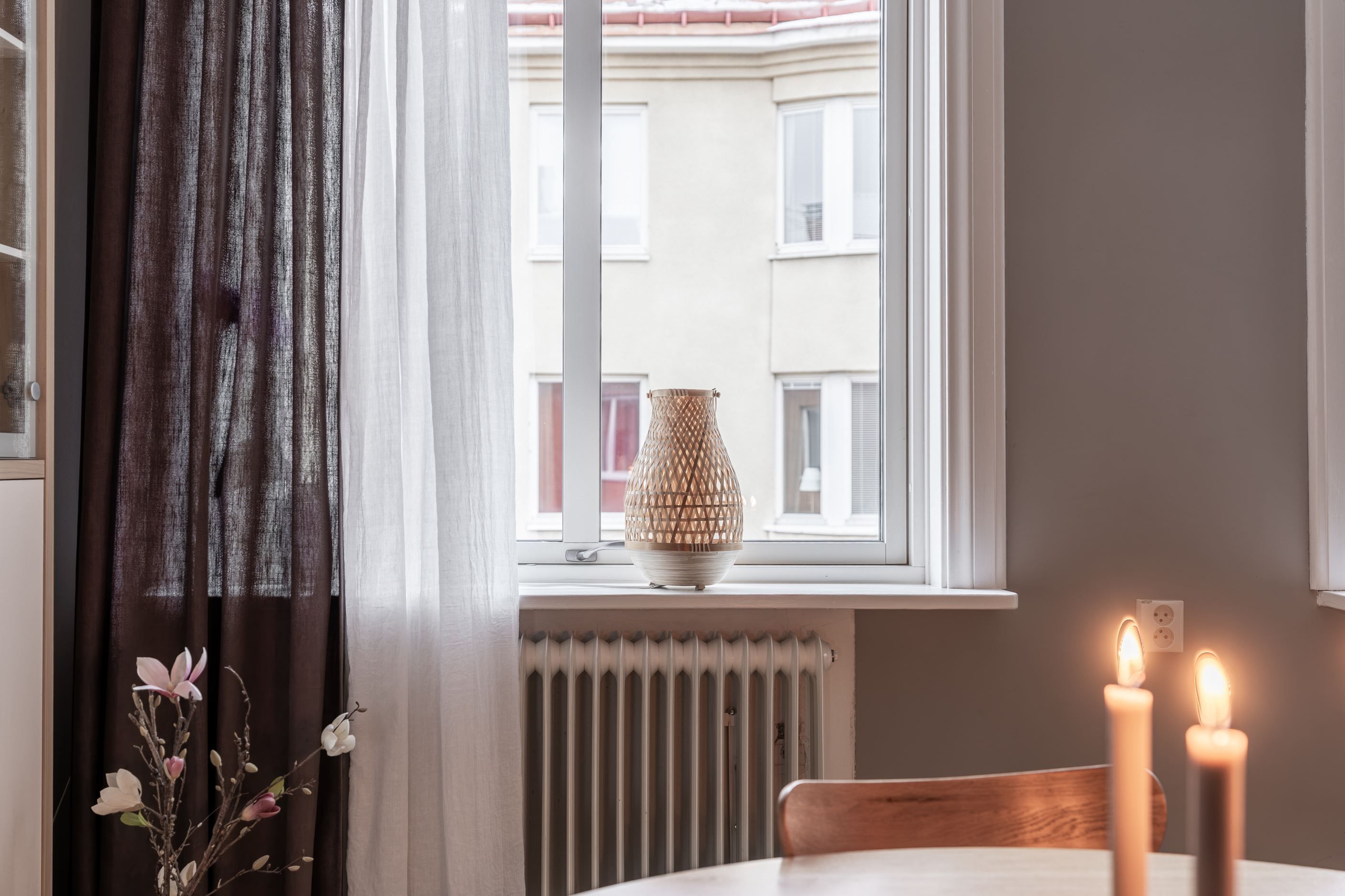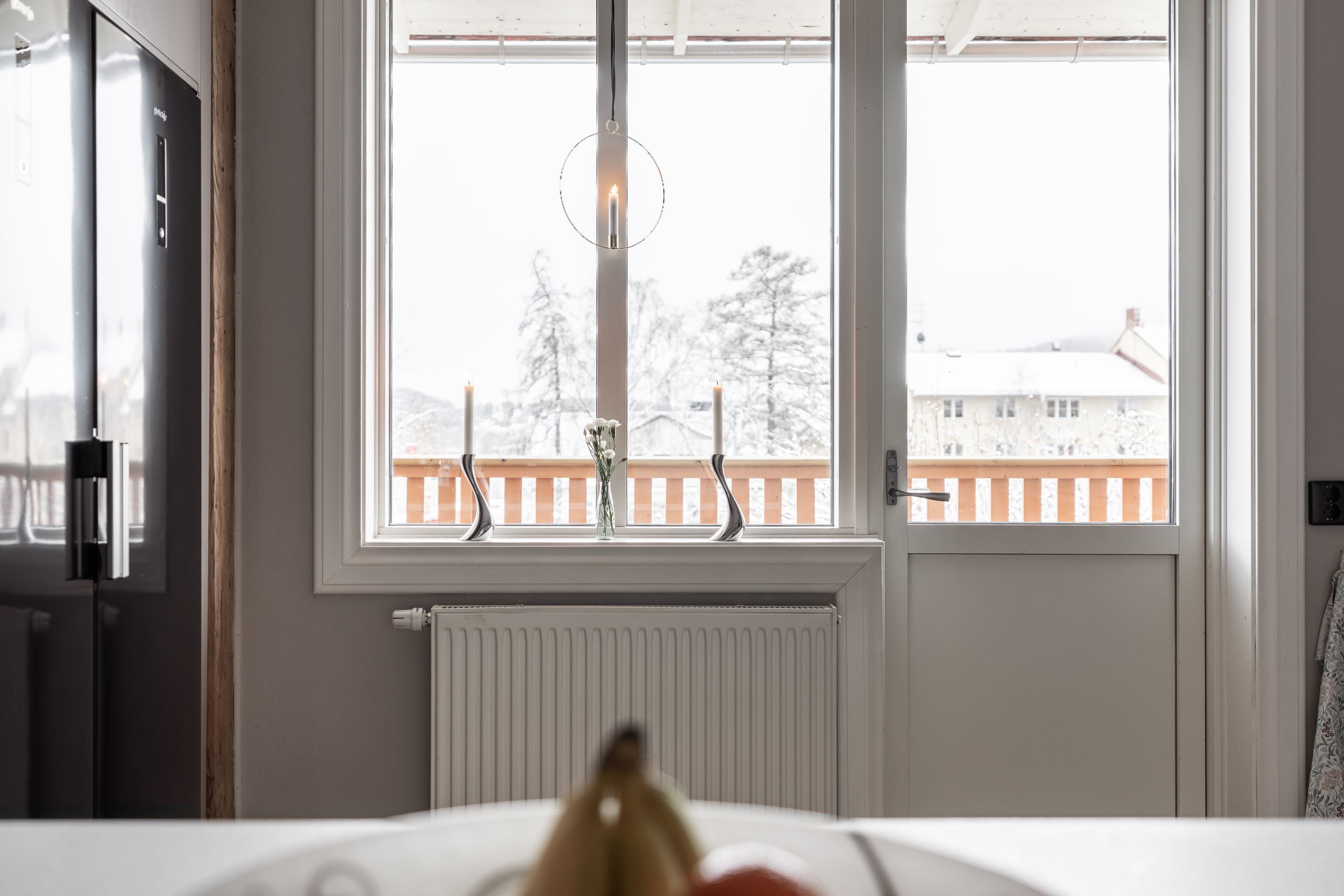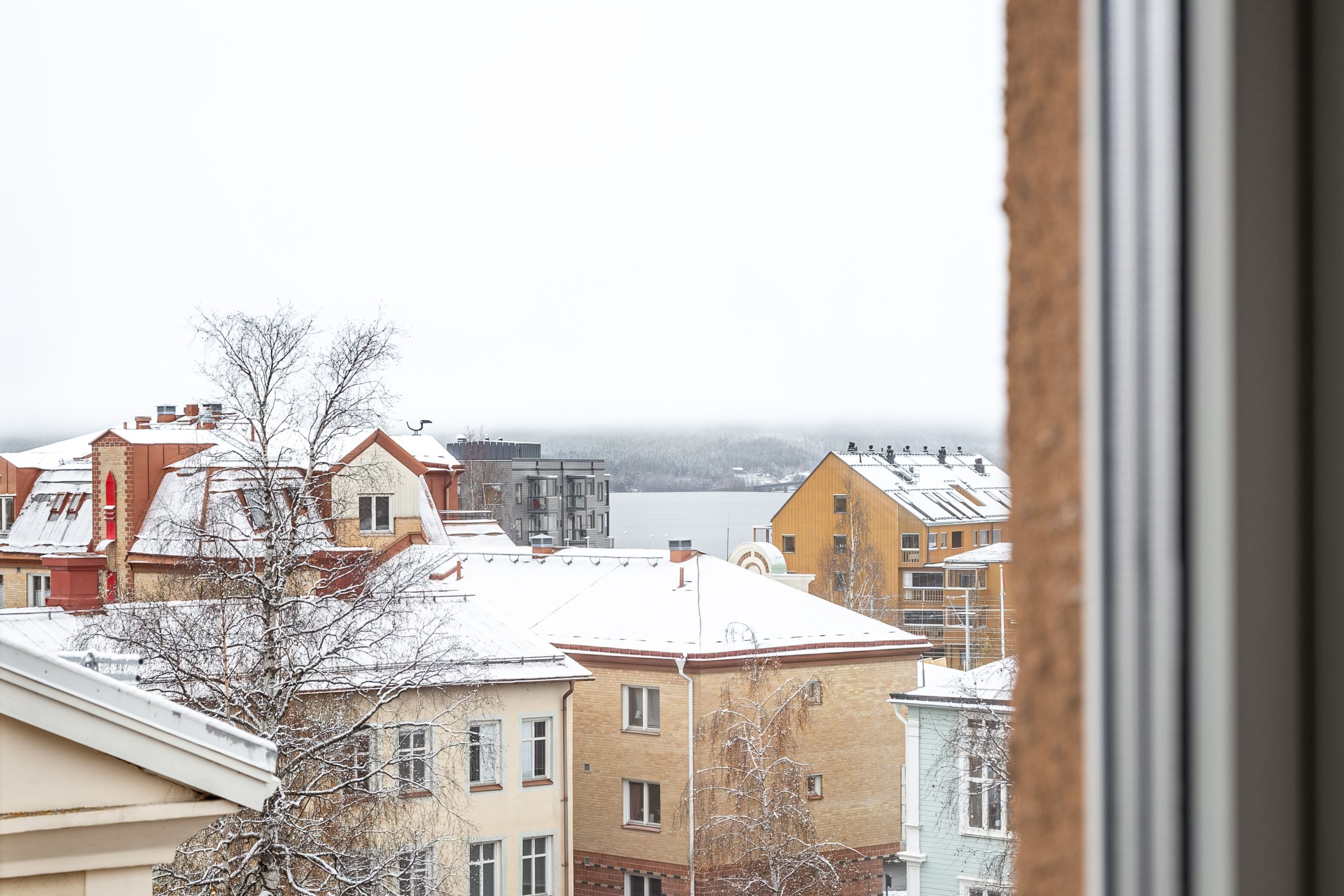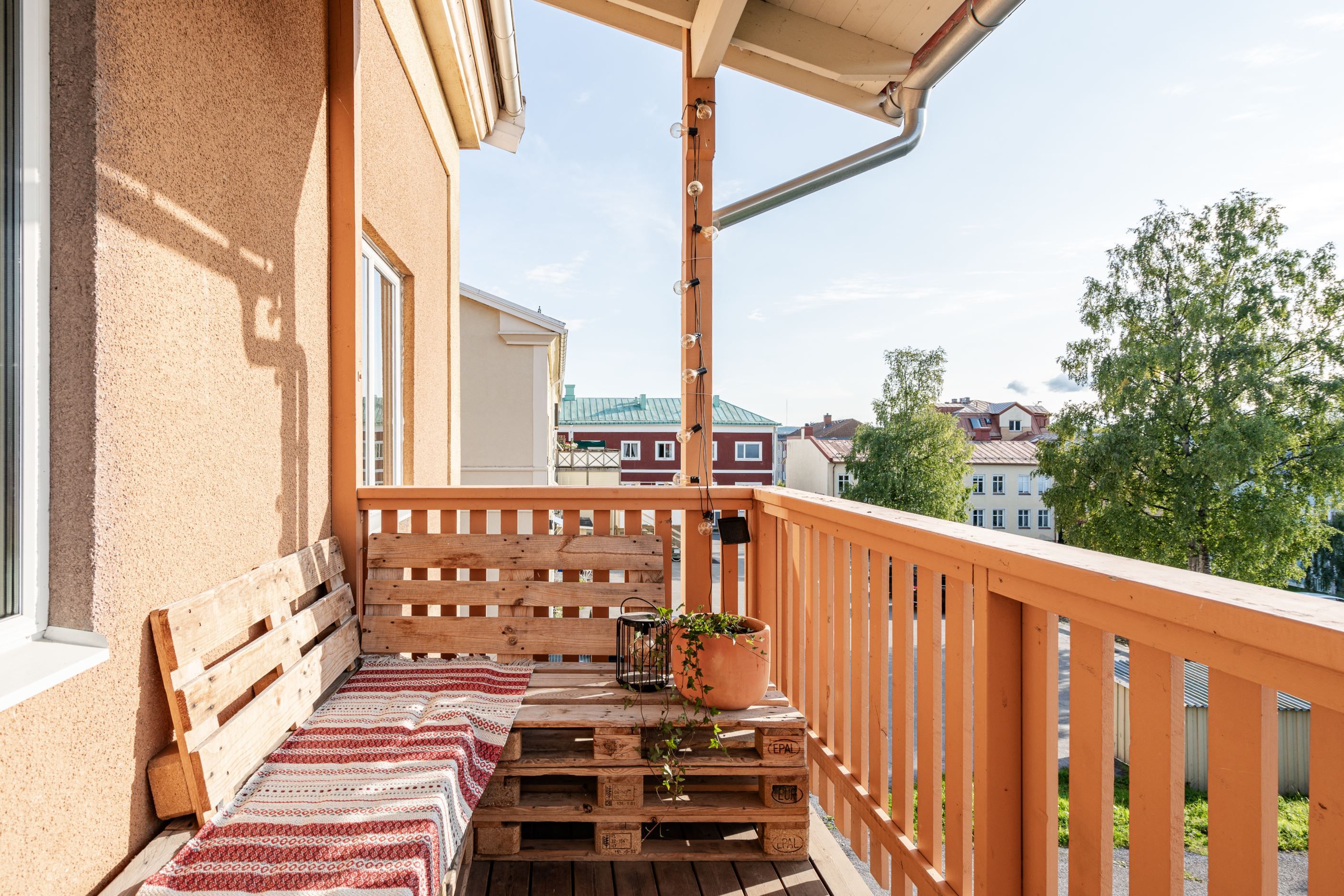 Lägenheten ligger i en vacker byggnad från 1880-talet som bjuder på högt i tak, stora fönster och massor av charm. Från den soliga balkongen i söderläge blickar du ut över Östersunds takåsar och mot Frösön – en vy som aldrig tröttnar.