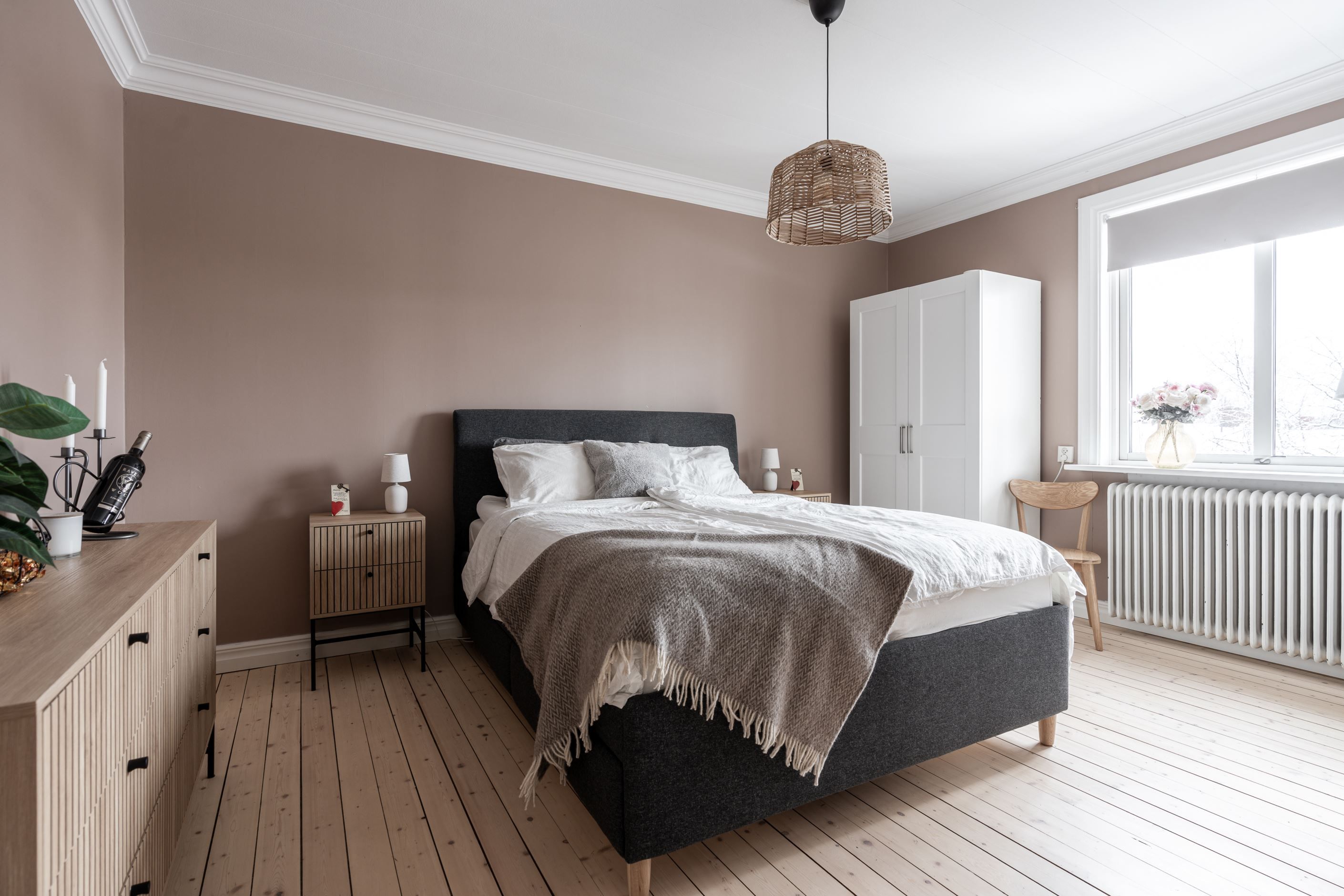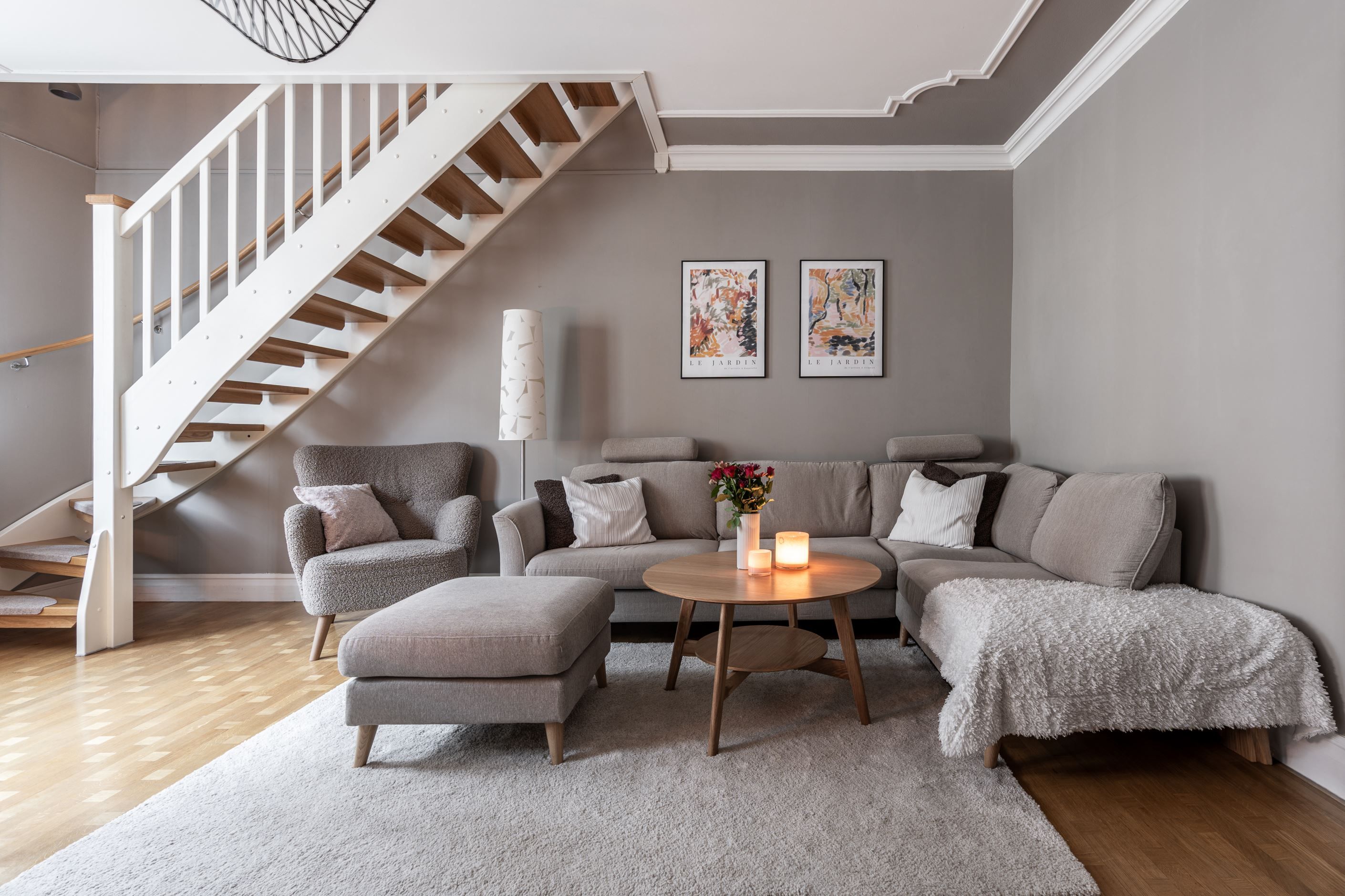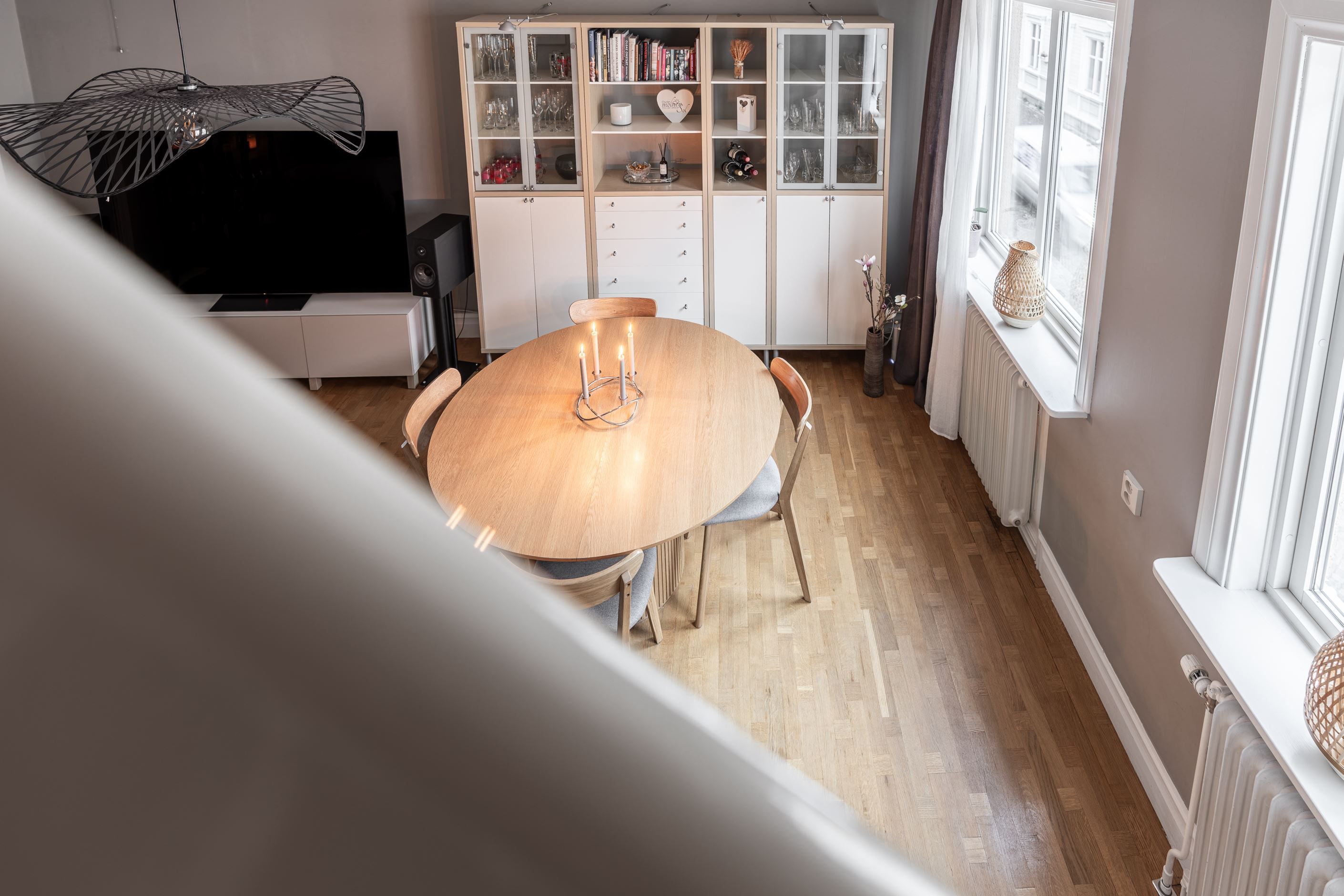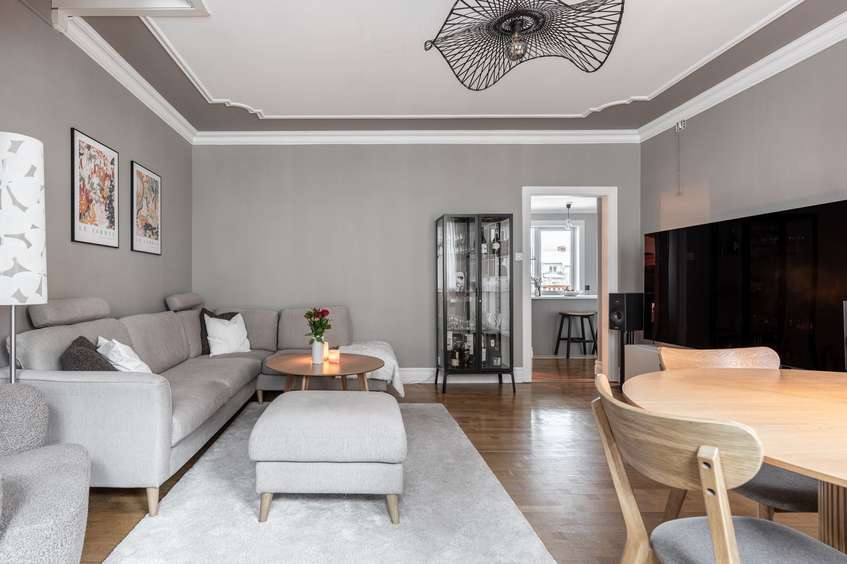 Det generösa vardagsrummet har både vacker stuckatur och dekorativa taklister. Rummet rymmer enkelt både soffgrupp och matsalsdel – perfekt för middagar och sociala kvällar. På samma plan finns ett rofyllt sovrum i harmoniska färger, skapat för riktigt bra sömn.