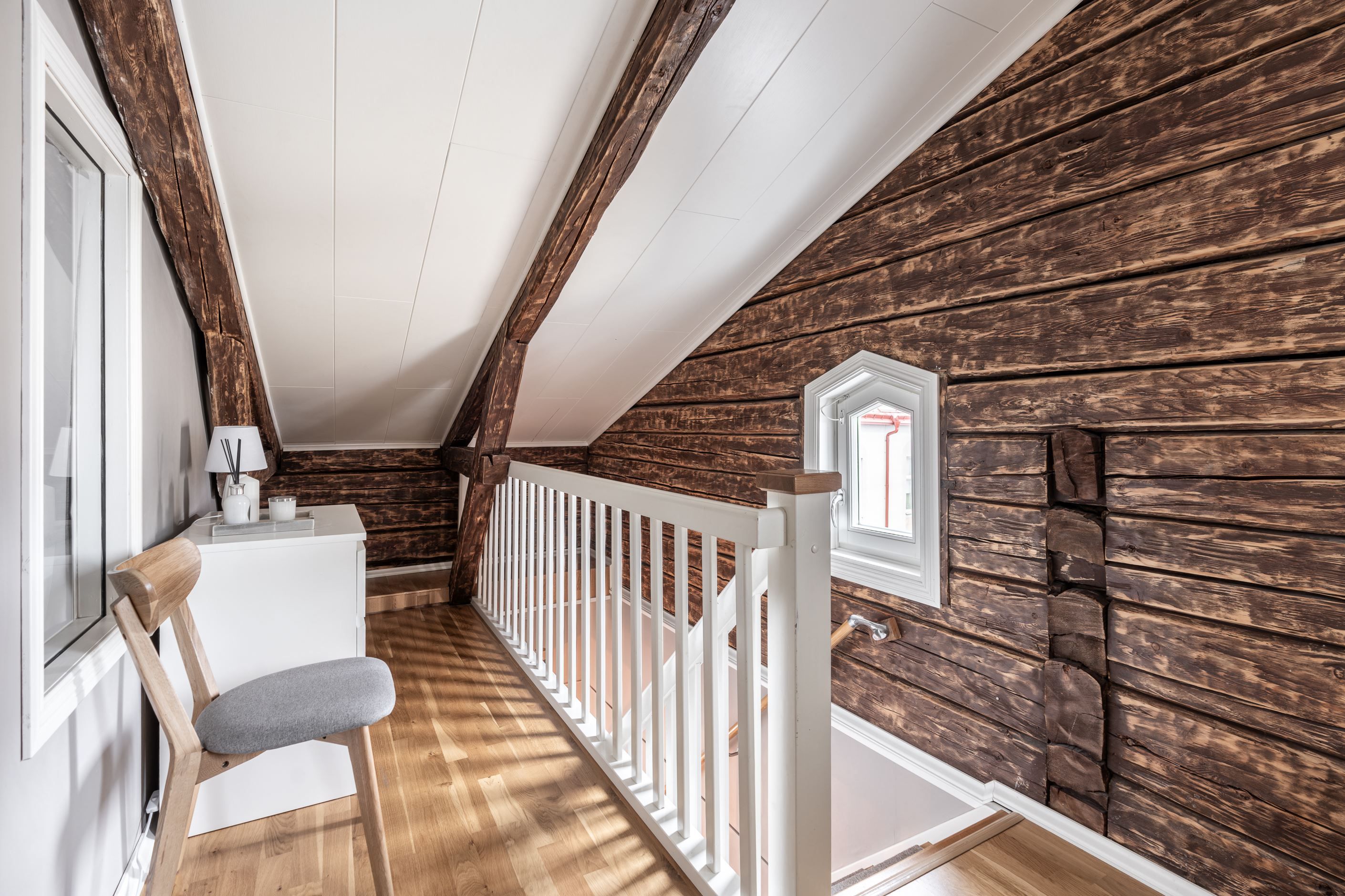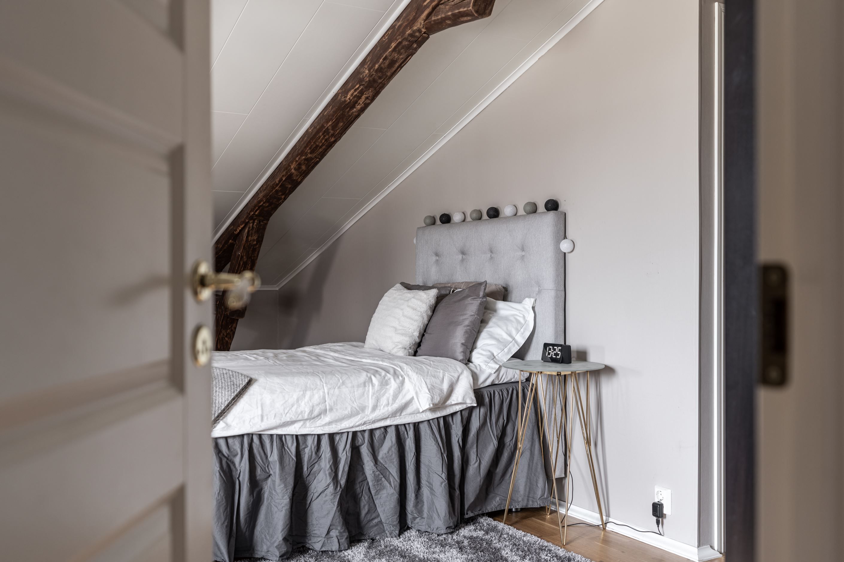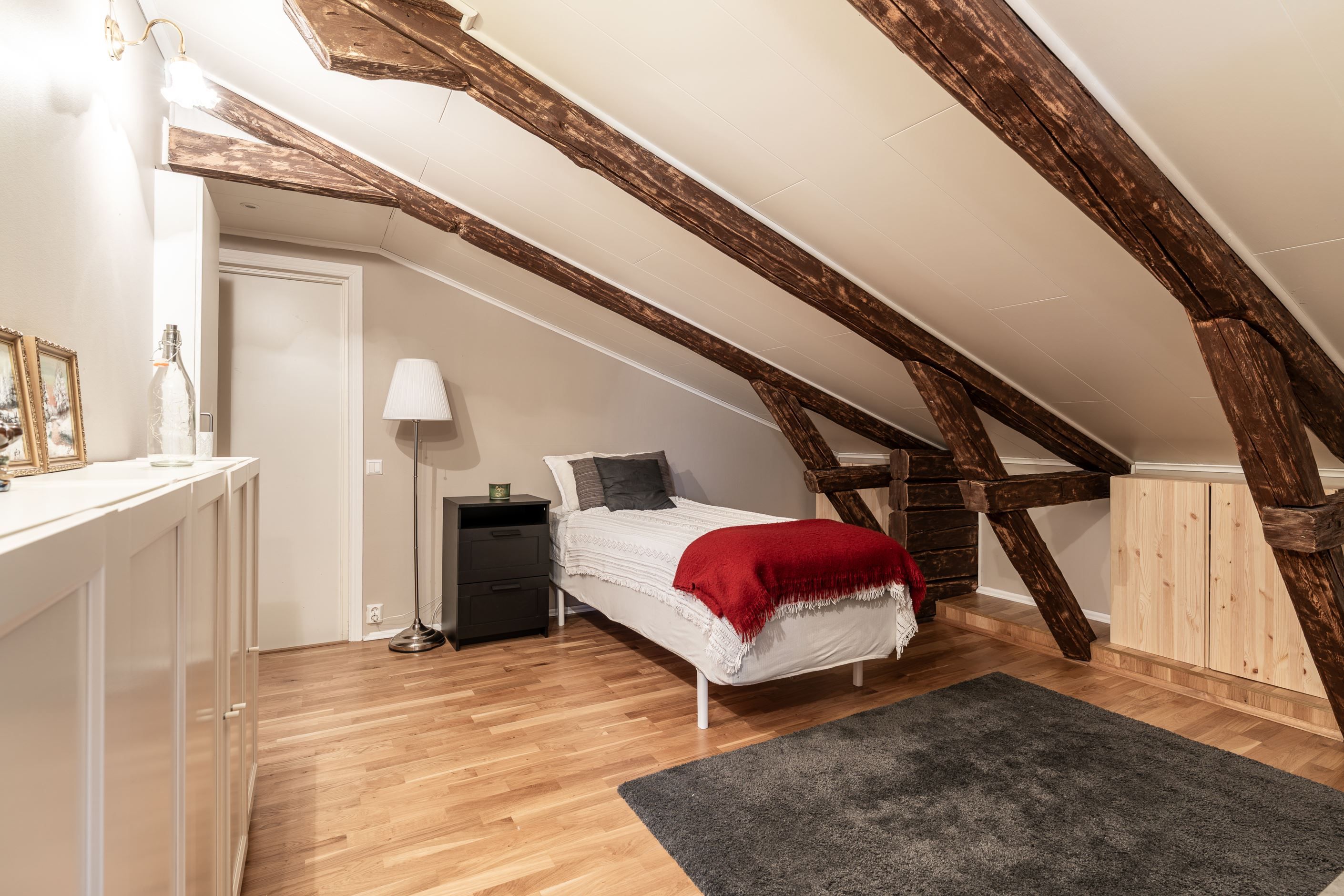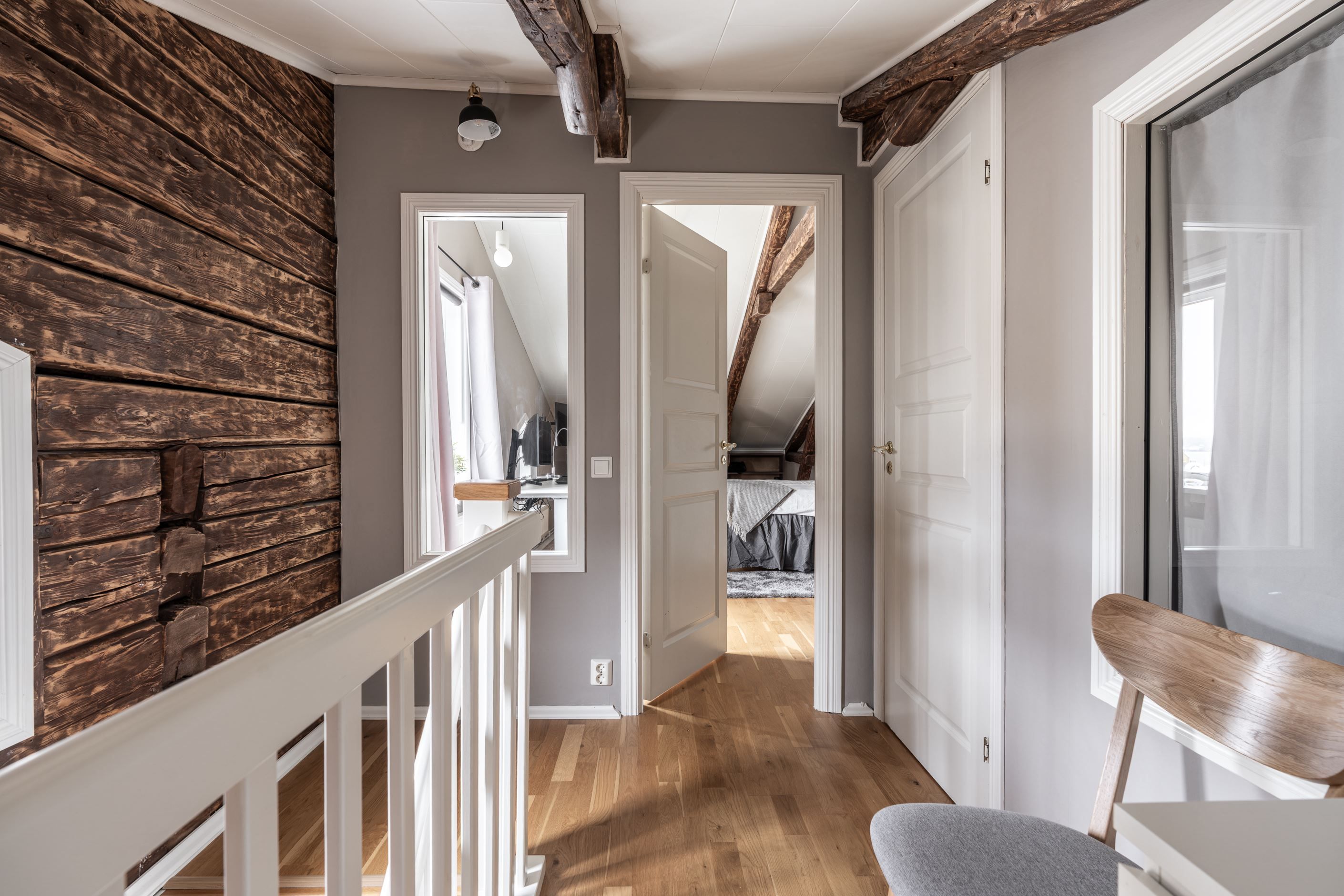 Övre plan, som tillkom 2017, bjuder på två charmiga sovrum med bevarade detaljer som synliga takbjälkar och timmerväggar. Här finns även bostadens andra badrum som renoverats ytligare under 2023 – elegant och funktionellt med golvvärme, dusch, WC, handfat och kombinerad tvättmaskin/torktumlare. Från detta plan nås även vinden och ett rymligt vinds förråd.