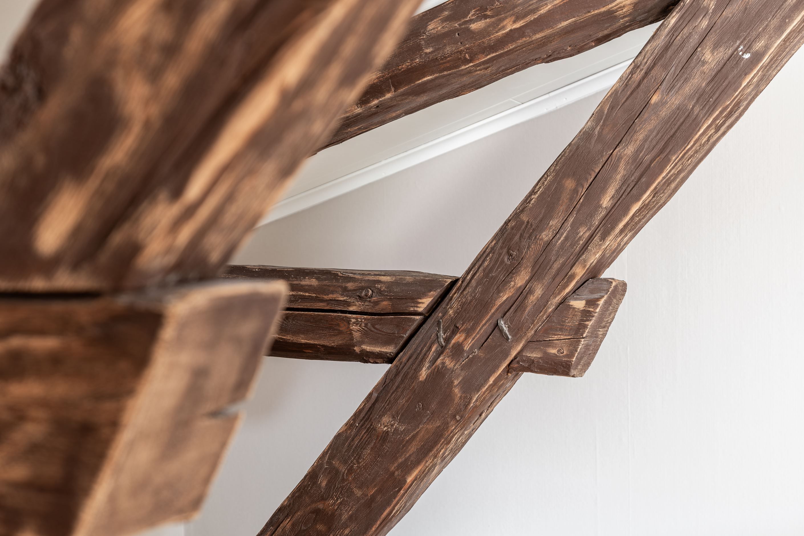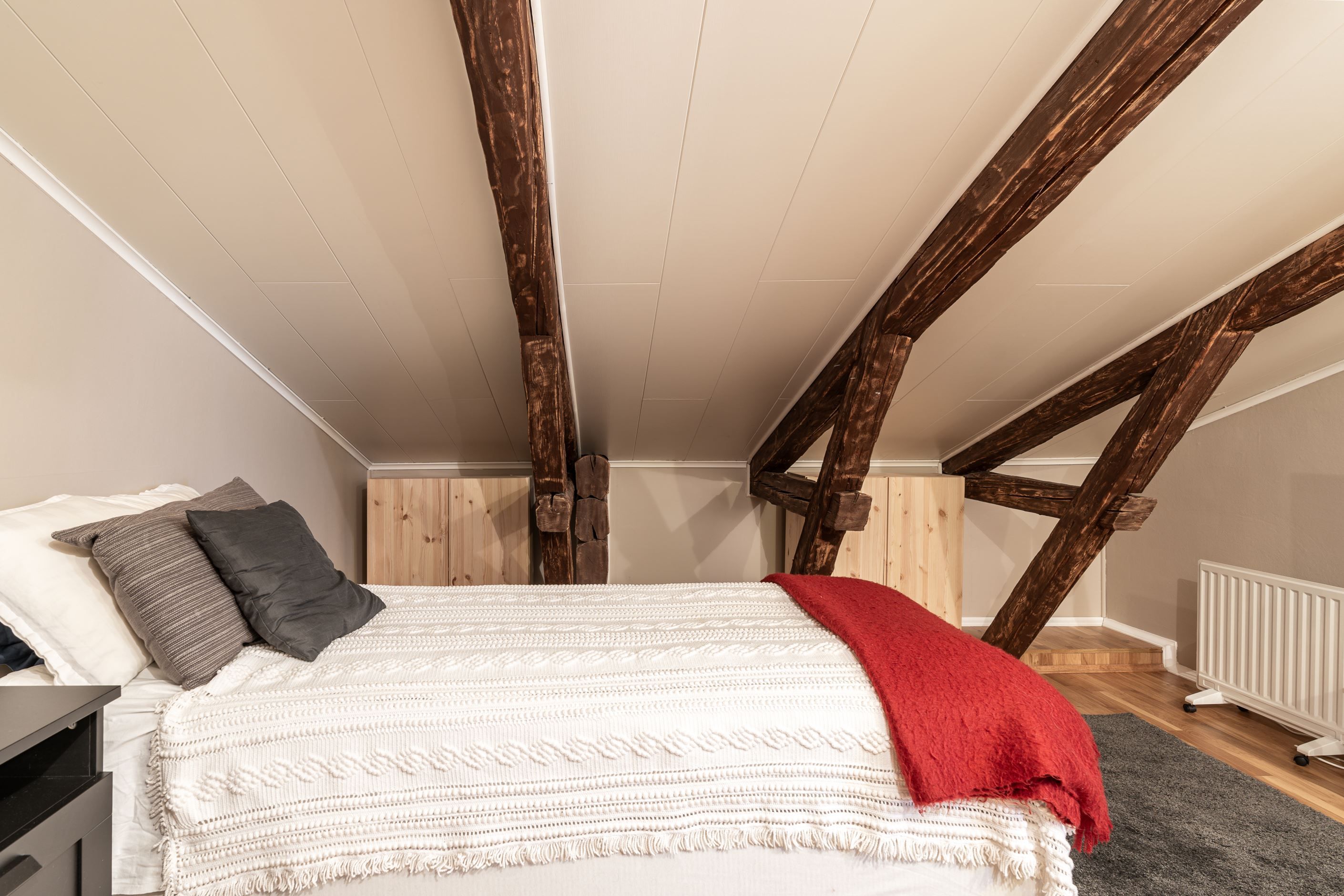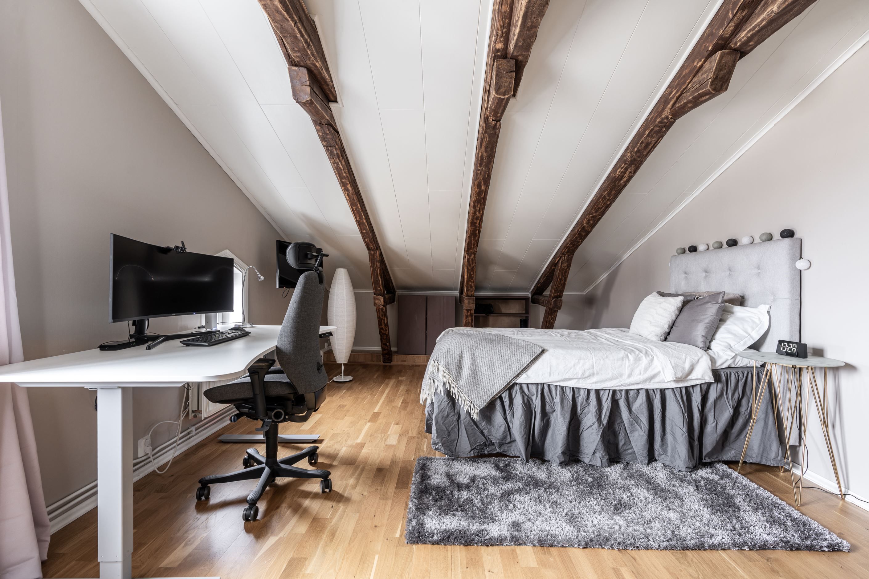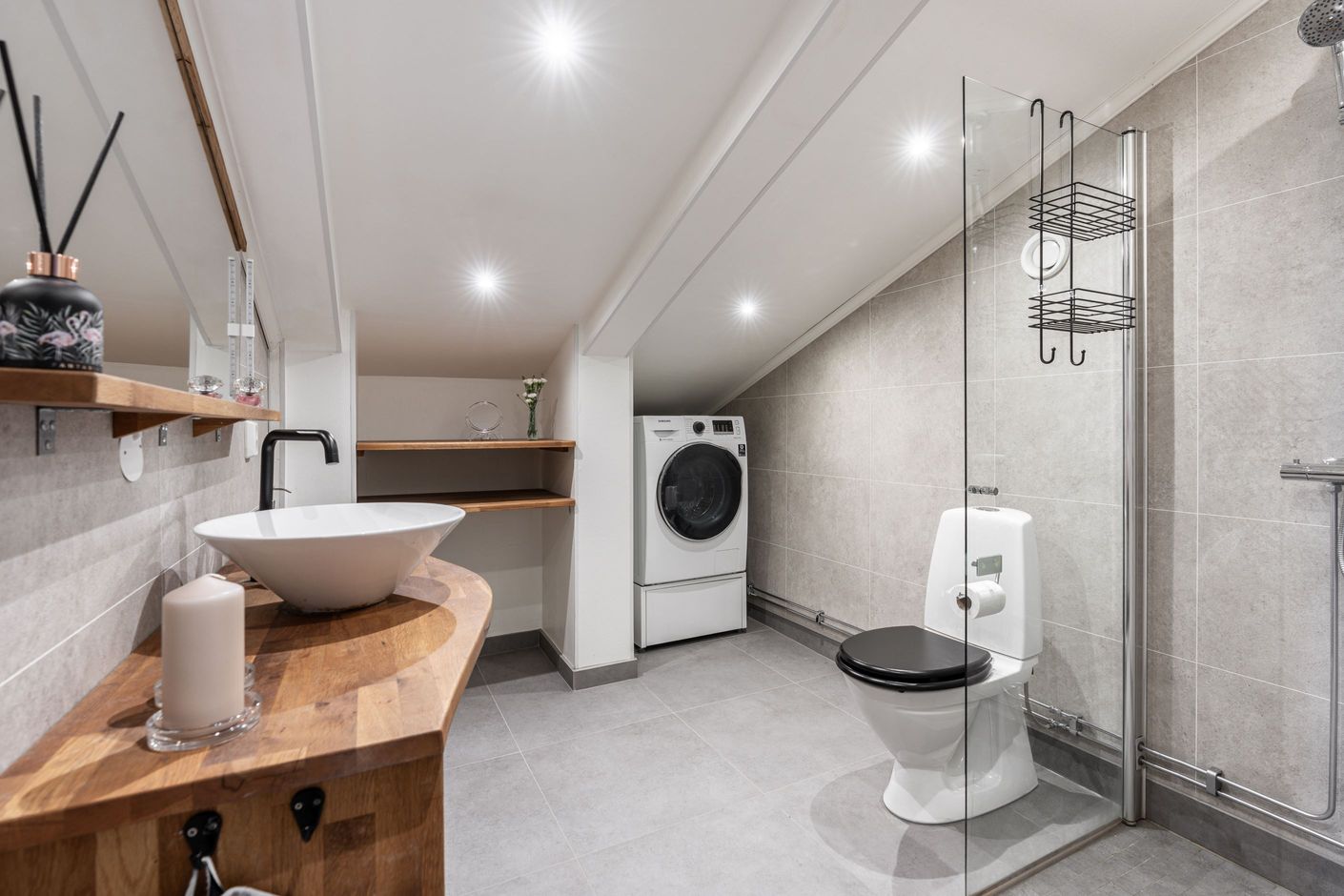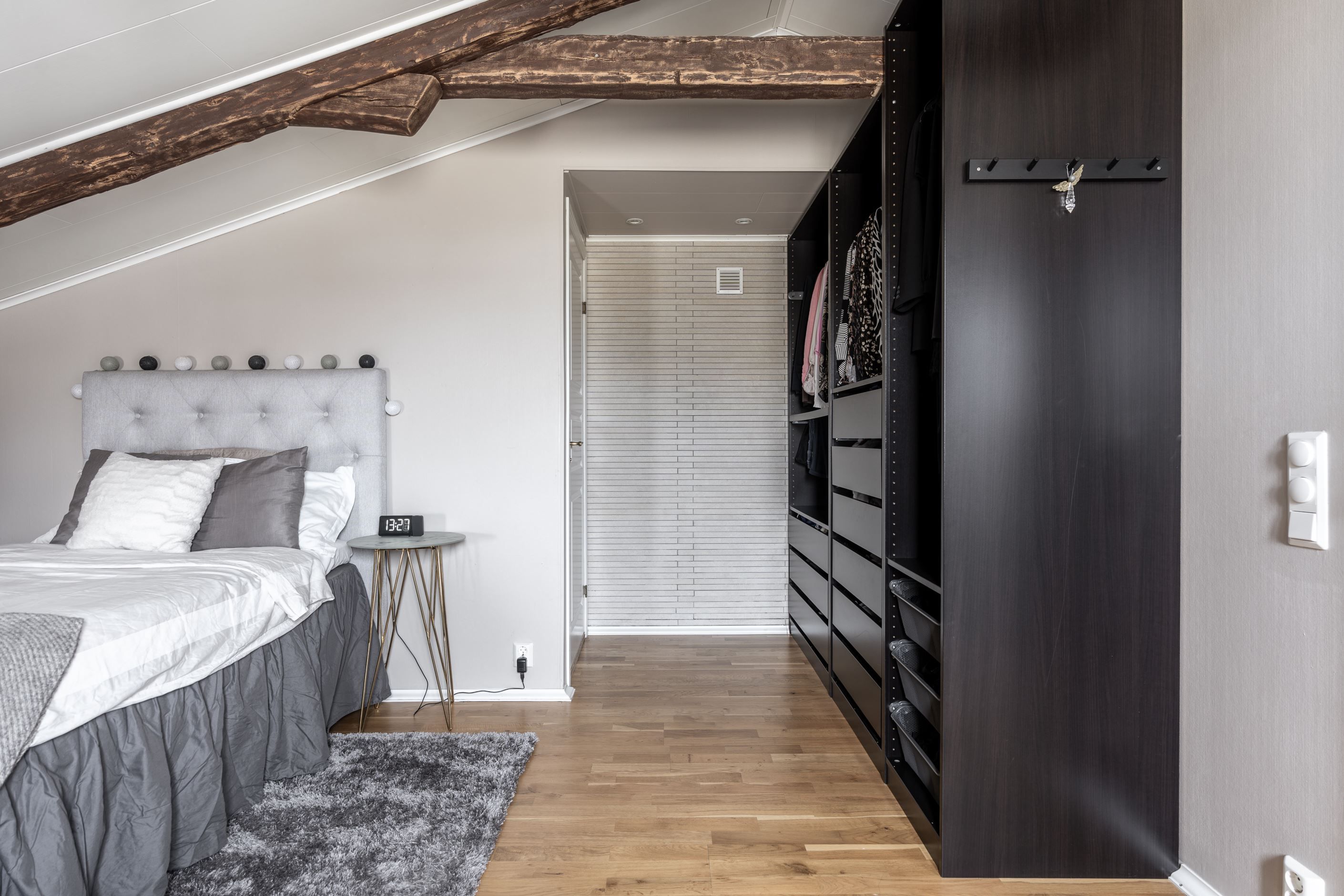 Övre plan, som tillkom 2017, bjuder på två charmiga sovrum med bevarade detaljer som synliga takbjälkar och timmerväggar. Här finns även bostadens andra badrum som renoverats ytligare under 2023 – elegant och funktionellt med golvvärme, dusch, WC, handfat och kombinerad tvättmaskin/torktumlare. Från detta plan nås även vinden och ett rymligt vinds förråd.