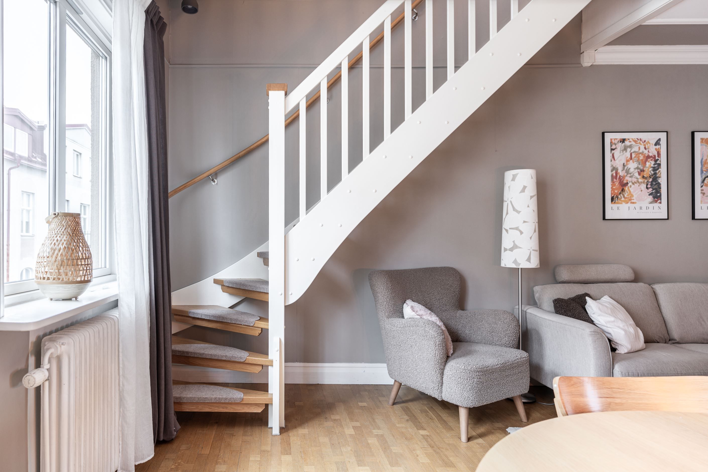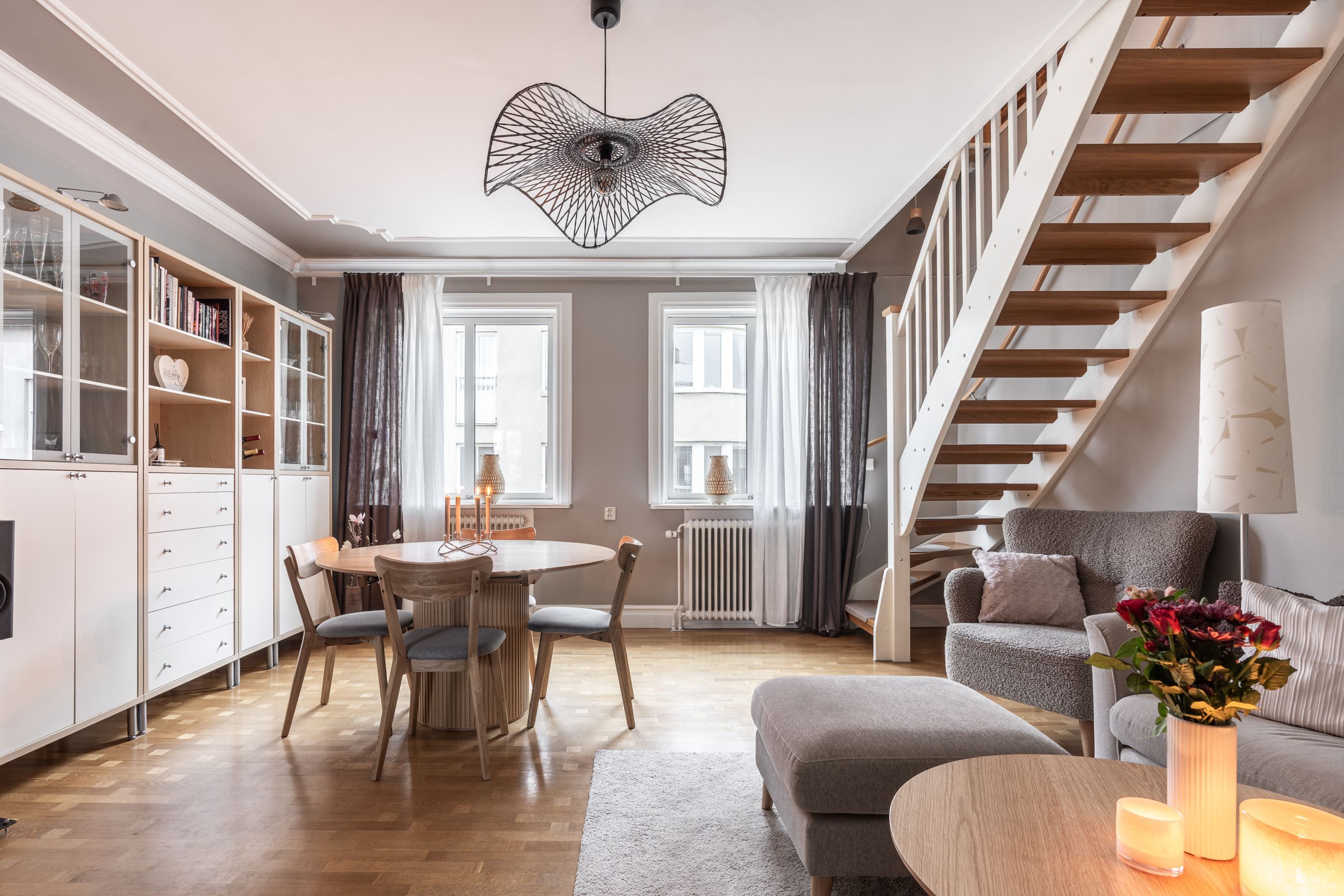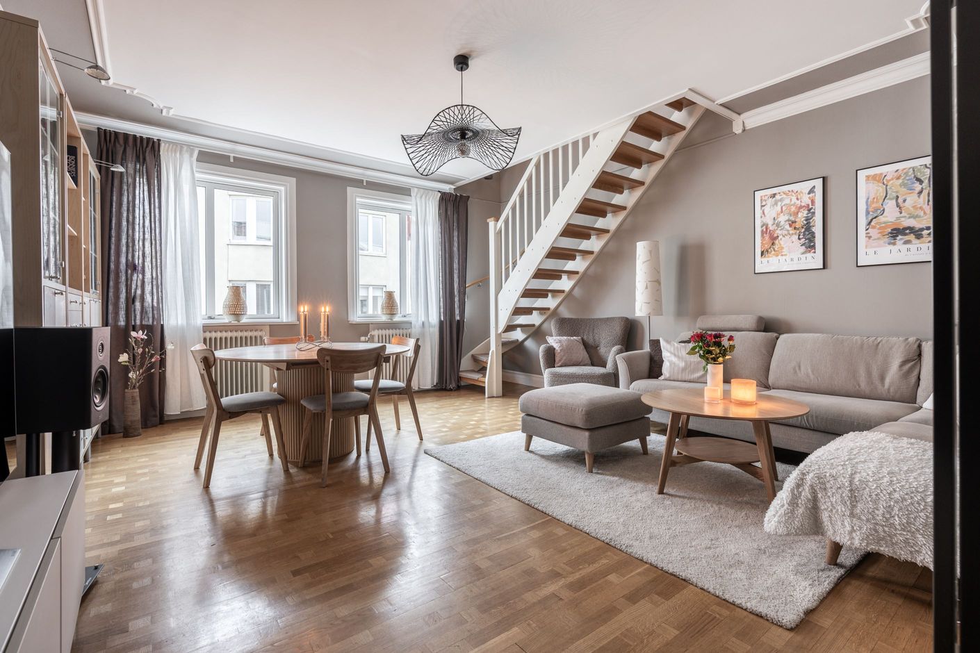 Välkommen till en bostad som verkligen sticker ut, en smakfullt ombyggd etagelägenhet med karaktär, historia och moderna inslag. Här bor du på två våningsplan med tre rymliga sovrum, solsäker balkong, två badrum, renoverat kök och generösa sociala ytor – perfekt för både vardag och umgänge.