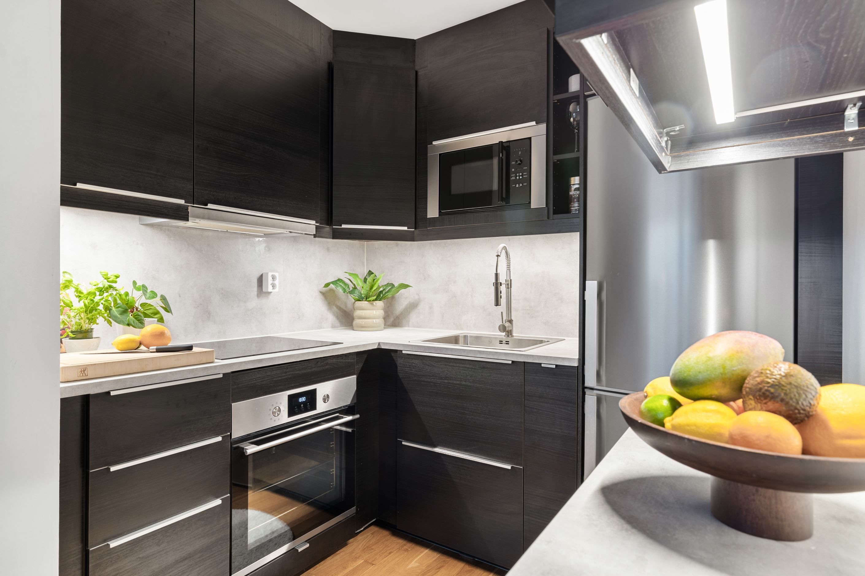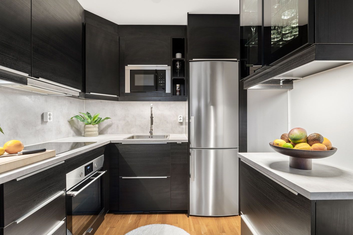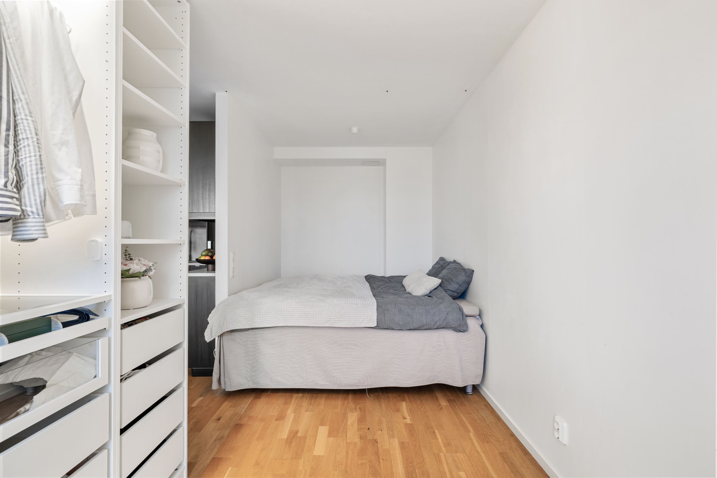 Här möts du av en rymlig öppen yta där vardagsrum och matplats förenas – perfekt för både vardagsliv och umgänge. Tack vare den smart avskiljda väggen skapas en naturlig sovdel samt en praktisk arbetsplats för dig som arbetar hemifrån.