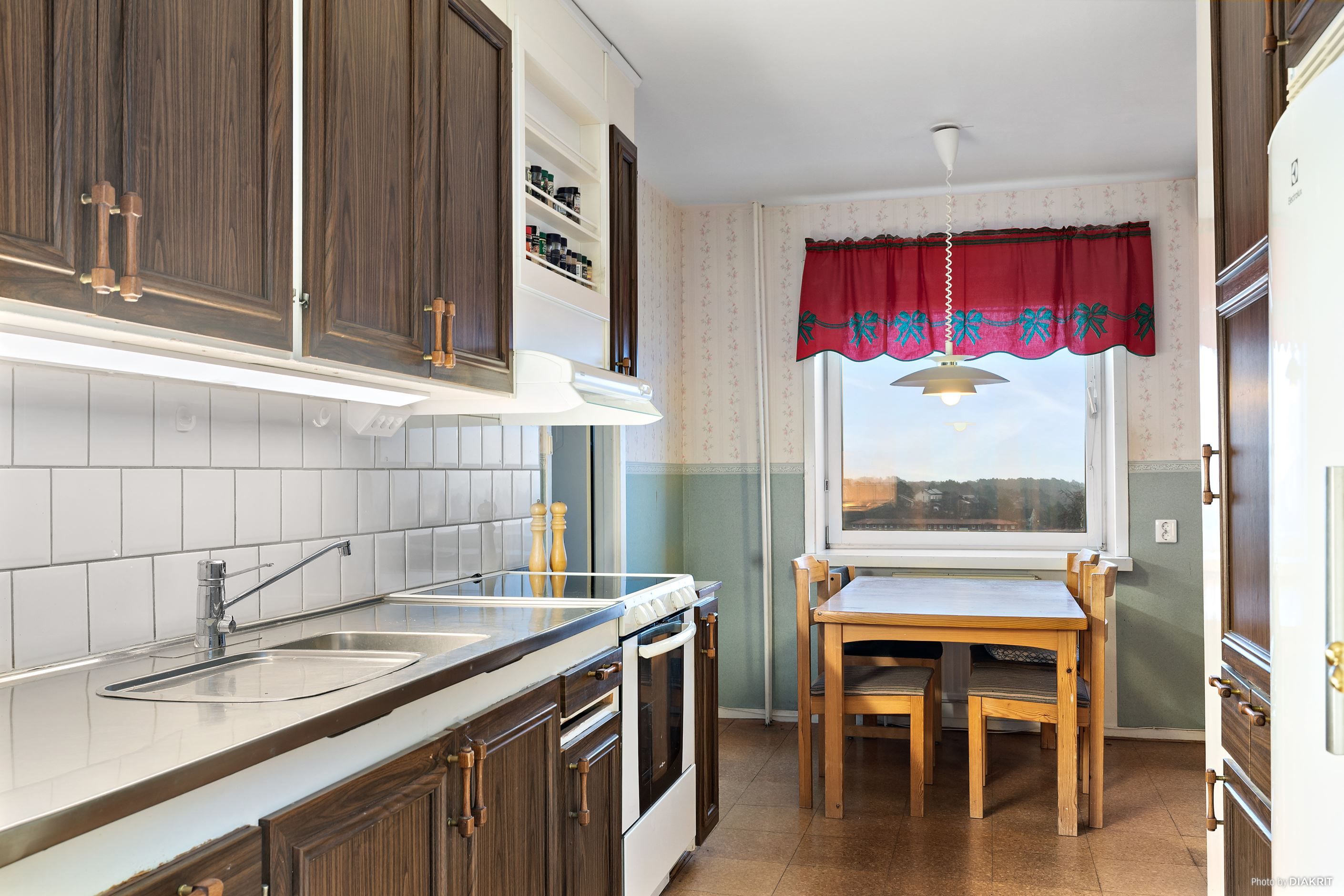 Bostaden har en tydlig och funktionell planlösning där ett stort vardagsrum utgör en naturlig samlingspunkt. De stora fönstren skänker rummet rikligt med dagsljus och ger samtidigt en underbar vy över både natur och Göteborg. Intill ligger köket, även det med utsikt, och erbjuder bra arbetsytor, gott om förvaring och möjlighet till uppgradering för den som önskar ett modernt och personligt kök.
