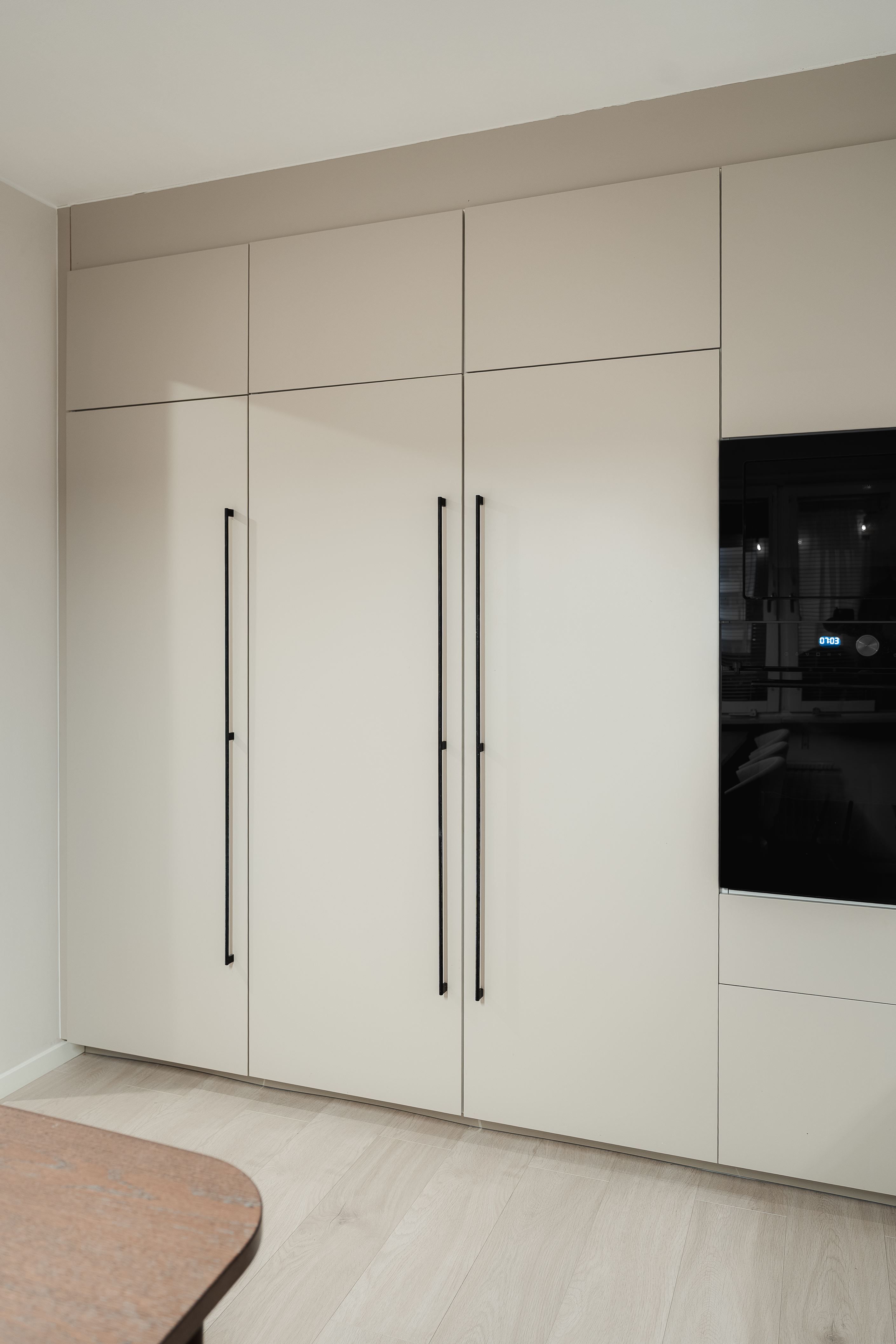 Köket är stilrent utformat med släta fronter, integrerade vitvaror och en sober färgskala. Bänkskivor i kompositsten tillsammans med matchande stänkskydd ger ett exklusivt uttryck och en genomgående känsla av kvalitet. En perfekt plats för både matlagning och gemenskap.