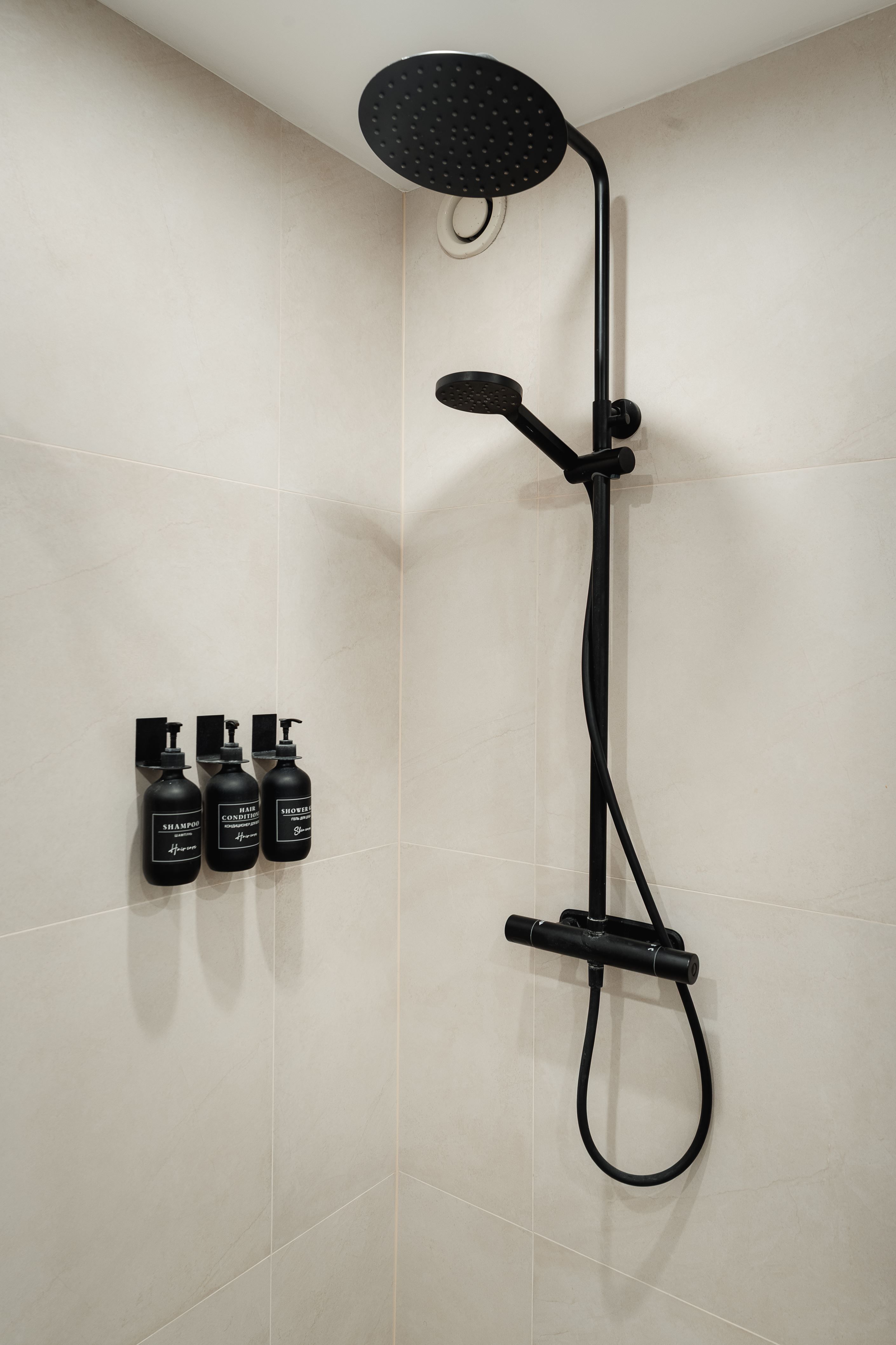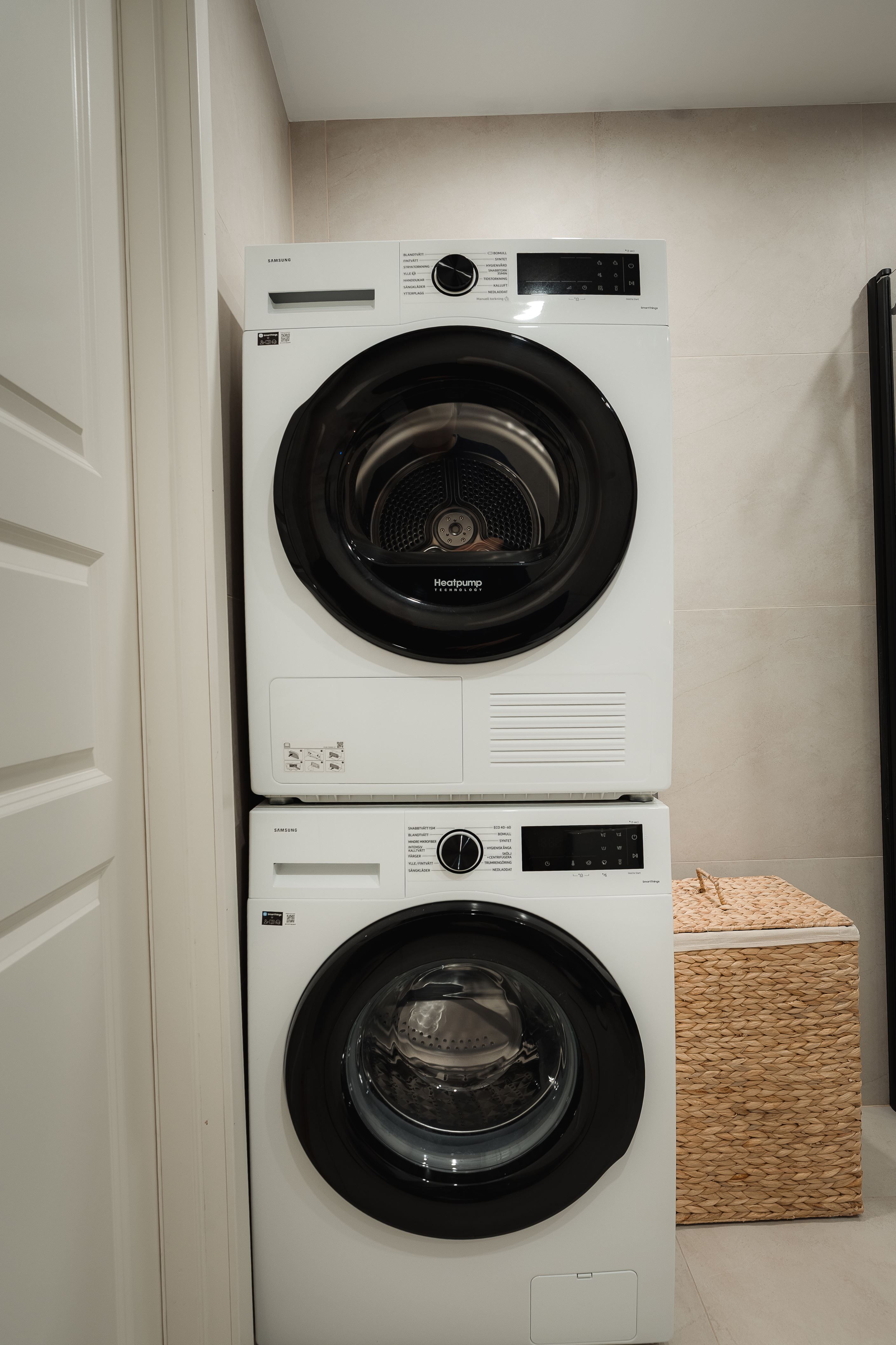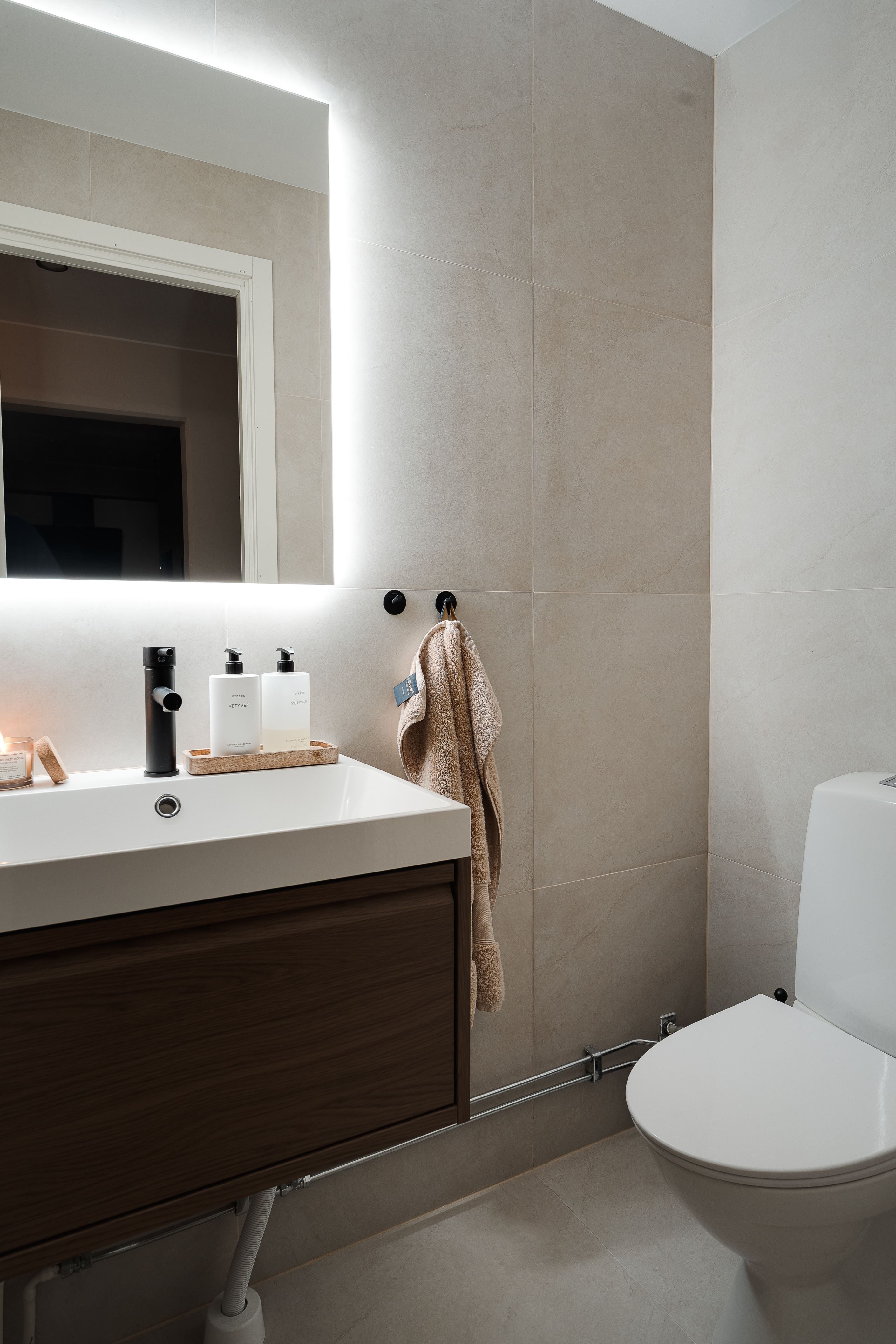 Bostaden erbjuder två wc-utrymmen: ett elegant duschrum med moderna detaljer, glasad dusch, tvättmaskin och torktumlare, samt en praktisk gäst-wc. En eftertraktad bekvämlighet som förenklar vardagen.
