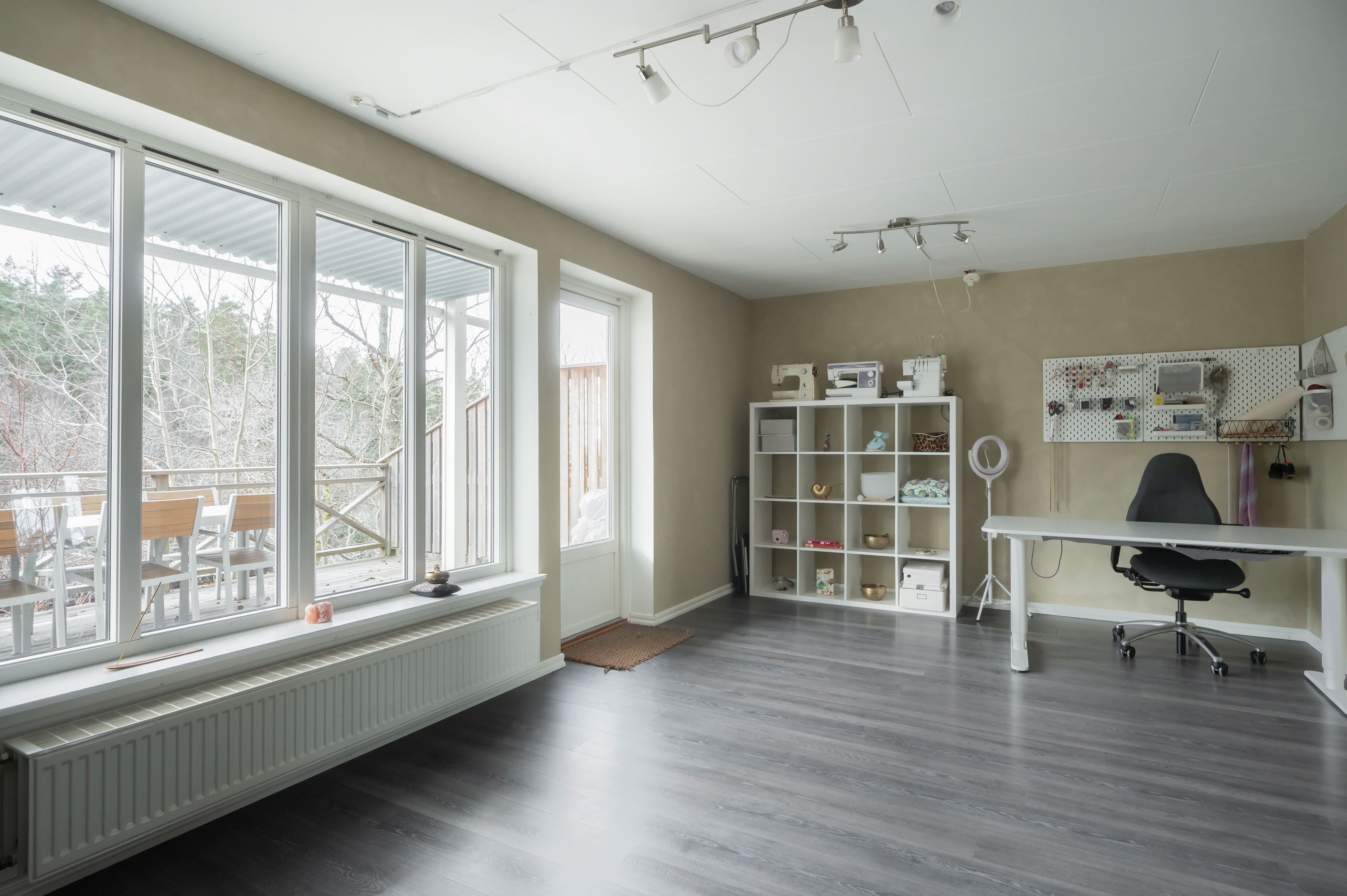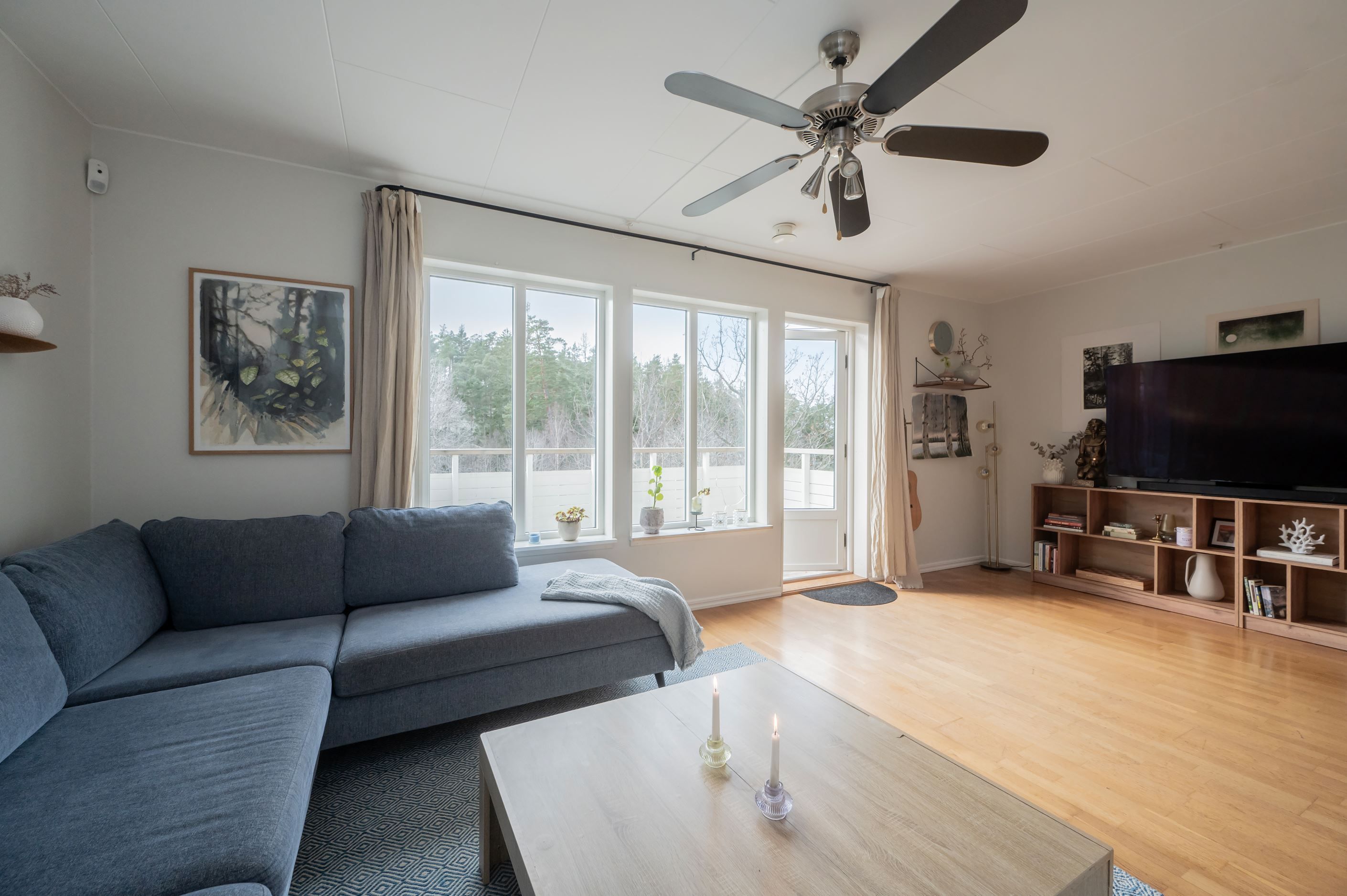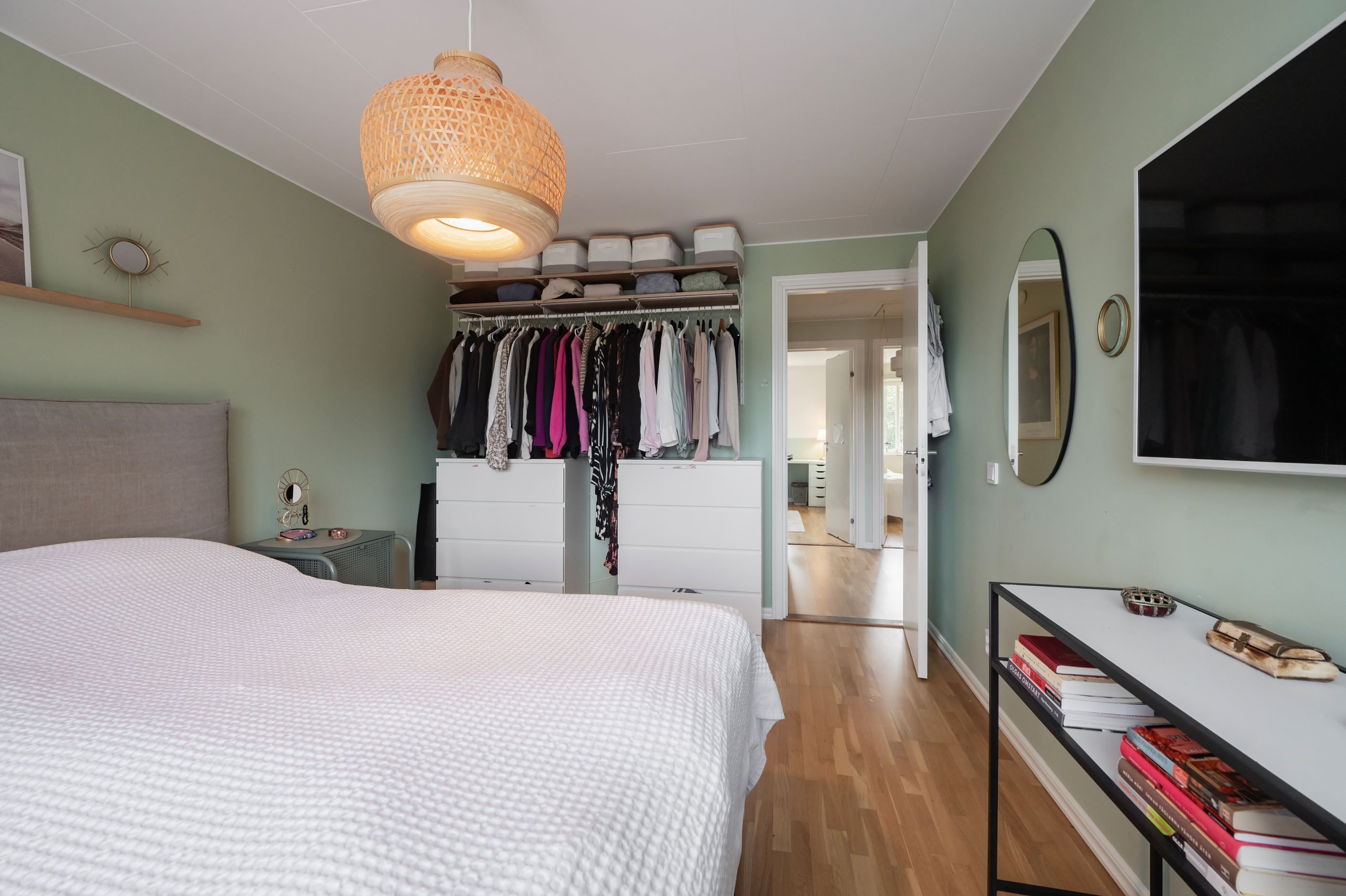 Invändigt möts man av en rymlig hall med stor garderob längs hela väggen. Stort kök som går i vitt med mycket förvaring och matplats. Helkaklad wc med tvättmaskin och torktumlare. Rymligt vardagsrum med utgång till balkong i sydväst läge. En trappa upp finns fyra rymliga sovrum och ett renoverat badrum. Nedre plan med ytterligare ett renoverat badrum och ett stort allrum. Utgång till trädäckad altan med sol hela dagen. Flera av medlemmarna i föreningen har gjort nedre plan till en uthyrningsdel och kan då täcka stora delar av boendekostnaden. Framsida med altan och bilplats med laddare.
