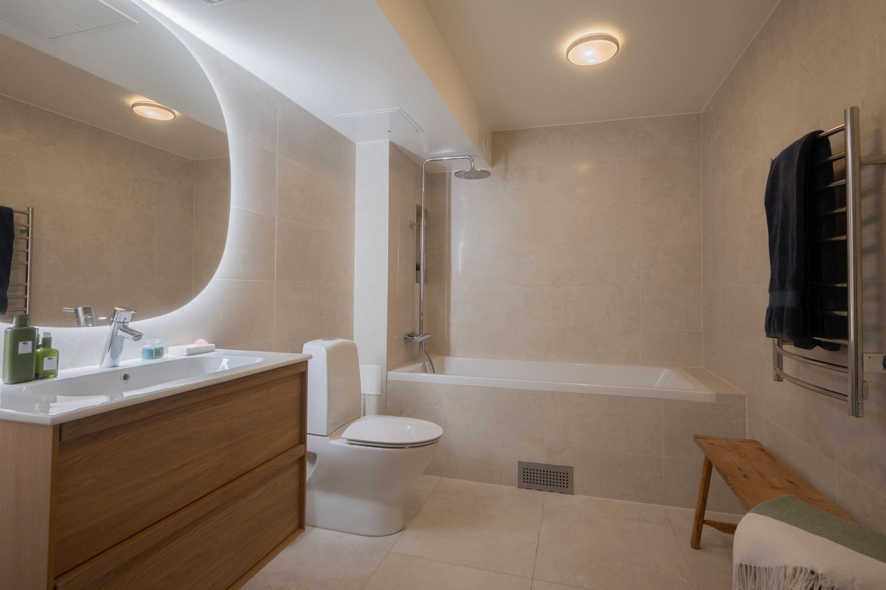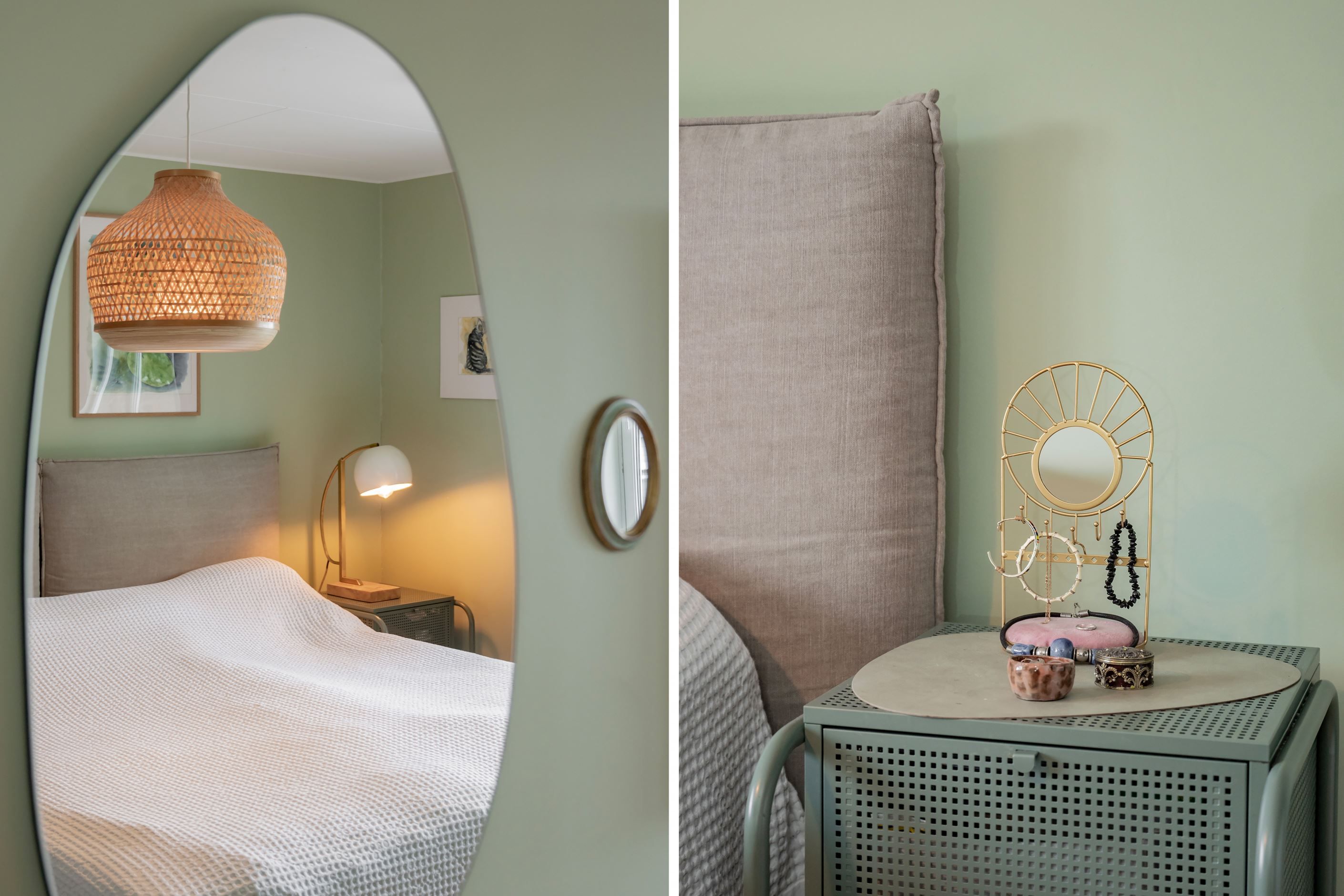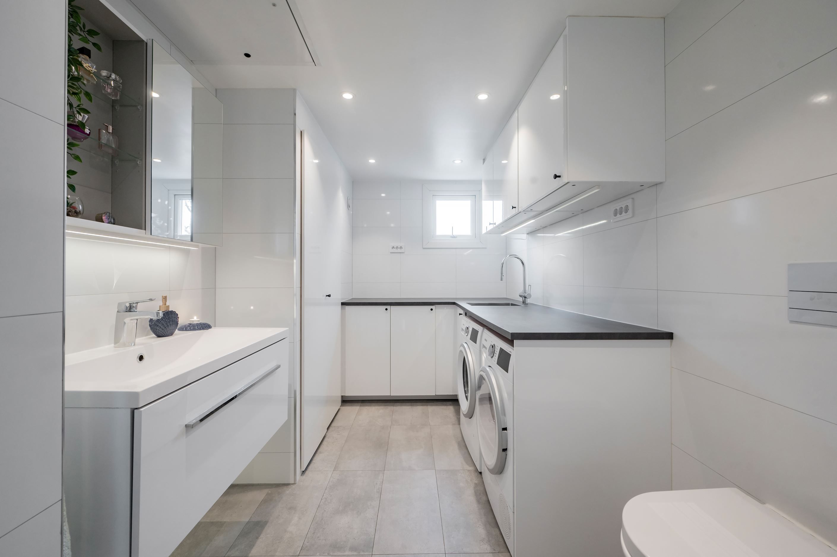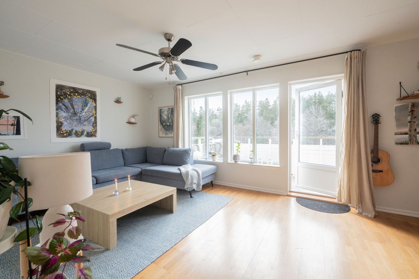 Invändigt möts man av en rymlig hall med stor garderob längs hela väggen. Stort kök som går i vitt med mycket förvaring och matplats. Helkaklad wc med tvättmaskin och torktumlare. Rymligt vardagsrum med utgång till balkong i sydväst läge. En trappa upp finns fyra rymliga sovrum och ett renoverat badrum. Nedre plan med ytterligare ett renoverat badrum och ett stort allrum. Utgång till trädäckad altan med sol hela dagen. Flera av medlemmarna i föreningen har gjort nedre plan till en uthyrningsdel och kan då täcka stora delar av boendekostnaden. Framsida med altan och bilplats med laddare.