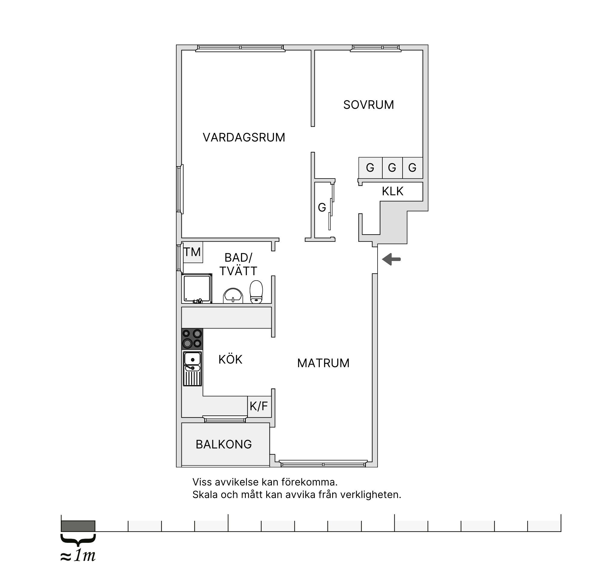 Vardagsrummet är rymligt och har fint ljusinsläpp. Härifrån når du sovrummet, som även nås via en praktisk passage från hallen – en genomtänkt lösning som skapar smidiga flöden i bostaden.