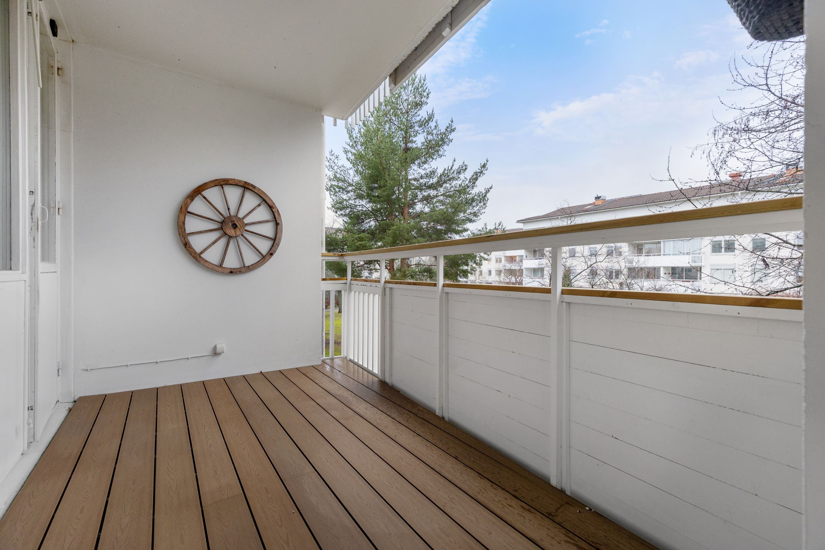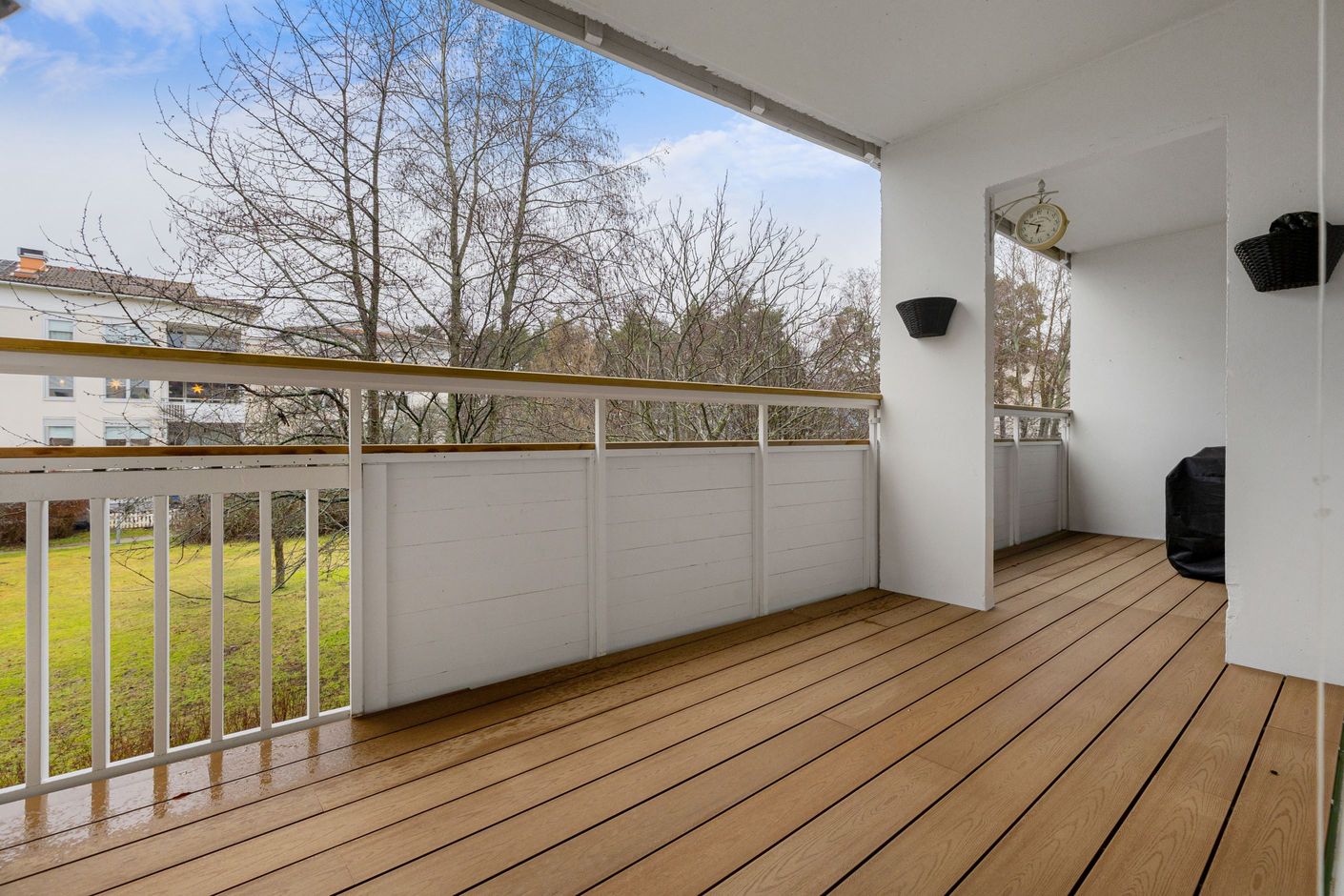 Det rymliga vardagsrummet erbjuder gott om plats för både soffgrupp och matplats och blir hemmets naturliga samlingspunkt. Härifrån nås bostadens stora trädäckade dubbelbalkongen mot den lugna baksidan, med mycket bra solläge.