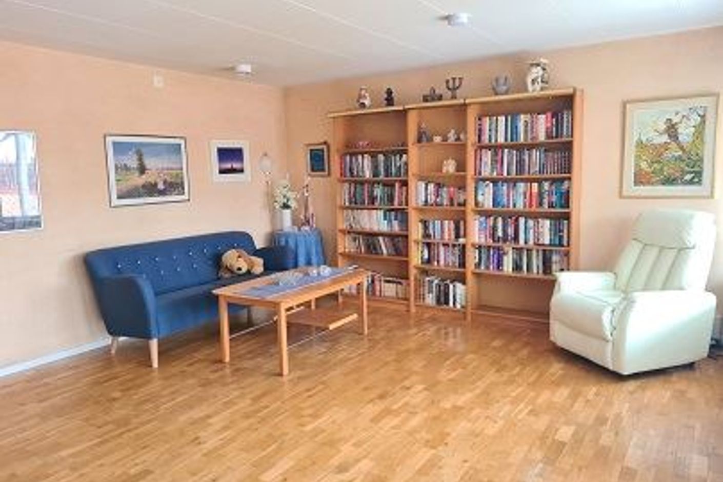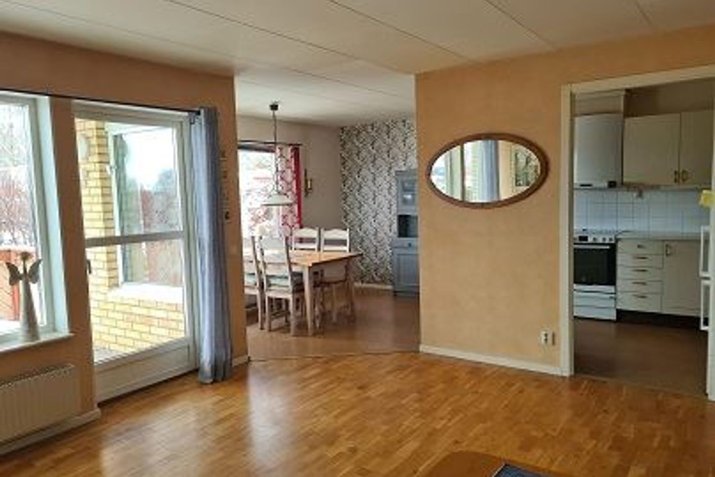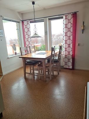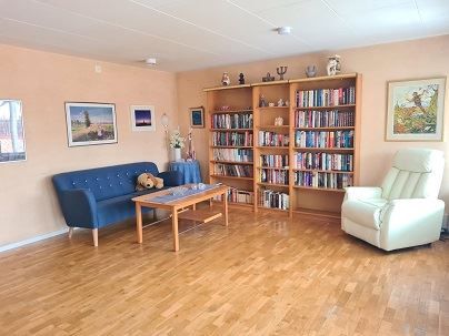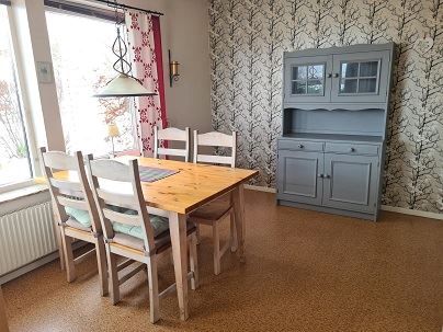 Här är allt samlat i ett plan inga besvärliga trappor, öppen planlösning mellan kök och vardagsrum.