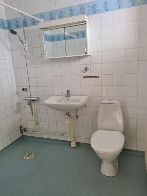 Dusch /Wc med kakel och plastmatta. Stensatt uteplats på baksidan och mindre "grästäppa"