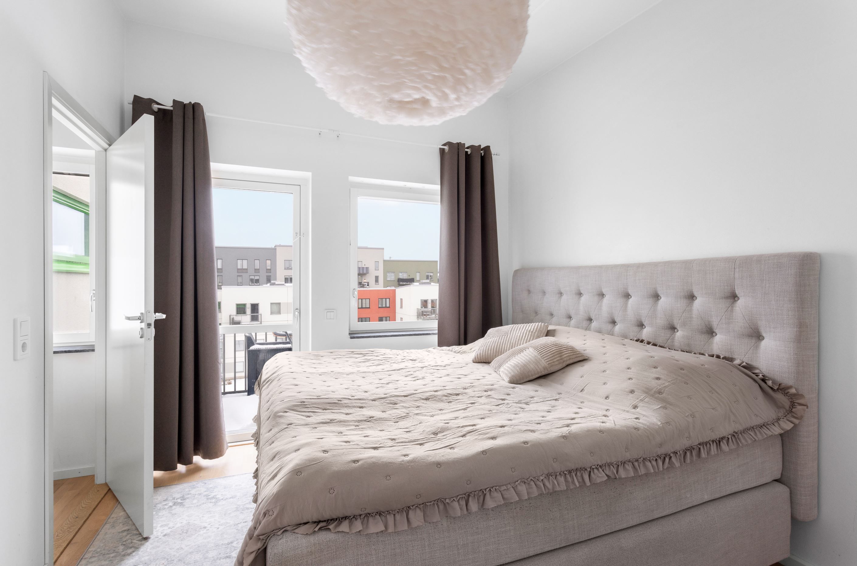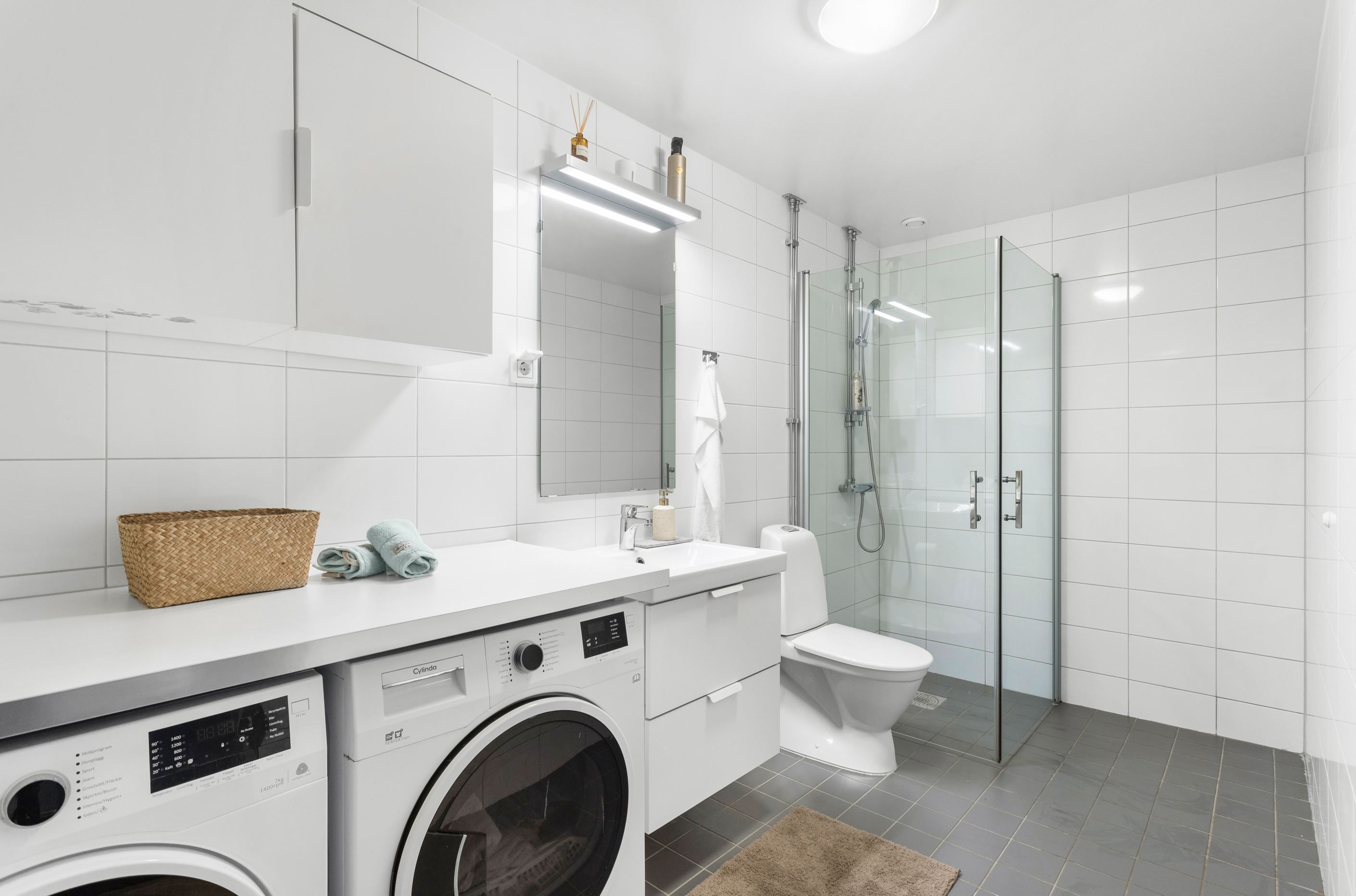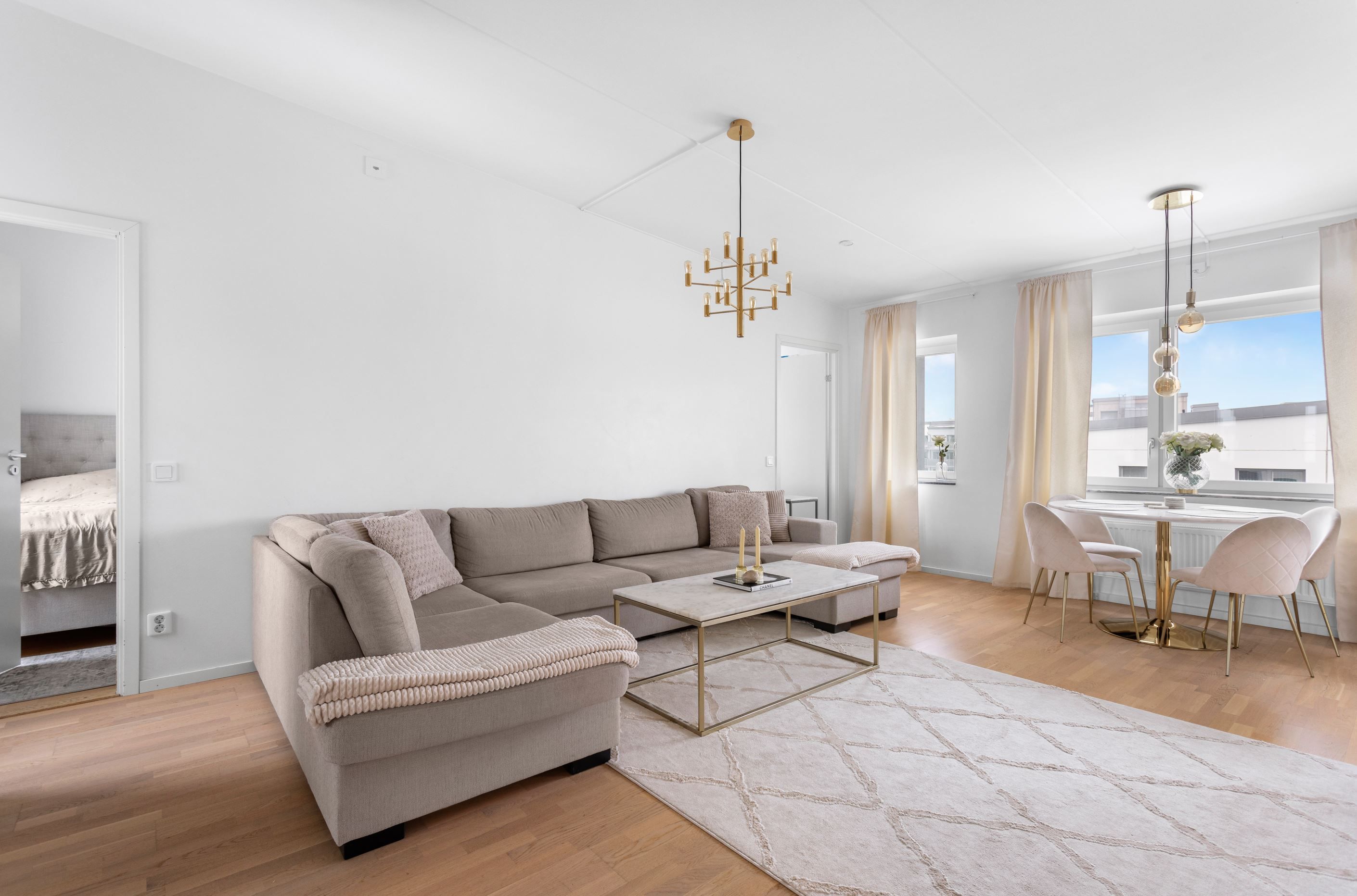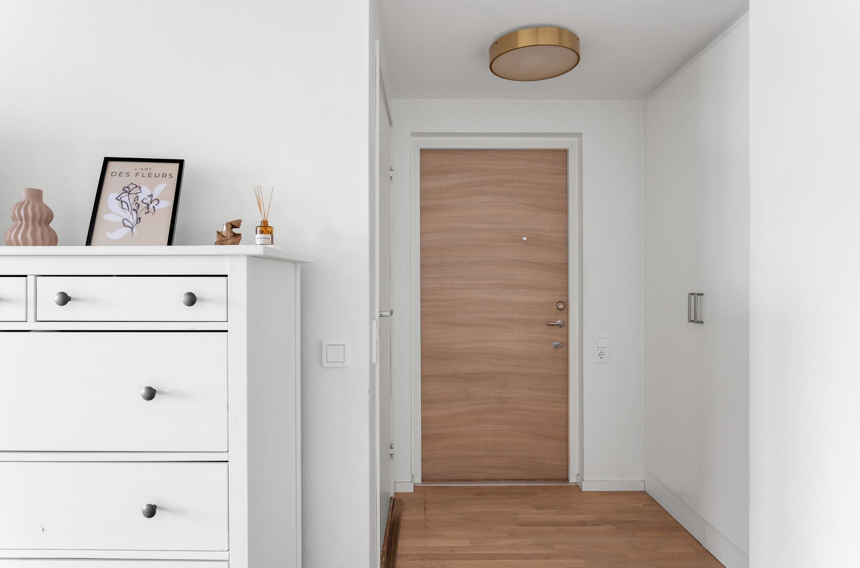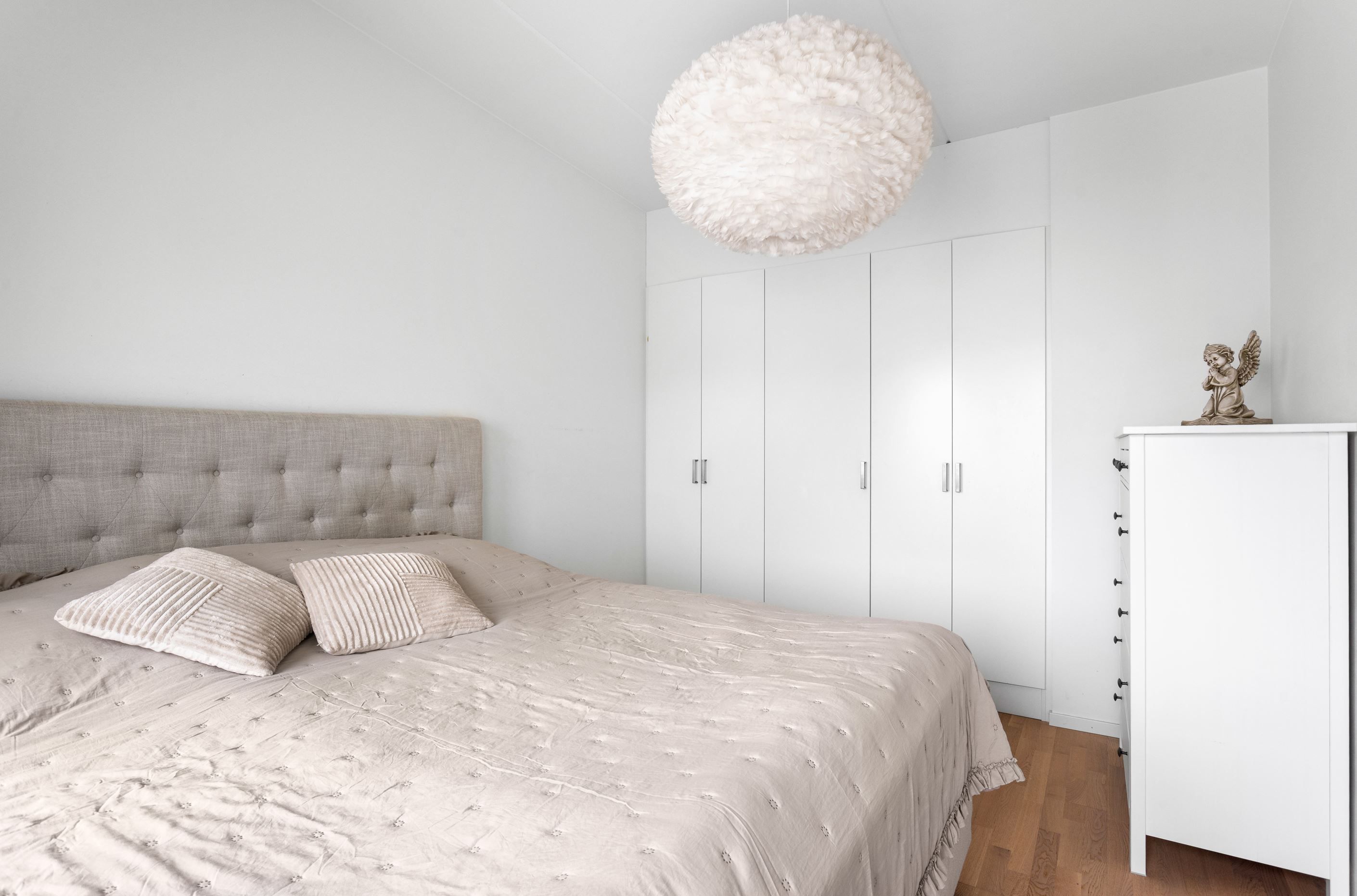 Master bedroom är luftigt och har en helvägg med förvaring och direkt utgång till den insynsskyddade balkongen – en privat oas där du kan njuta av morgonkaffet eller varma sommarkvällar i lugn och ro. Det mindre sovrummet är perfekt för såväl barnrum, gästrum som hemmakontor. Det helkaklade badrummet är modernt utrustat och har tvättmaskin och torktumlare, och kompletteras av praktiska förvaringslösningar i hallen.