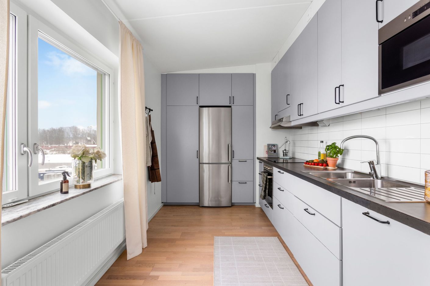 Köket är stilrent och modernt med gott om arbetsytor och förvaring. Här finns plats för en större matgrupp intill fönsterparti, vilket skapar en naturlig samlingspunkt i hemmet.