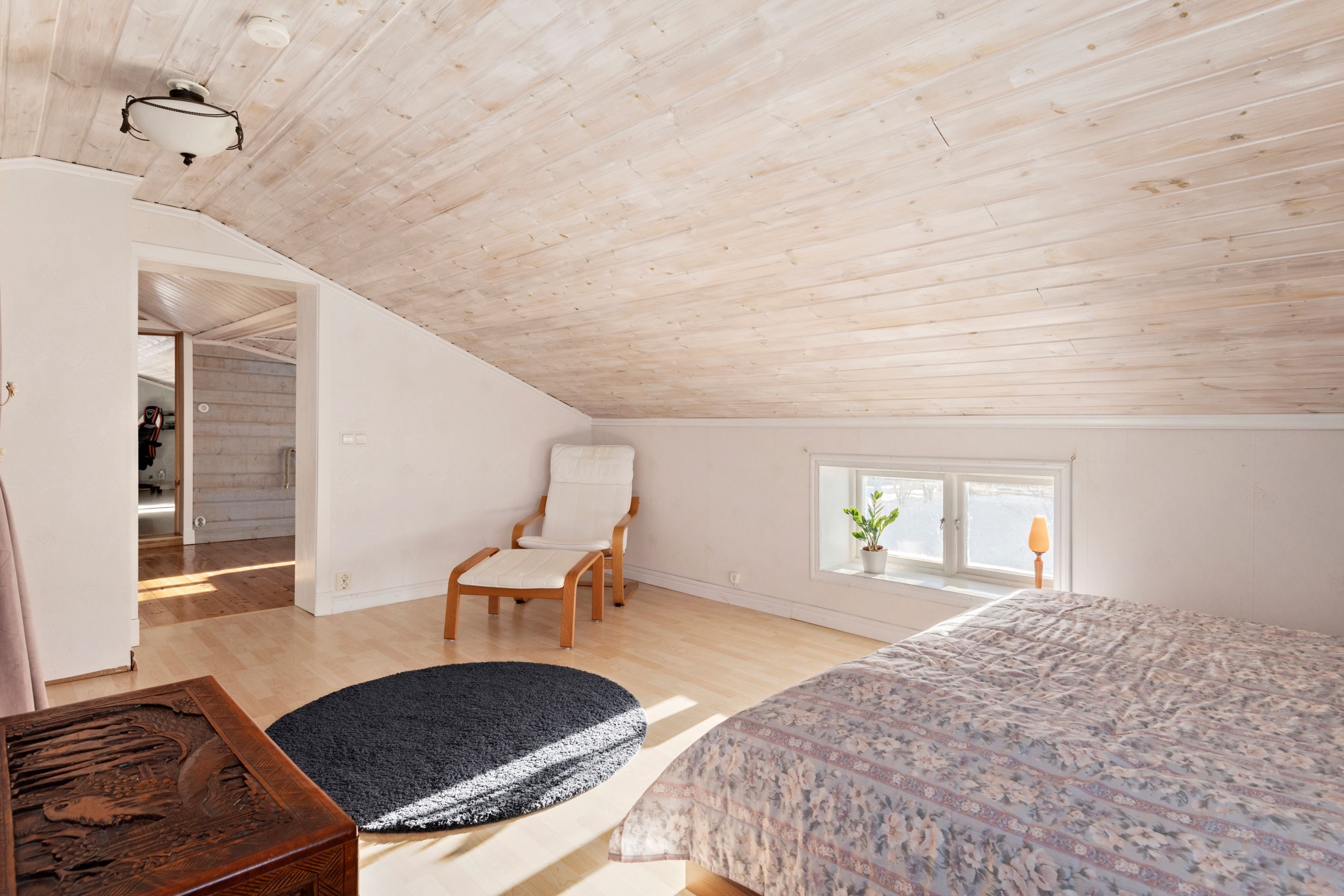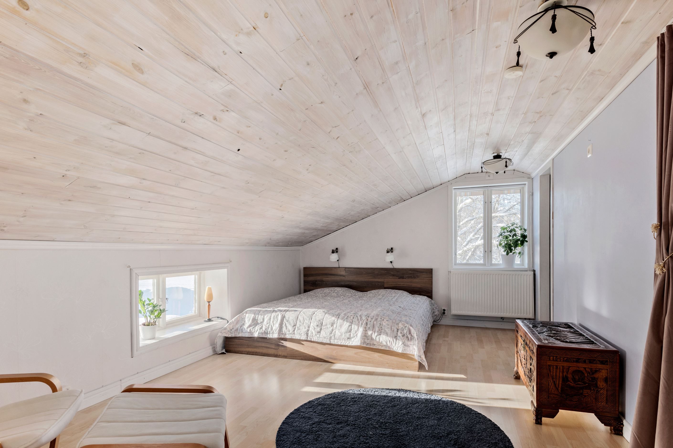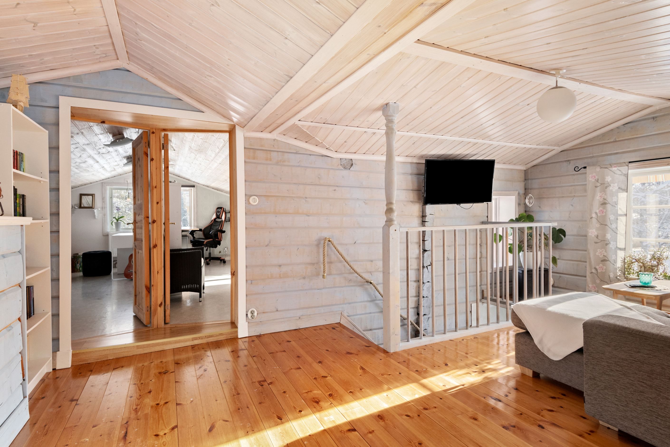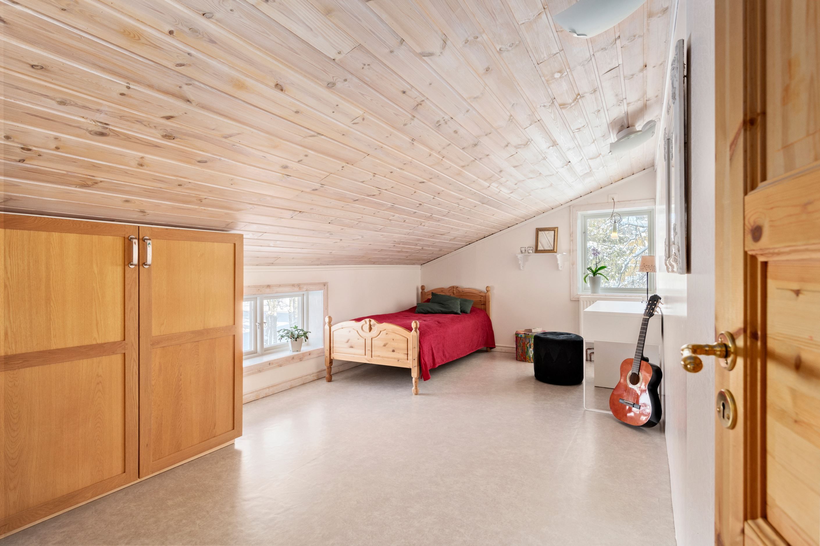 Övre plan har ett luftigt allrum som idag nyttjas som både allrum och kontor. Det finns tre större sovrum med lutande tak varav ett av dem även har yta som kan nyttjas som kontorsdel eller klädkammare. Från detta sovrum nås även duschrummet som har vägg- och golvmatta, handfat, wc och skåp med bänkskiva ovan.