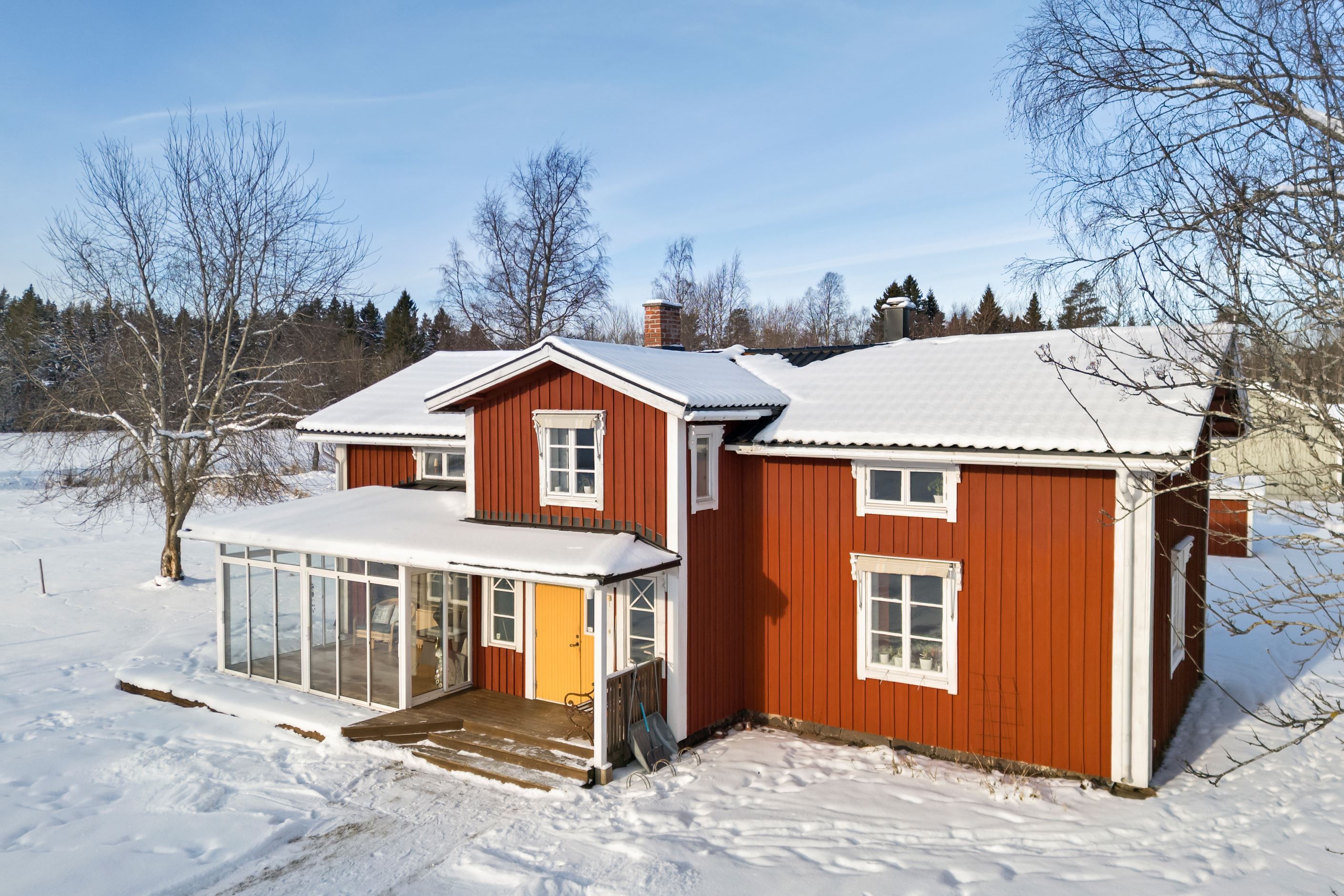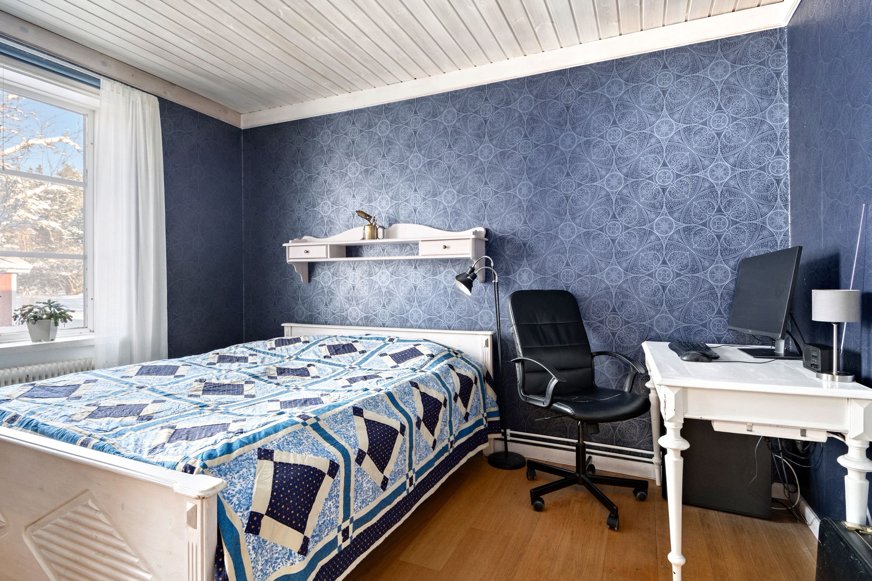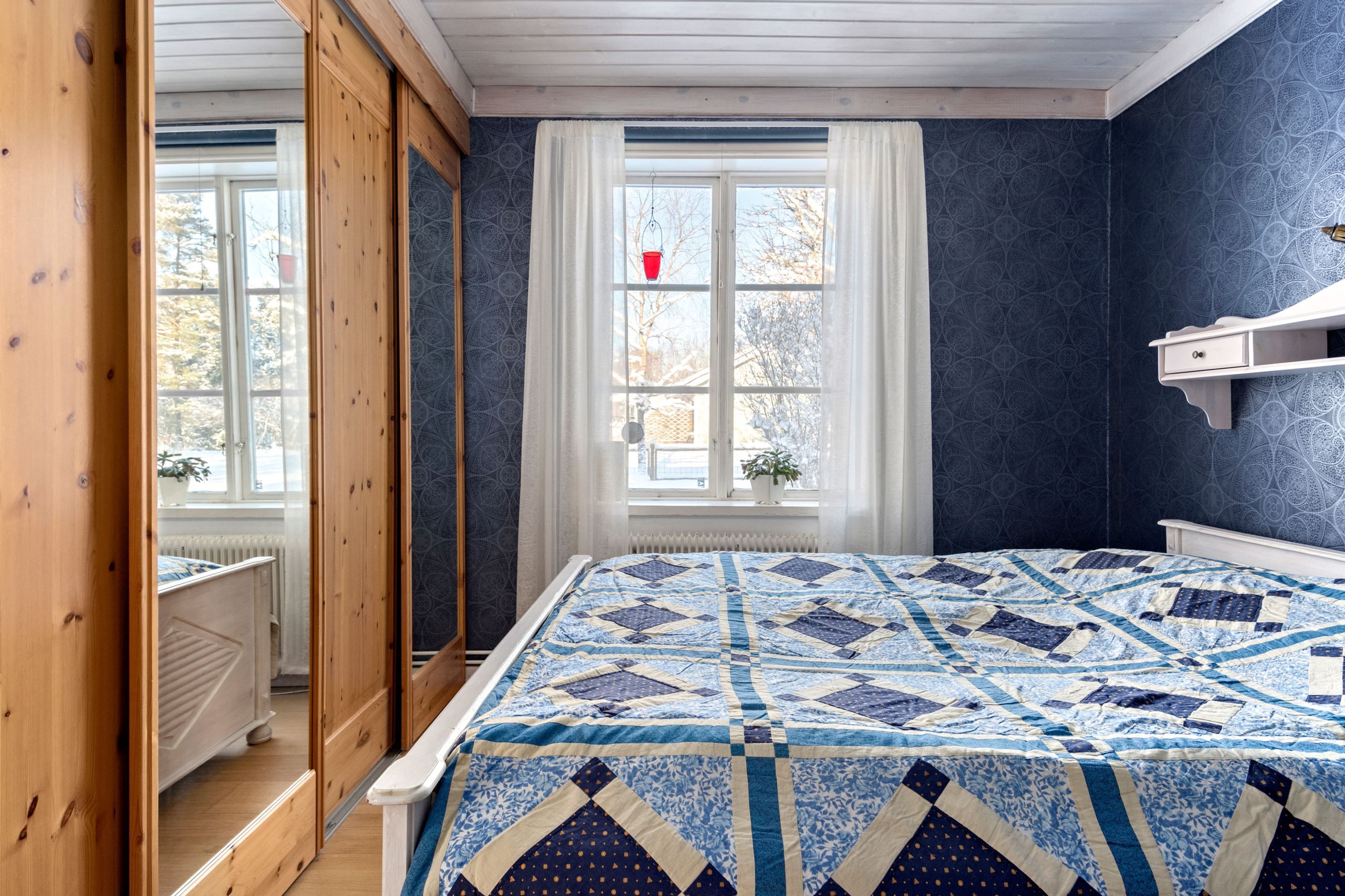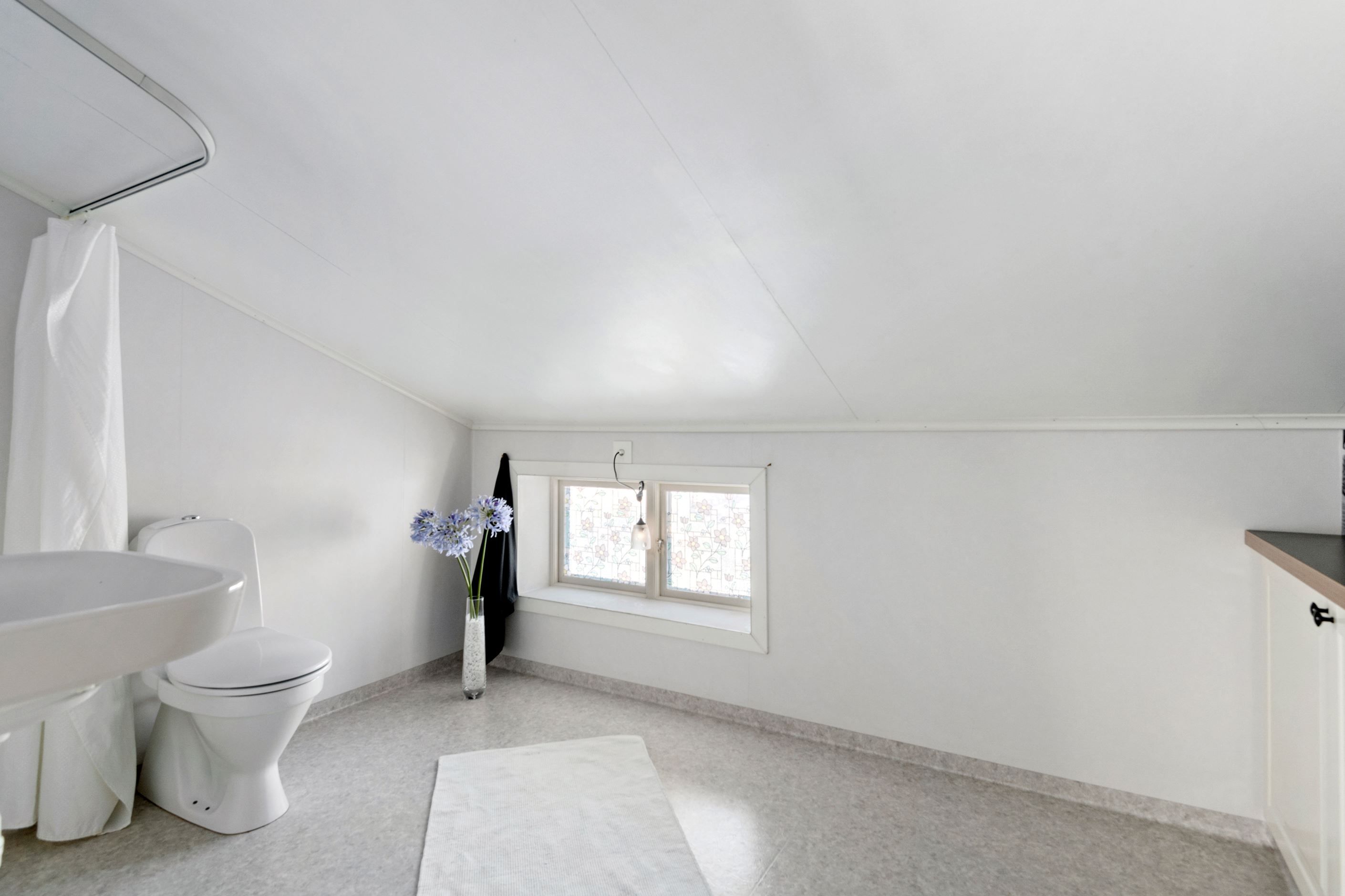 Övre plan har ett luftigt allrum som idag nyttjas som både allrum och kontor. Det finns tre större sovrum med lutande tak varav ett av dem även har yta som kan nyttjas som kontorsdel eller klädkammare. Från detta sovrum nås även duschrummet som har vägg- och golvmatta, handfat, wc och skåp med bänkskiva ovan.