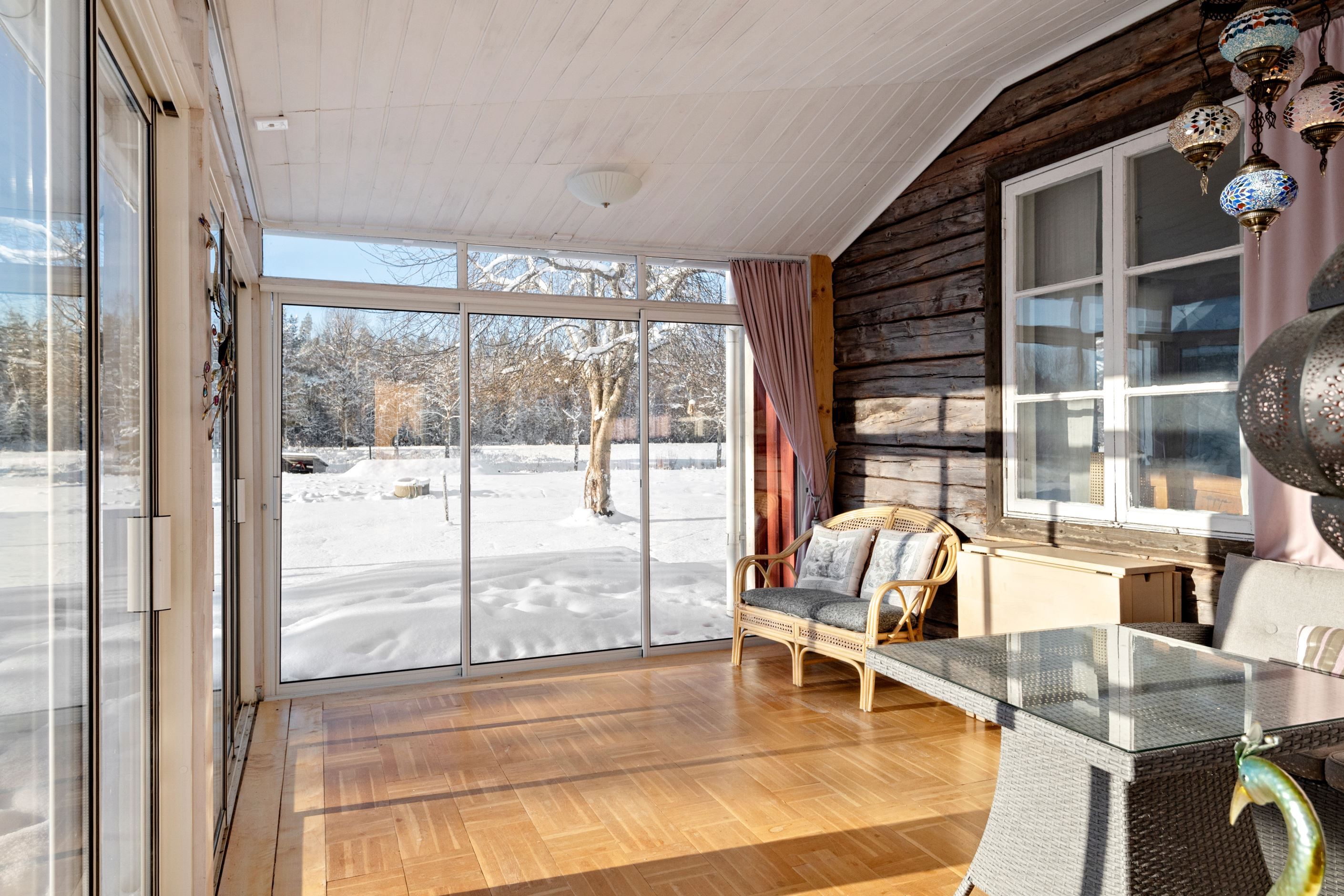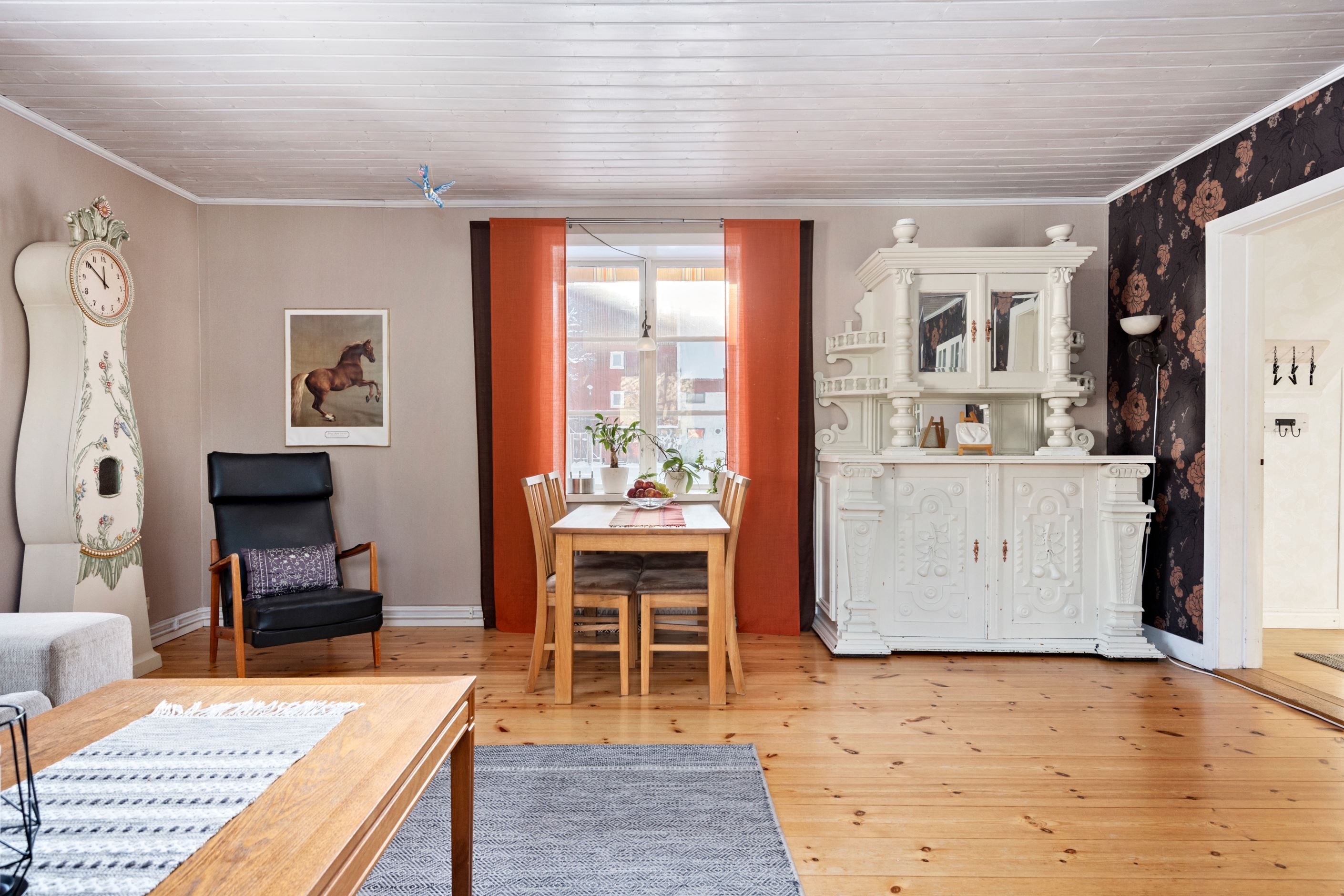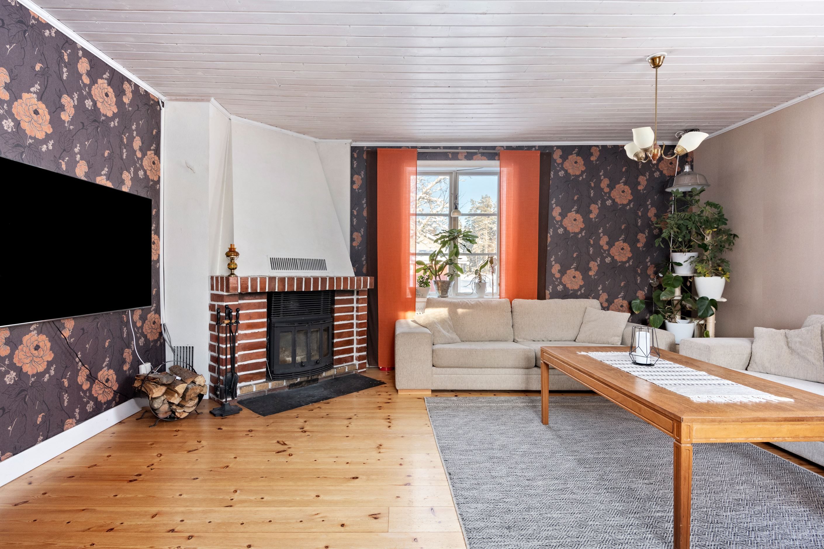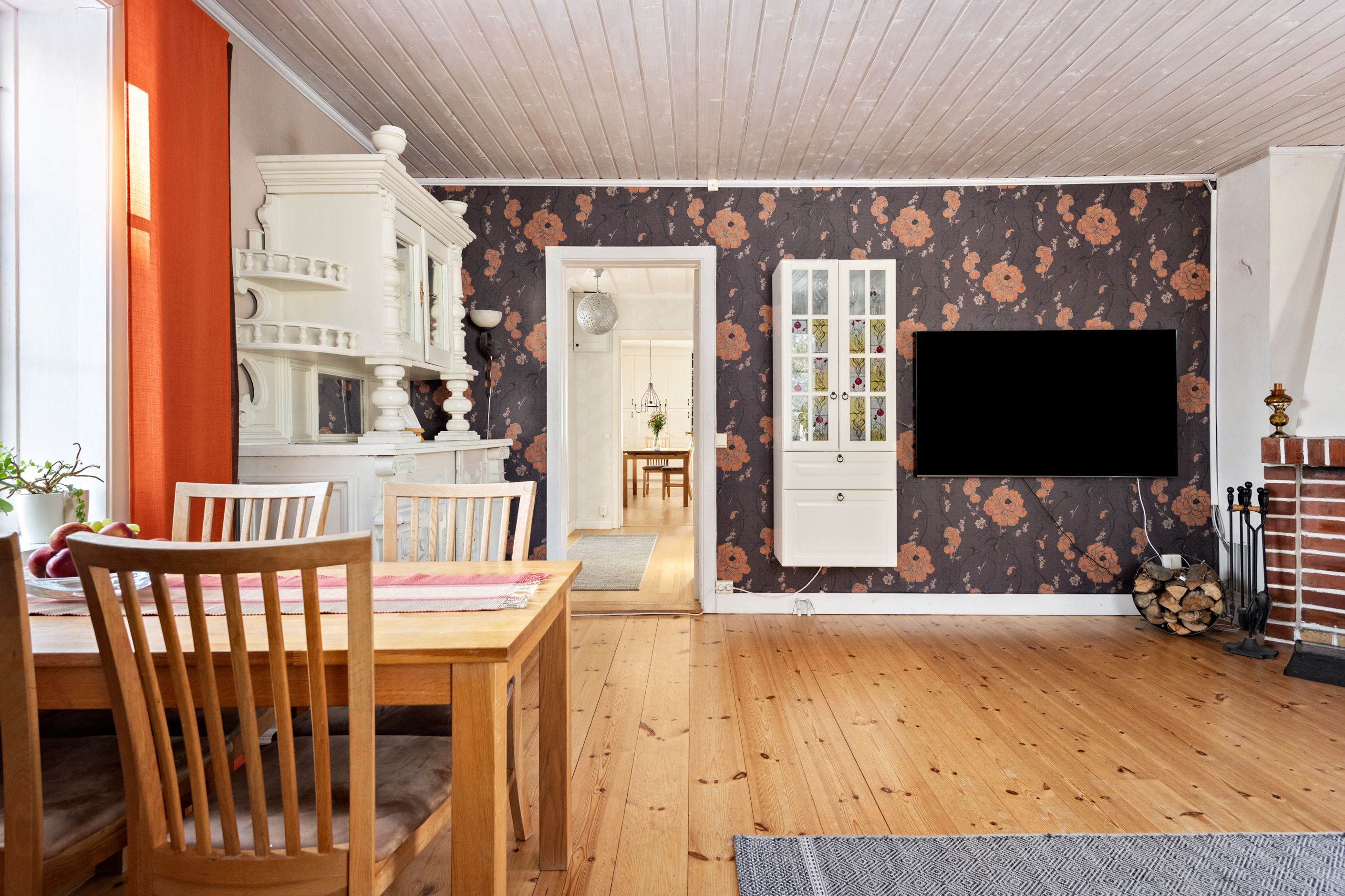 Vardagsrummet är väldigt rymligt och fint med kamin och stora fönster mot tre väderstreck vilket skapar ett härligt ljusflöde till rummet. Rummet är stort och rymmer mat- och soffgrupp, tv-möbel och annan önskvärd möblering. Ljusa väggar, en fondvägg och ett vackert plankgolv.