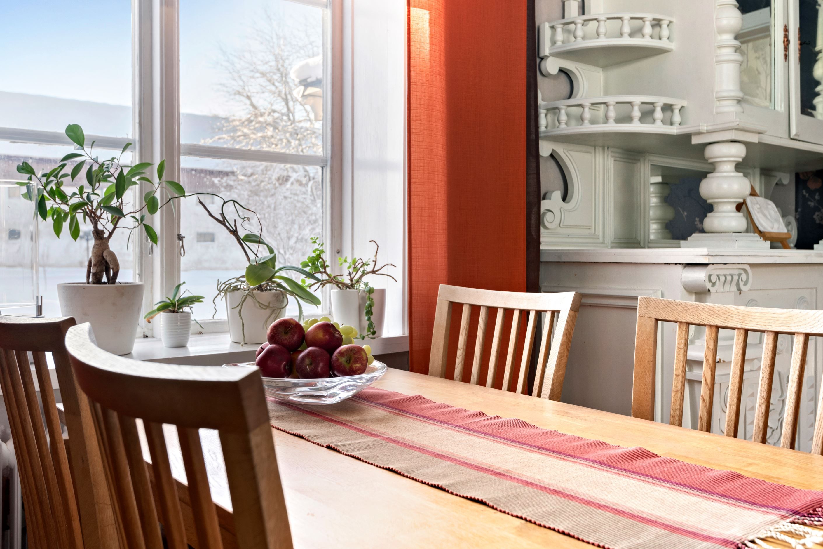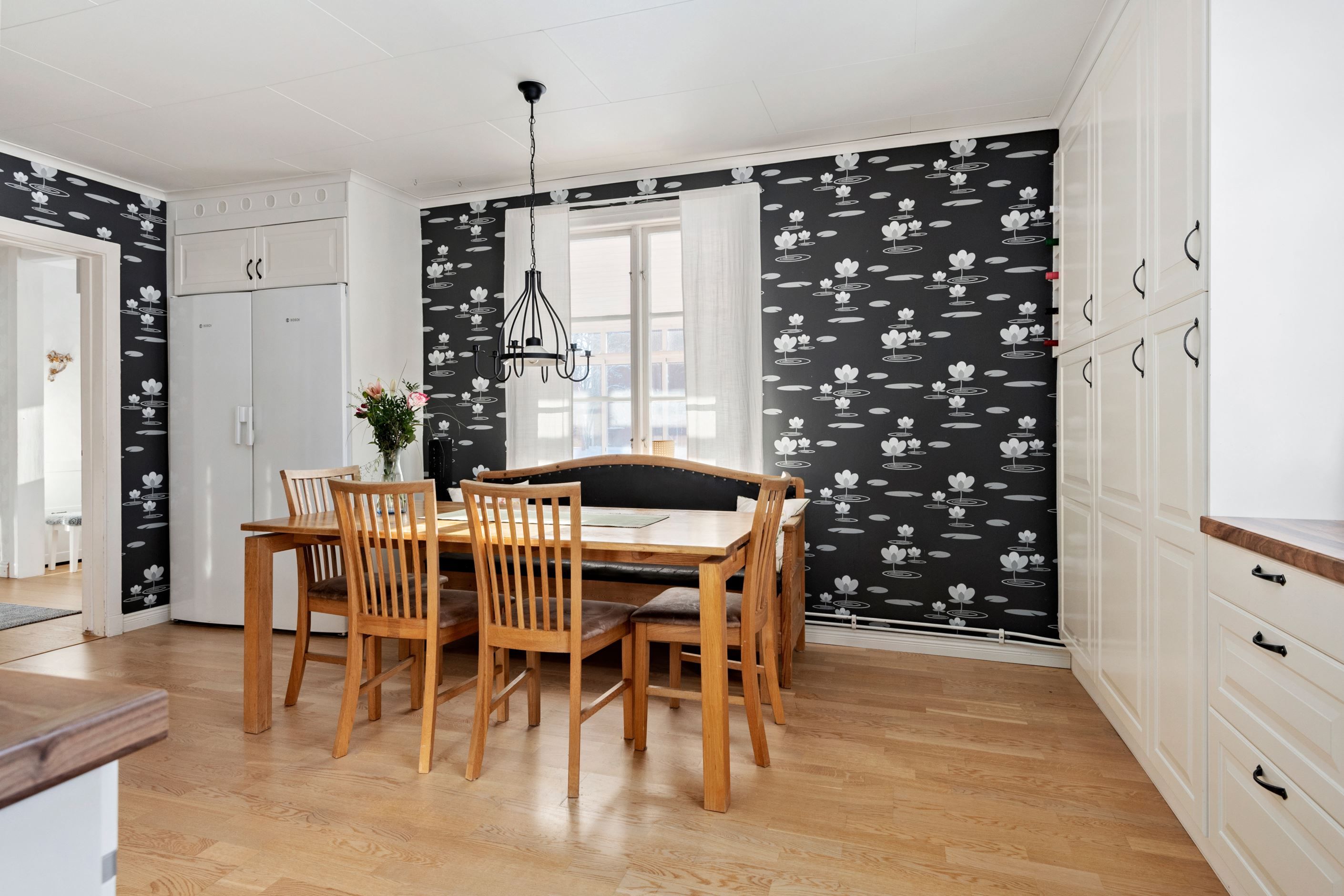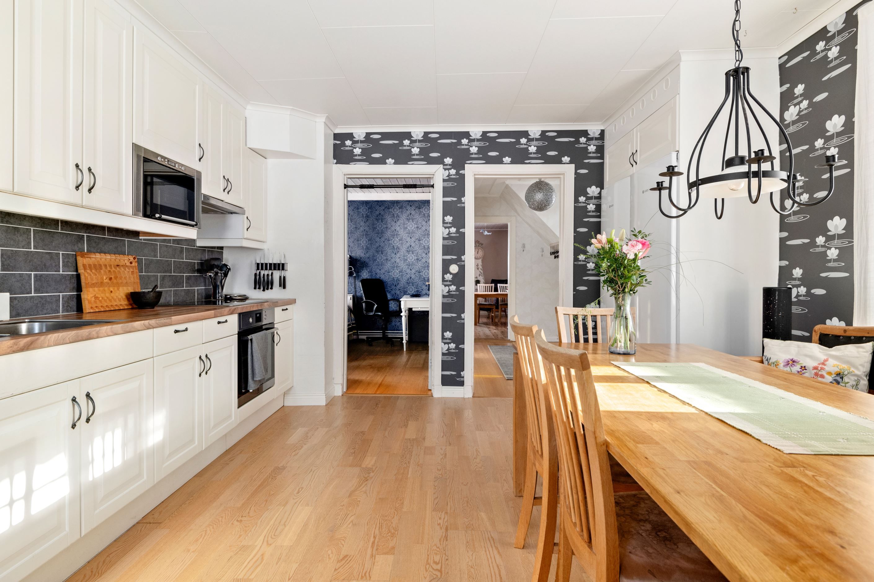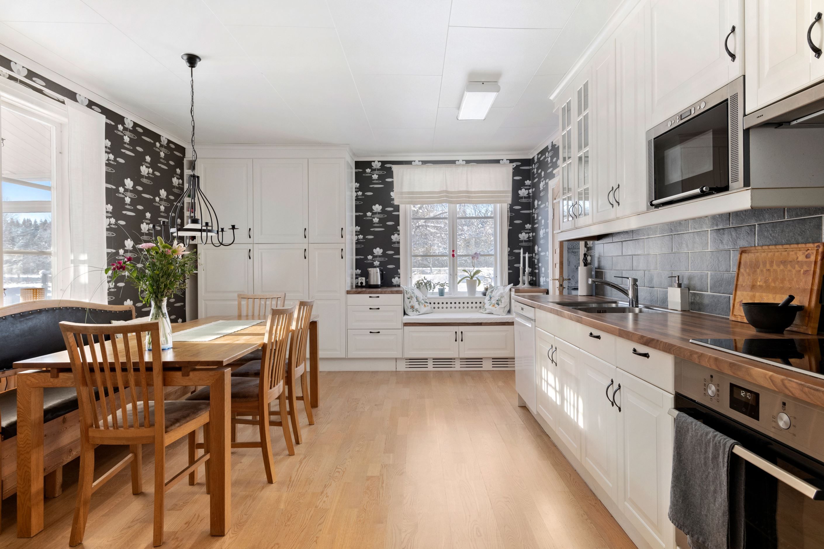 Huset har ett stort härligt kök med goda förvaringsmöjligheter och bra arbetsytor. Köket har vita spårade köksluckor och kakel på vägg. Den maskinella utrustningen består av häll, köksfläkt, inbyggnadsugn, diskmaskin, kyl och frys. I köket rymmer ni ett större köksbord och kökssoffa utan problem.