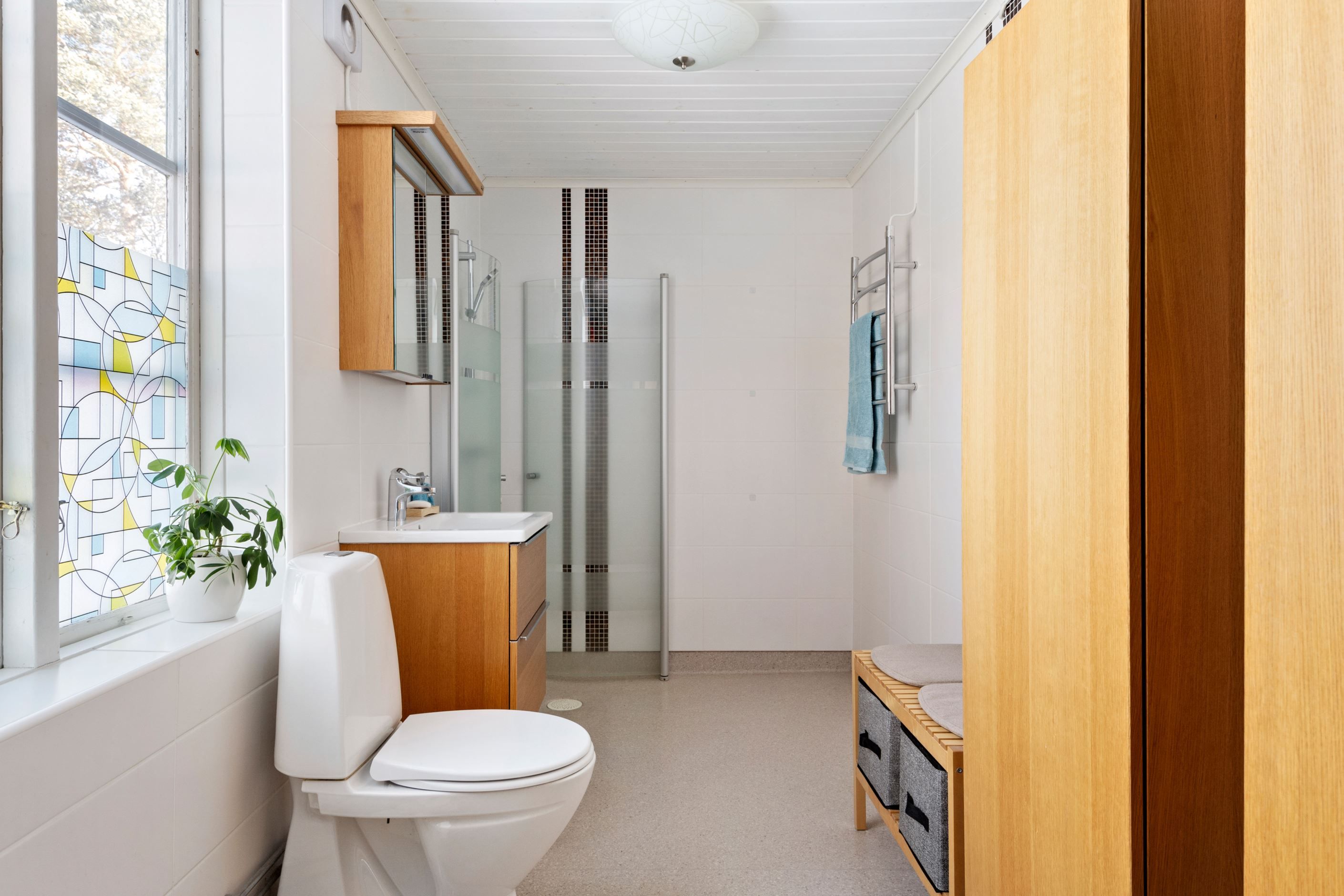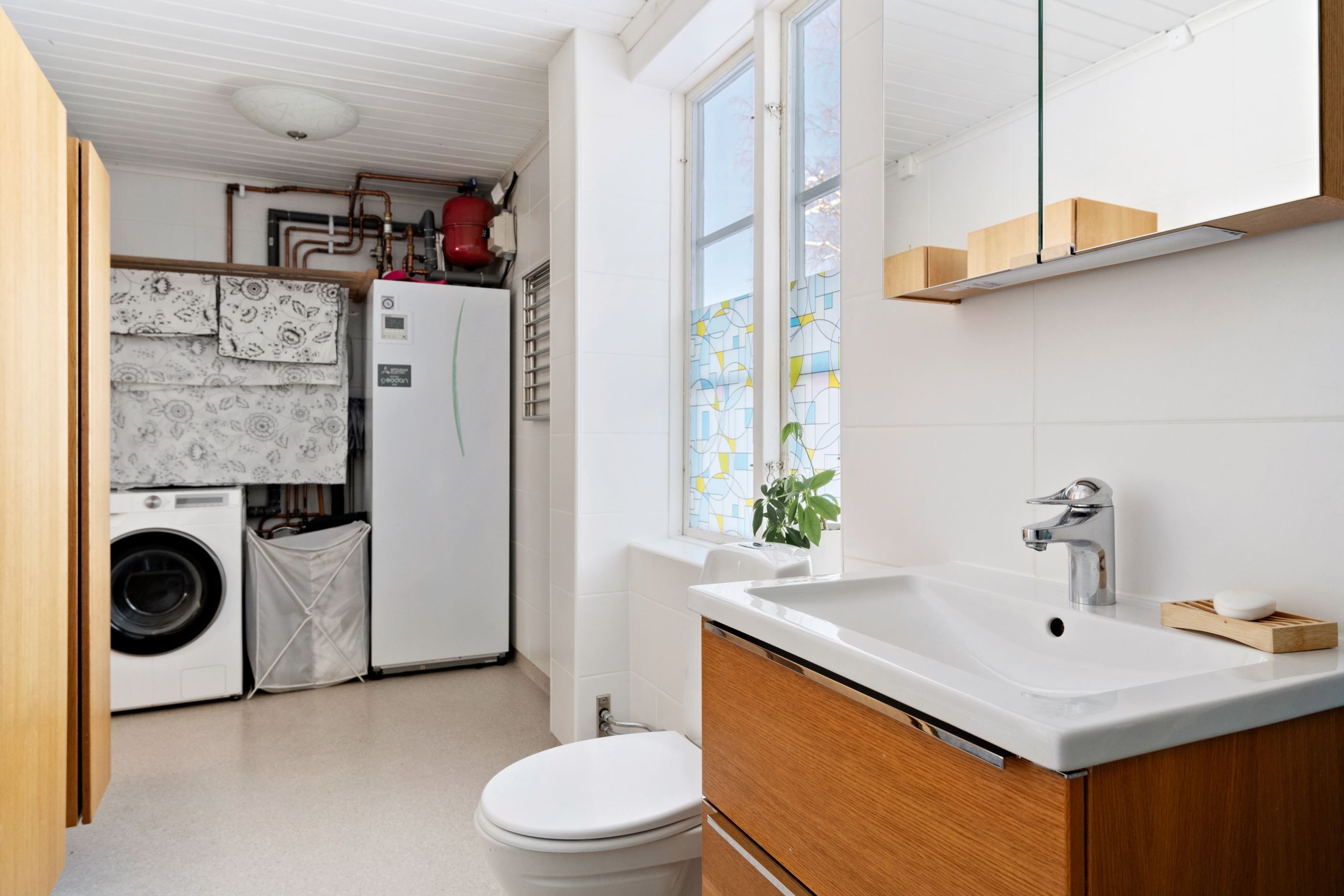 Duschrummet har helkaklade väggar och golvmatta. Här finns väggskåp, kommod med lådor, handfat, badrumsspegel med belysning, duschhörna med glasdörrar. I rummet finns även tvättmaskin och jordvärmepannan från 2020.