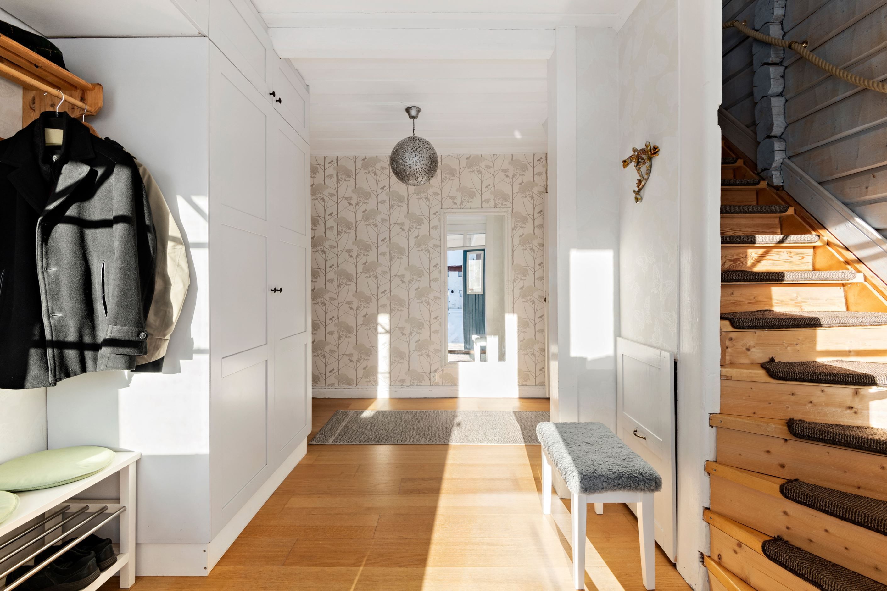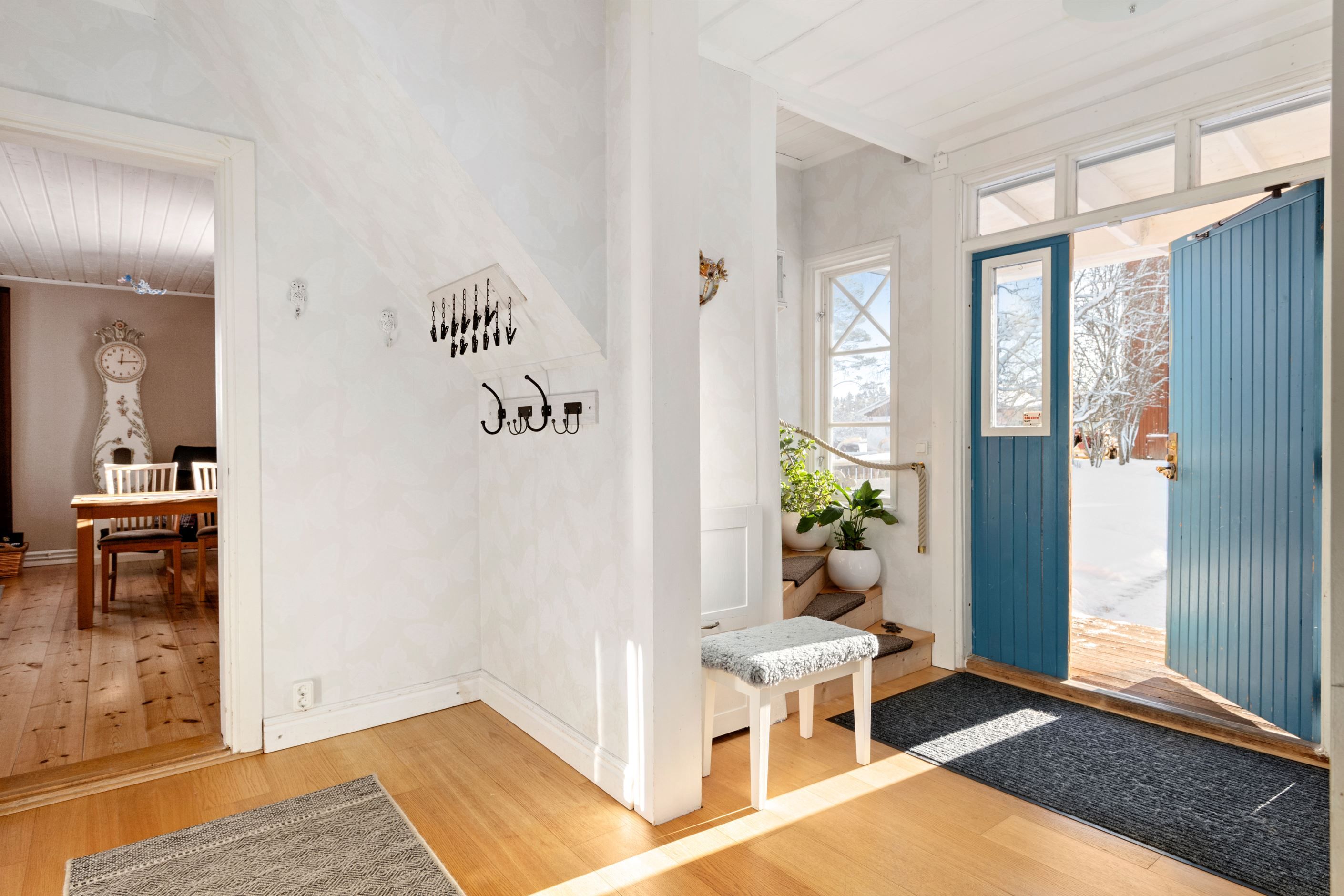 Rymlig hall med plats för kläder samt bra med förvaringsmöjligheter i dubbelgarderoben. Ekparkettgolv med vattenburen golvvärme, ljusa väggar och vitt trätak.