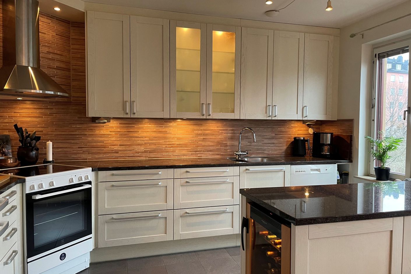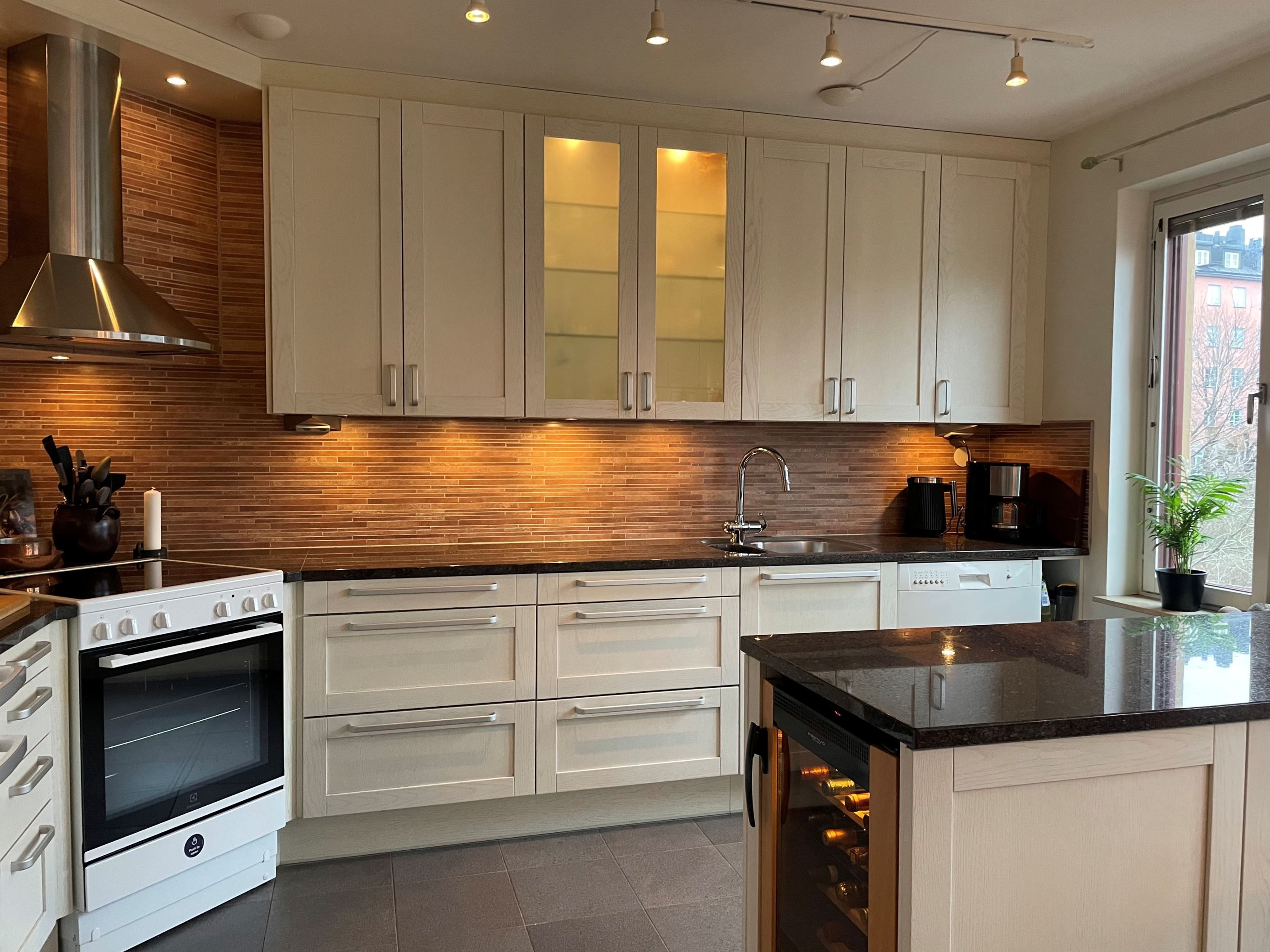 Bostaden erbjuder ett vackert ljusinsläpp i två väderstreck, kök med plats för ett stort middagsbord och ett luftigt vardagsrum. Tre bra sovrum samt fristående garderober för klädförvaring. En smart lösning för den riktigt stora familjen är att ett av sovrummen är avdelat till två rum. Det mindre badrummet är i bra storlek med duschplats, wc och handfat. Det större badrummet som också är helkaklat har ett rogivande jacuzzibadkar och tvättmaskin. Inom ytterdörren välkomnas du till en hall med gott om förvaringsutrymme i flera garderober. Bostaden har genomgående fina, målade ytskikt och snickerier och enhetliga trägolv där golvet i vardagsrummet är det ursprungliga medan övriga rum har försetts med parkettgolv senare. En mycket välskött förening med låg belåning om endast ca 1947 kr/kvm och eget garage med 330 platser där det finns lediga platser. Här bor du i ett tryggt och familjevänligt område med bilfria gårdar, naturskön grönska och kajen utanför porten. Ett unikt boende och chans som sällan kommer!