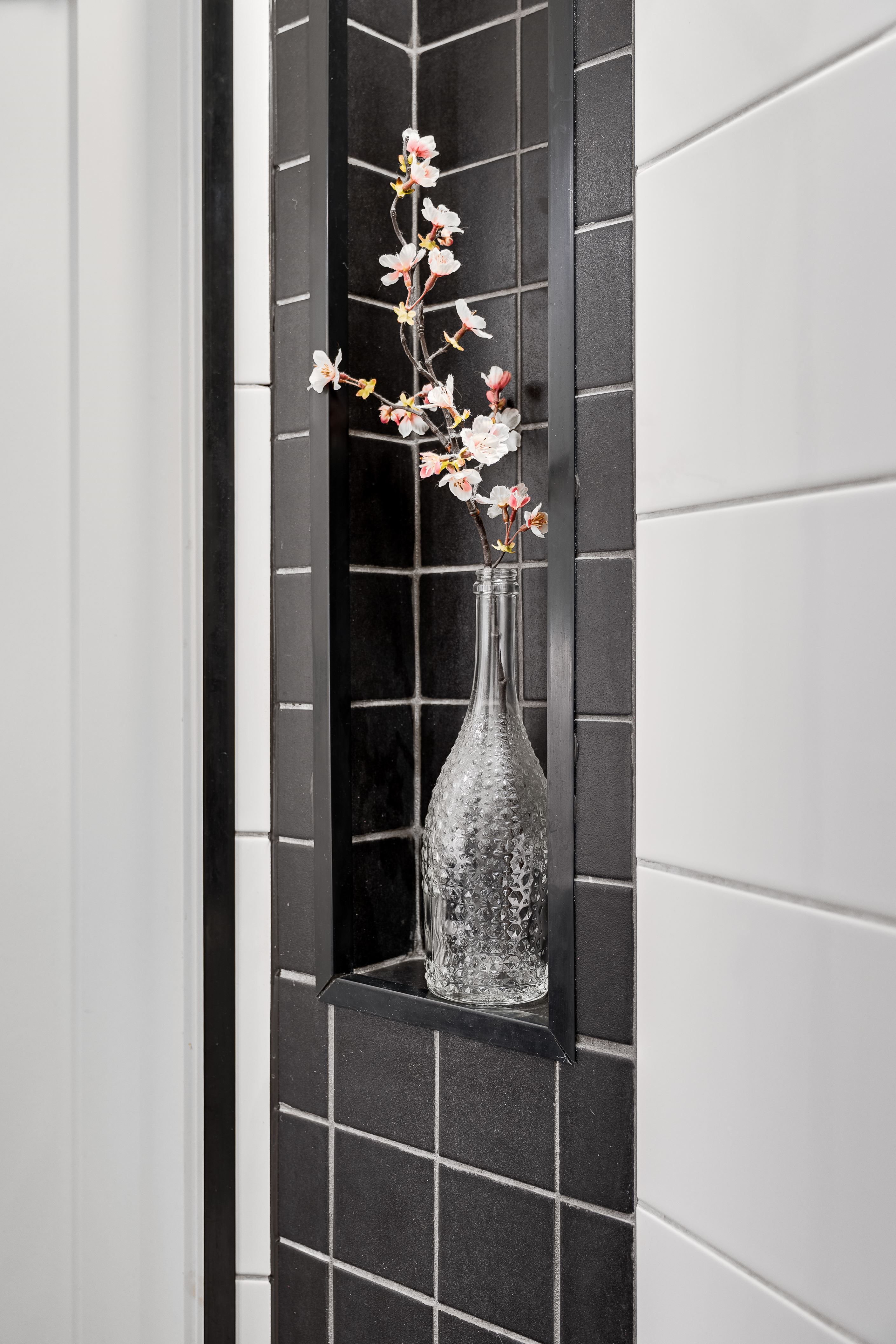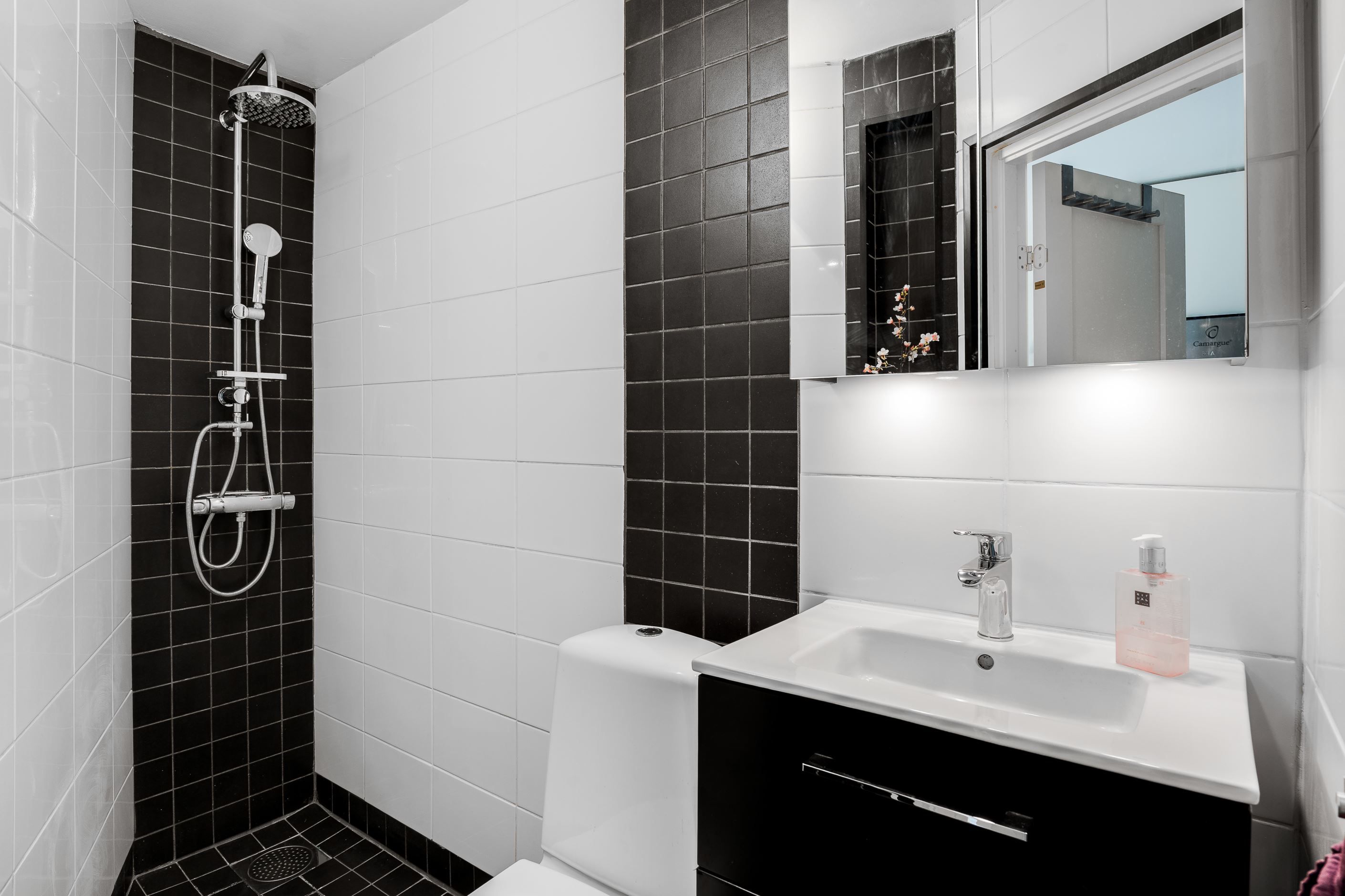 Bostaden erbjuder ett helkaklat badrum samt en praktisk köksvrå utrustad med spis, fläkt, diskmaskin och kyl/frys. Från bostaden har du fin utsikt mot Glan som ger ett lugnt och trevligt intryck.