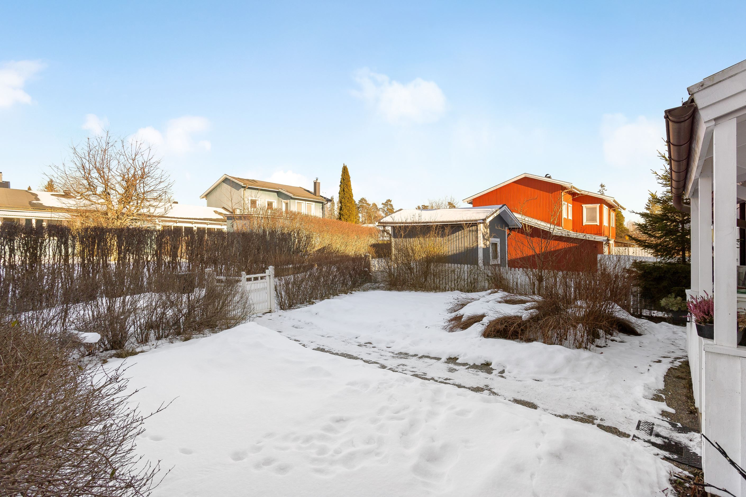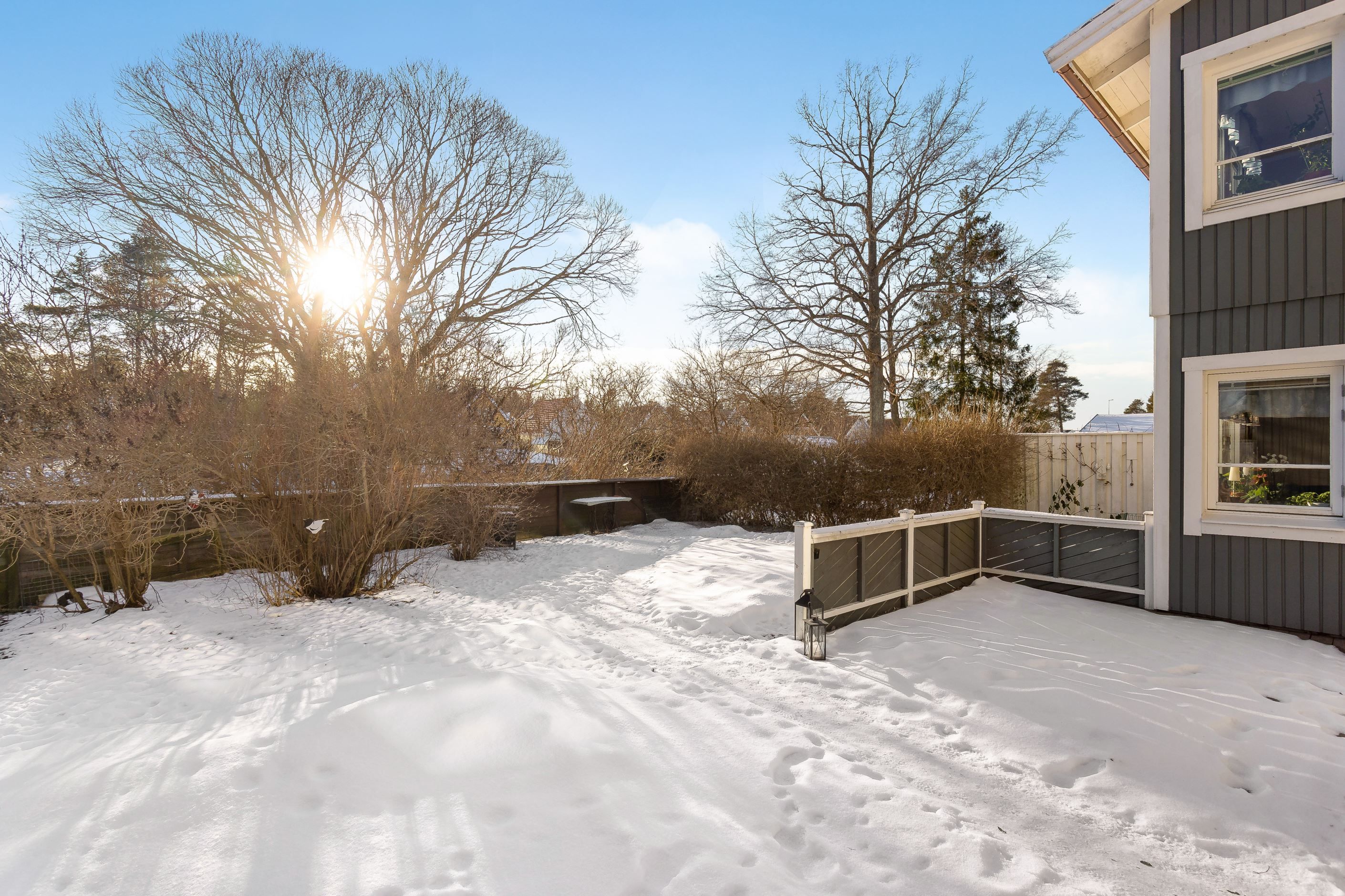 På baksidan väntar en härlig trädgård/uteplats i soldränkt sydvästläge där solen kan avnjutas från eftermiddag till kväll – en perfekt plats för grillkvällar, avkoppling och sociala stunder med familj och vänner. Närheten till garage gör vardagen smidig och bekväm, oavsett årstid.