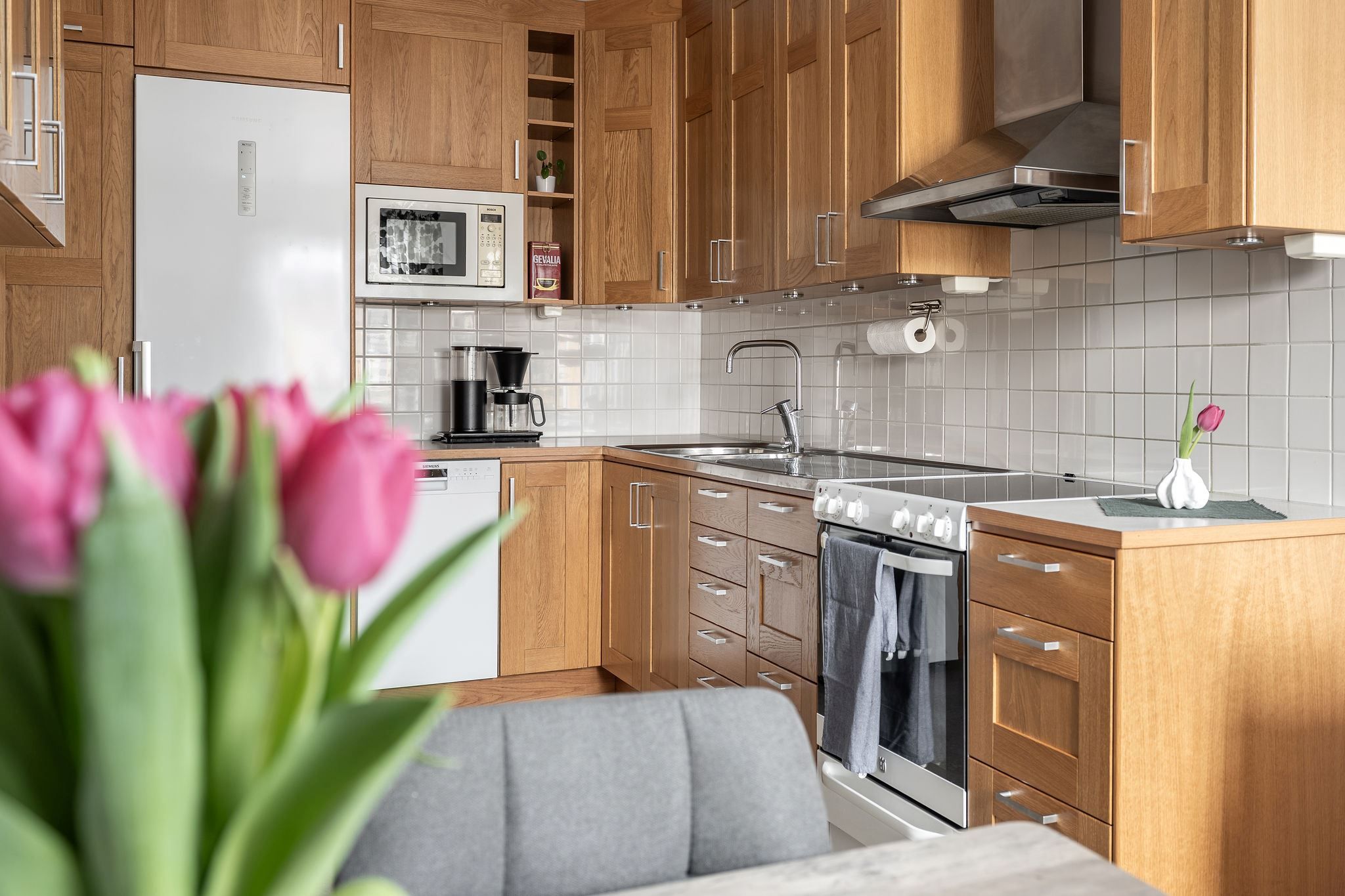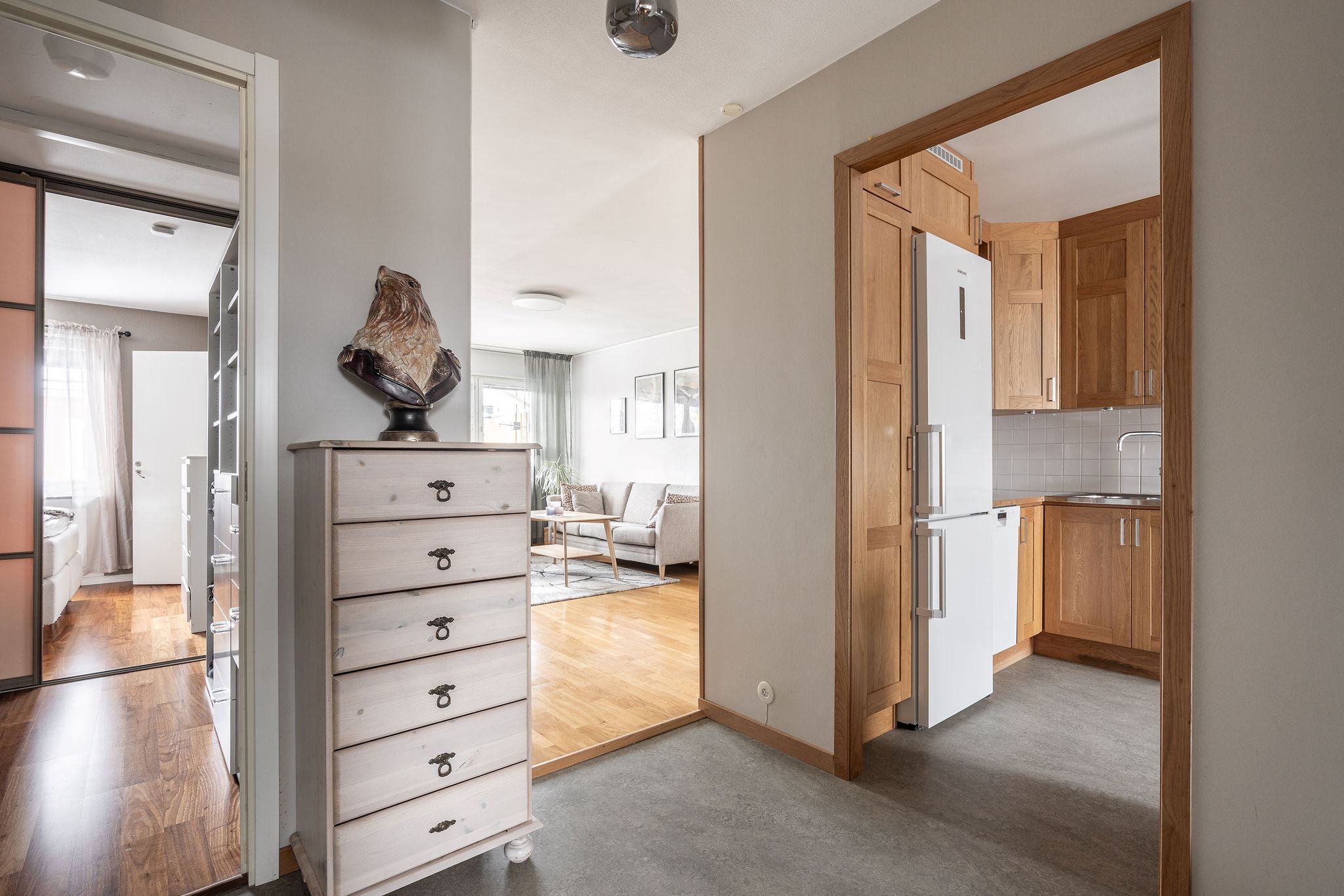 Köket är hemtrevligt och välutrustat med komplett maskinpark och generösa arbetsytor, här blir matlagningen både smidig och inspirerande. Intill finns en naturlig matplats som bjuder in till både vardagsmiddagar och längre helgfrukostar. Badrummet är ljust och rymligt, utrustat med tvättmaskin och torktumlare som gör vardagen ännu mer bekväm.